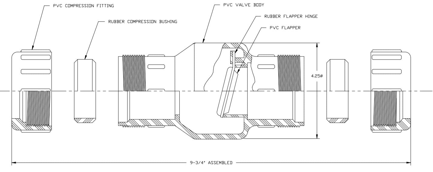 SEWAGE CHECK VALVE: 2-inch heavy duty sewage check valve; rated 125 PSI @ 72 degrees F, compression end type; no metallic parts; corrosion resistant