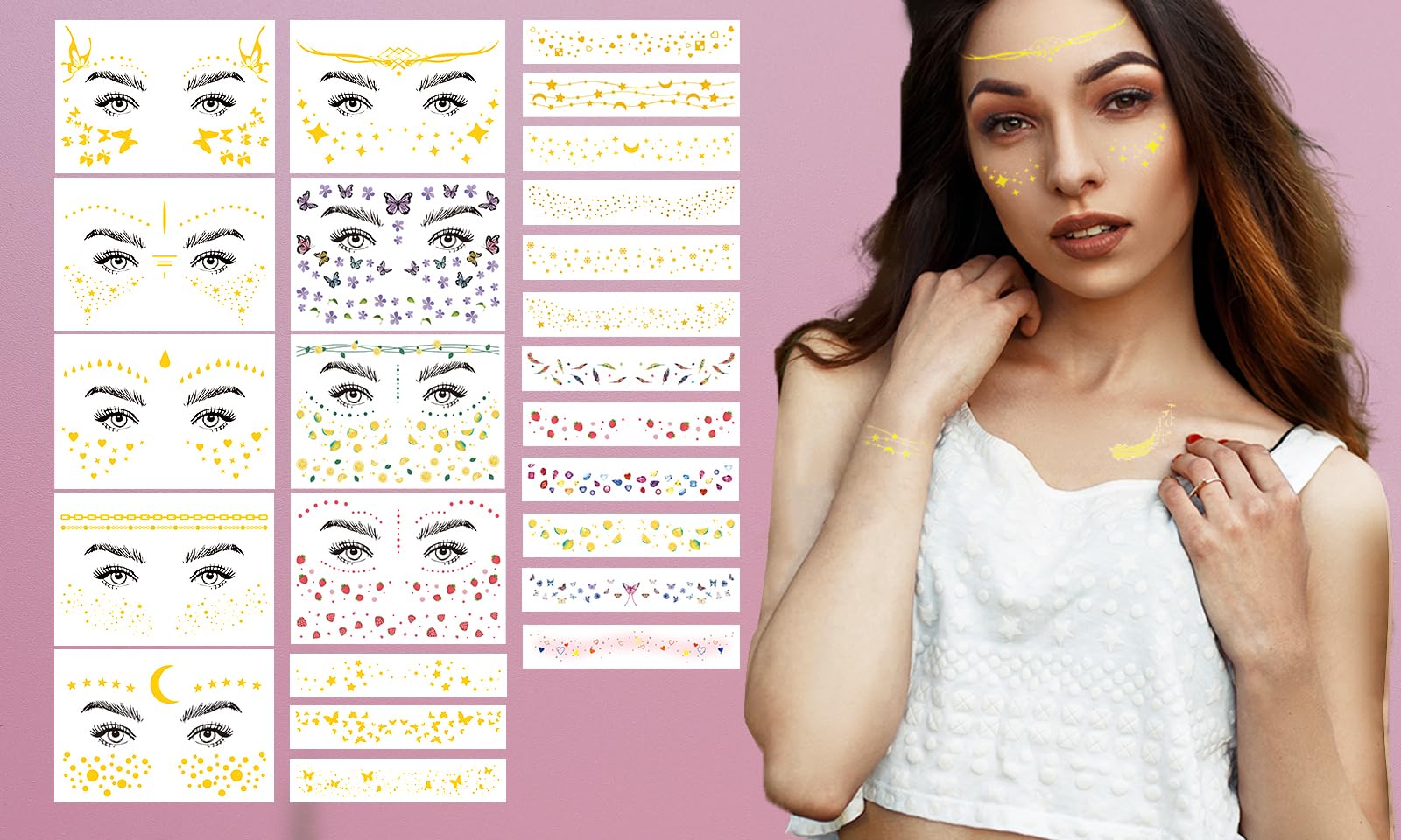 MATERIAL SAFE: Printed with high quality vegetable-based ink, our gold face gems face tattoos sticker is safe and non-toxic to use.