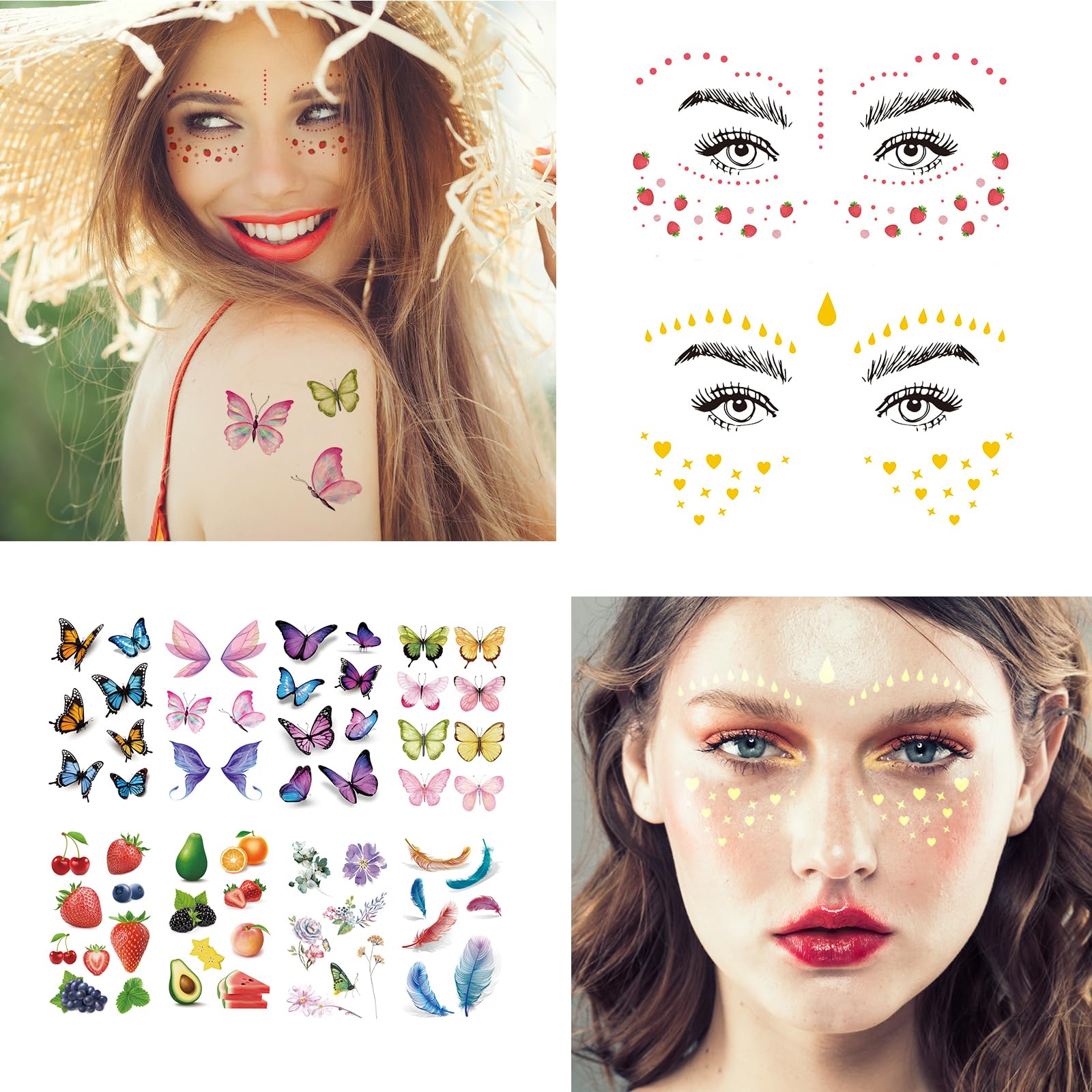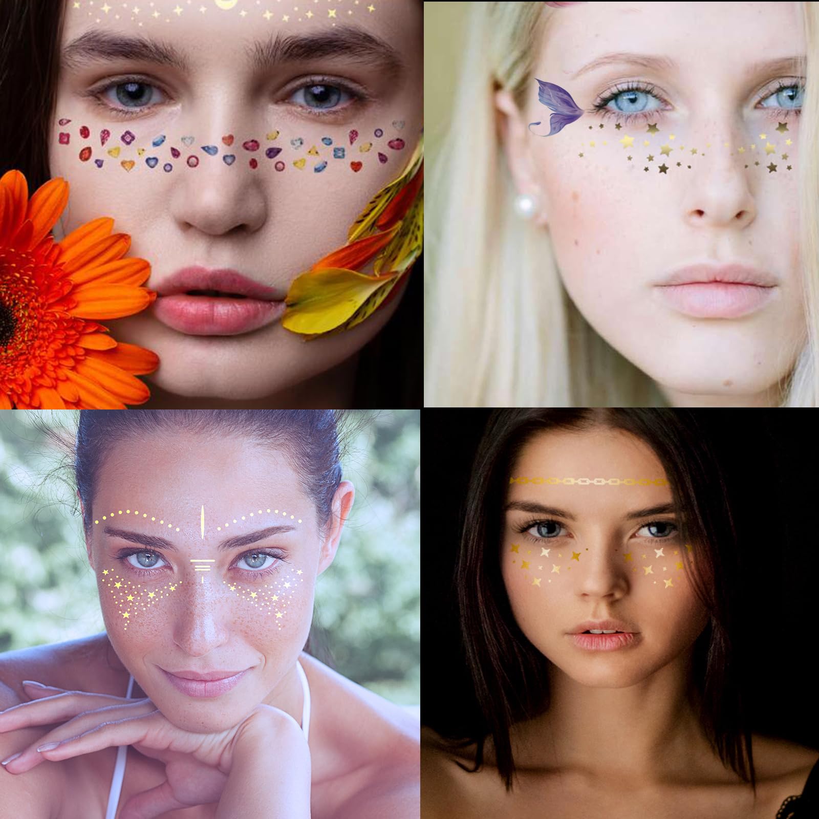 TOTAL 54 SHEETS FACE TATTOOS: Our waterproof face Halloween temporary tattoos include 9 sheets glitter freckles face metallic temporary tattoos, size is 5.9x4.1 inch. Additional 45 sheets glitter freckle face tattoo stickers for women, festival face jewels face gems stickers with different shapes and size. sheets Plenty of different styles Halloween face tattoos for Halloween cosplay and parties. Wide usage to apply on festival euphoria makeup.