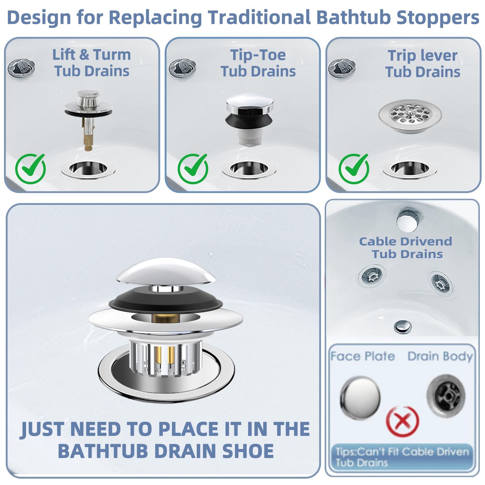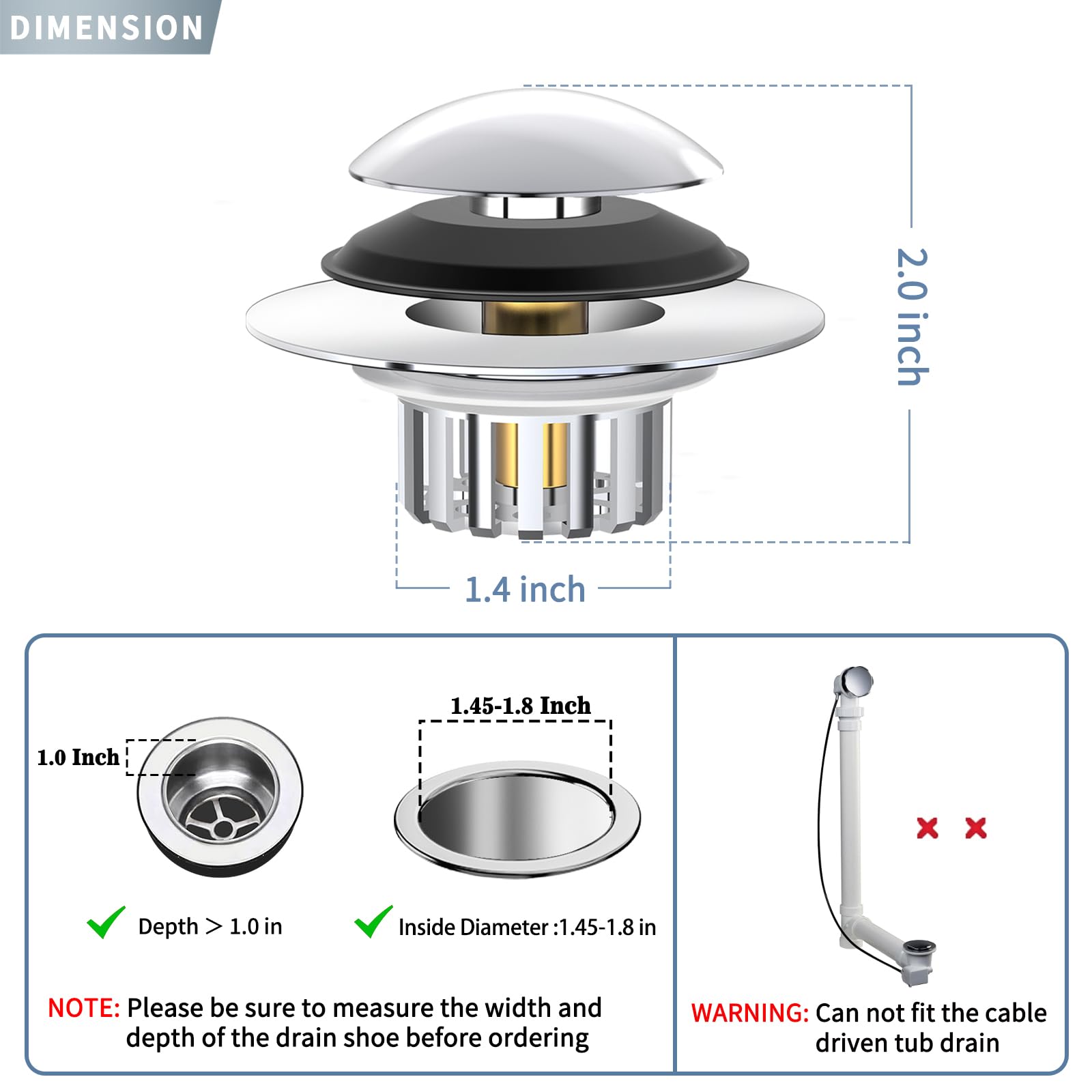 【Compatibility】 The bathtub stopper can be replaced 99% lift and turn, tip toe and trip lever bathtub drains and it's available when the inner diameter of the drain opening is between 1.45-1.8 inches and the depth is greater than 1.0 inches. Please note that the tub stopper is not fit the cable driven tub drain and be sure to measure the inside diameter and depth before purchasing.