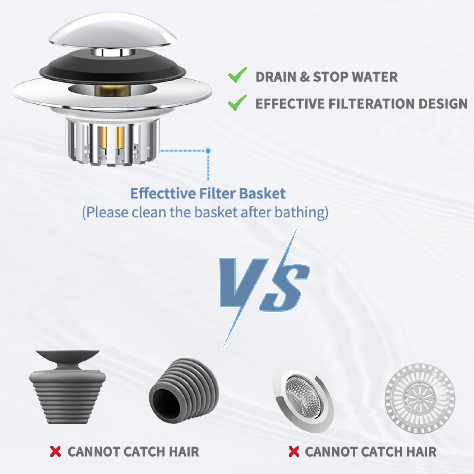 【Effective Bigger Filter Basket】 Compared to most ordinary drain stoppers, our bathtub drain stopper has a bigger filter basket which can catch the hair more effectively. Warm tip: To prevent slow draining and clogging, please clean the filter basket after bathing every time.