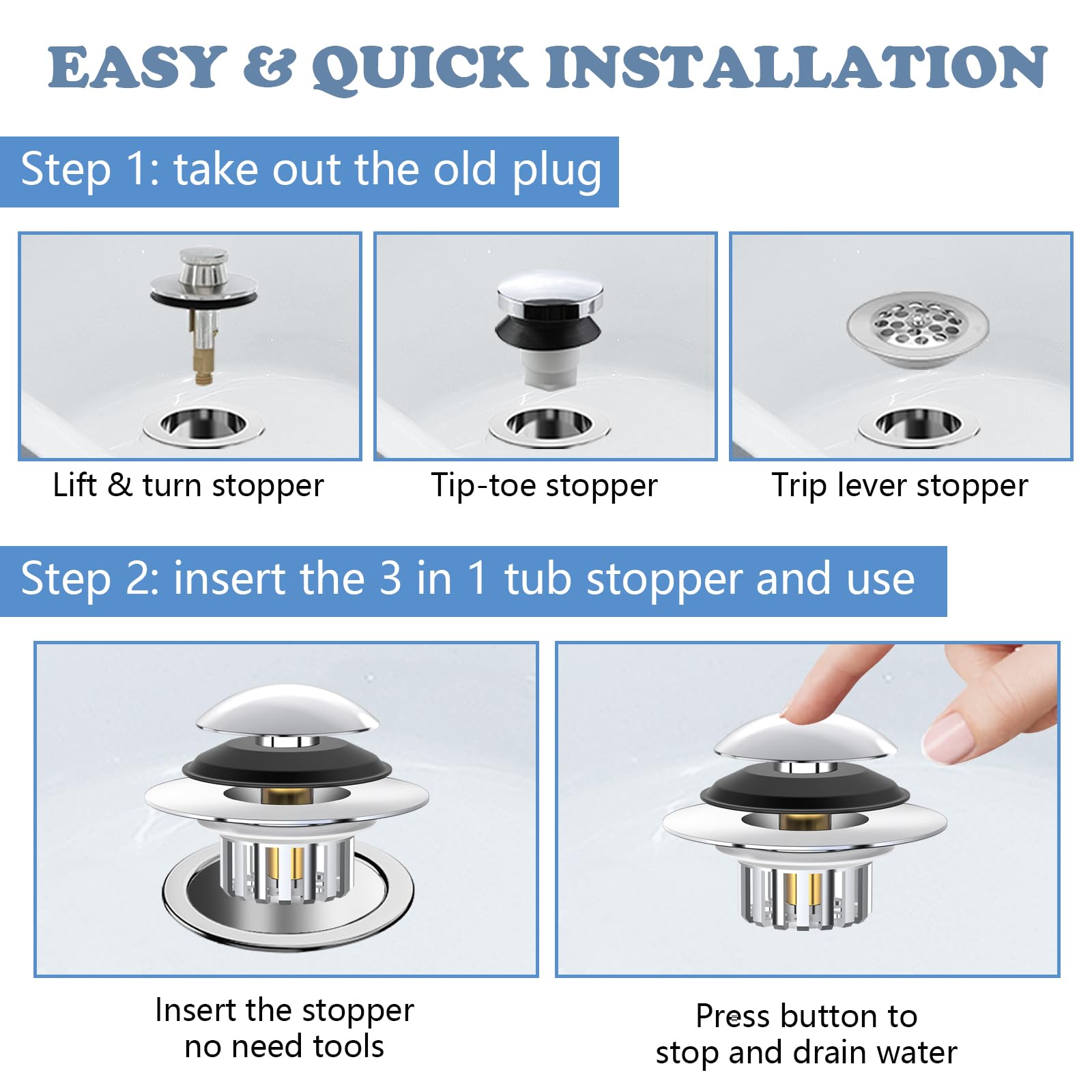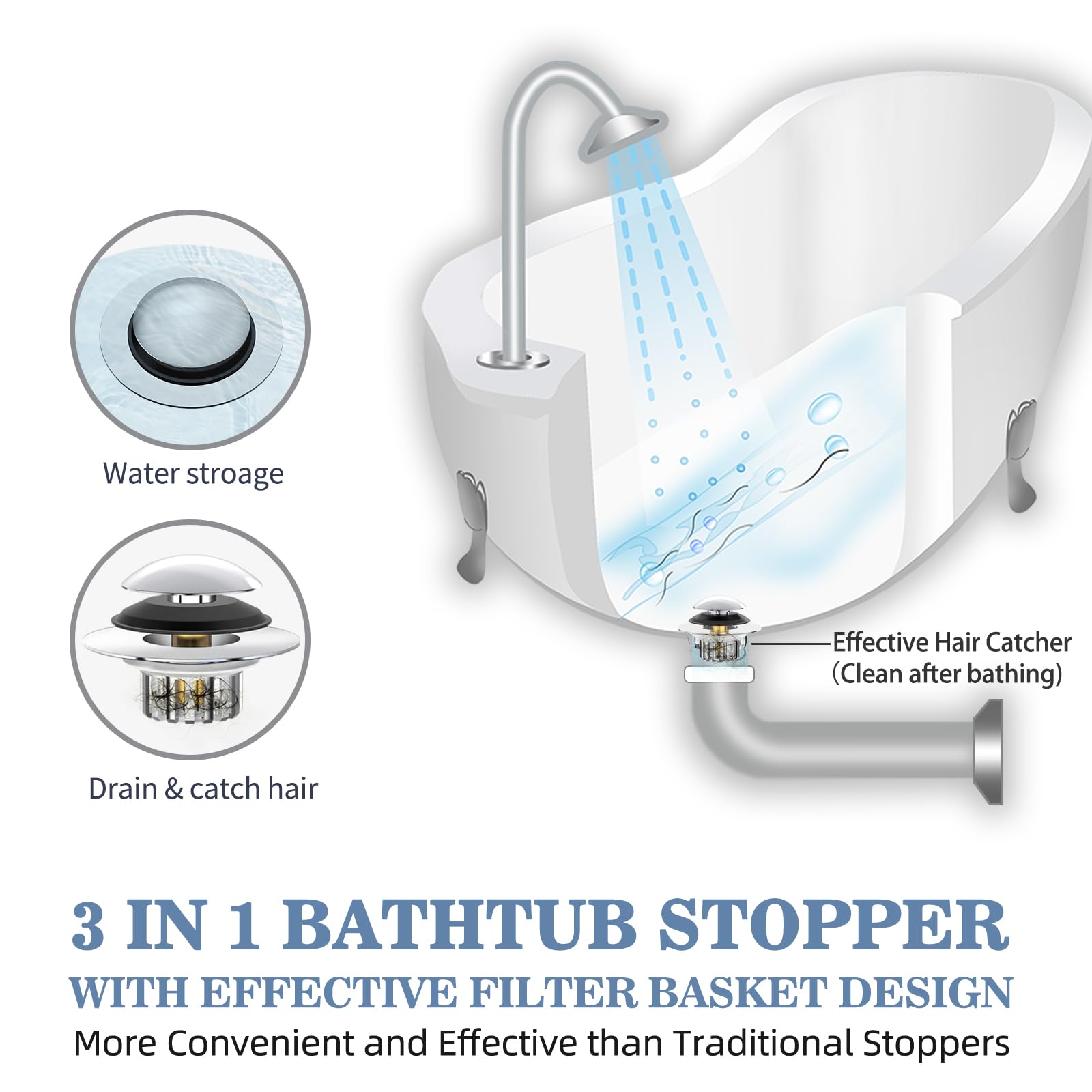 【Easy to Install & Clean】 Getting rid of the costly plumber bills. No tools are required, simply insert into the bathtub drain hole to complete installation. With the design of effective filter basket, the stopper is very easy to clean, simply take out the stopper to clean the below filter basket. To prevent slow draining and clogging, please clean the filter basket after bathing every time.