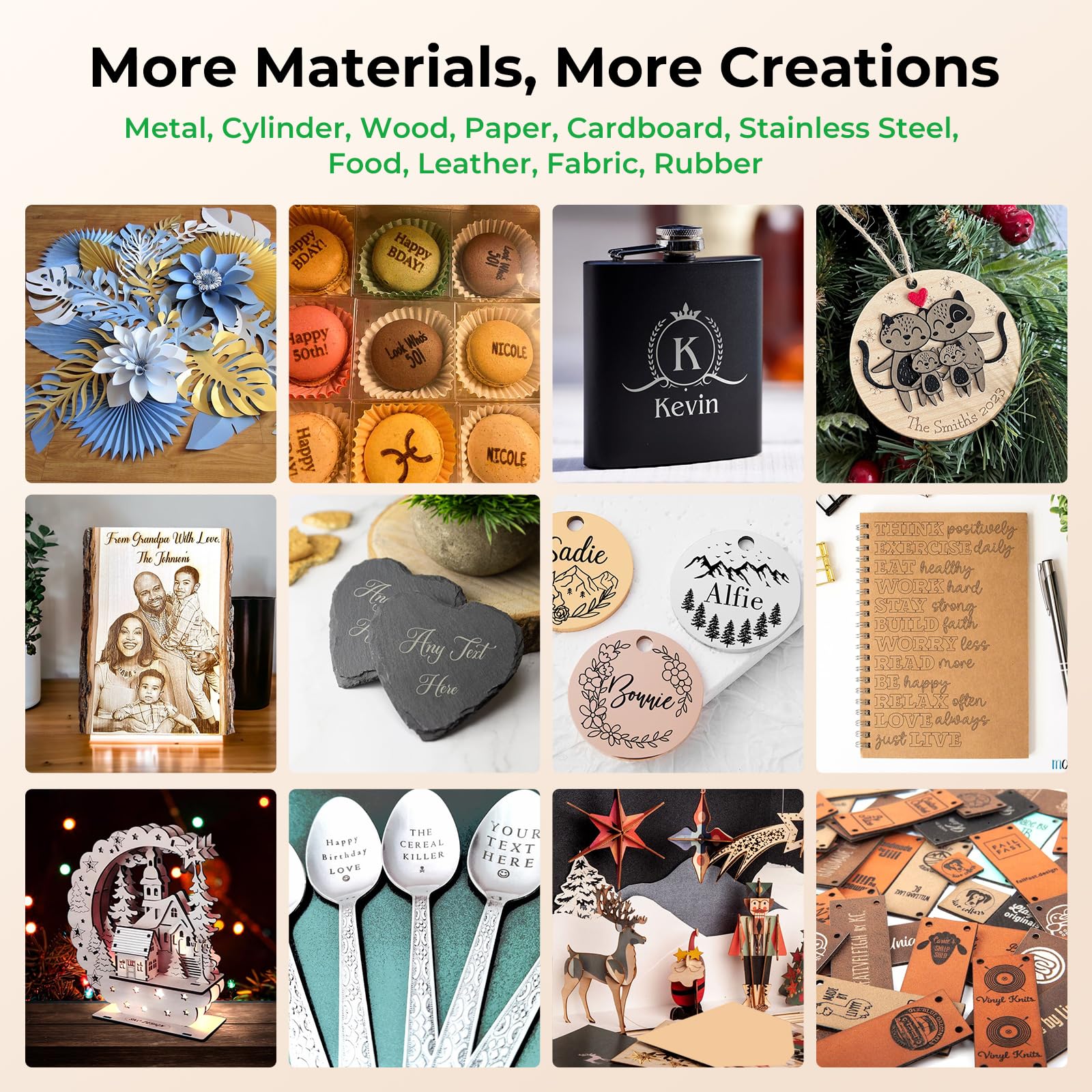 【Flexible Large-Scale Engraving】The laser engraver machine offers a larger working area of 400x415mm for you to engrave and cut larger materials in one go. And you can upgraded with rotary roller(buy extra) and raisers(buy extra) for customizing higher and cylindrical objects.