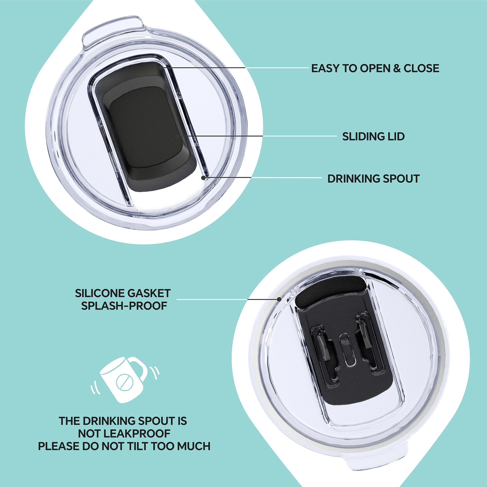 SPILL-PROOF LID - Designed by a professional team of designers, our slider lids facilitate sipping with just a gentle touch. They effectively prevent splashing and spilling; however, it is advisable to avoid turning them upside down as they are not entirely leak-proof.