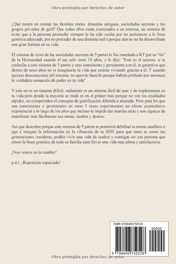 ¿Qué tienen en común las familias reales, dinastías antiguas, sociedades secretas y los grupos privados de golf? Que todos ellos están conectados a un sistema, un sistema de éxito que a la persona promedio siempre le ha sido oculta por no pertenecer a la línea genética adecuada, por no proceder de una dinastía real o porque aún no no ha desarrollado una gran fortuna en su vida. El sistema de éxito de las sociedades secretas de 5 partes le fue enseñada a KT por su "tío" de la Hermandad cuando él tan solo tenía 18 años, y le dijo: "Este es el secreto, si te enchufas a este sistema de 5 partes y eres consistente y persistente con él, te garantizo que dentro de unos años no te imaginarás la vida que estarás viviendo gracias a él. Y cuando quieras desconectarte del sistema, no querrás hacerlo porque habrás probado por entonces la verdadera sensación de poder en tu vida" Y este no es un sistema difícil, realmente es un sistema fácil de usar y de implementar en tu vida pero donde la mayoría se rinde es en el primer mes porque no ven los resultados rápidos, no comprenden el concepto de gratificación diferida o atrasada. Pero para los que son consistentes y persistentes en estas 5 áreas experimentan un efecto acumulativo exponencial a lo largo de los años que incluso le impide dar marcha atrás y son capaces de manifestar mas fácilmente sus metas, sueños y deseos. Así que descubre porque este sistema de 5 partes te permitirá debilitar tu mente analítica o ego e integrar la información en la vibración de tu ADN para que tanto tu como tus generaciones venideras, podáis vivir una vida de sueños y consigas ser esa persona que altero la línea genética de toda su familia para llevar una vida mas plena y satisfactoria. ¡Nos vemos en la cumbre! p.d.t: ¡Repetición espaciada!