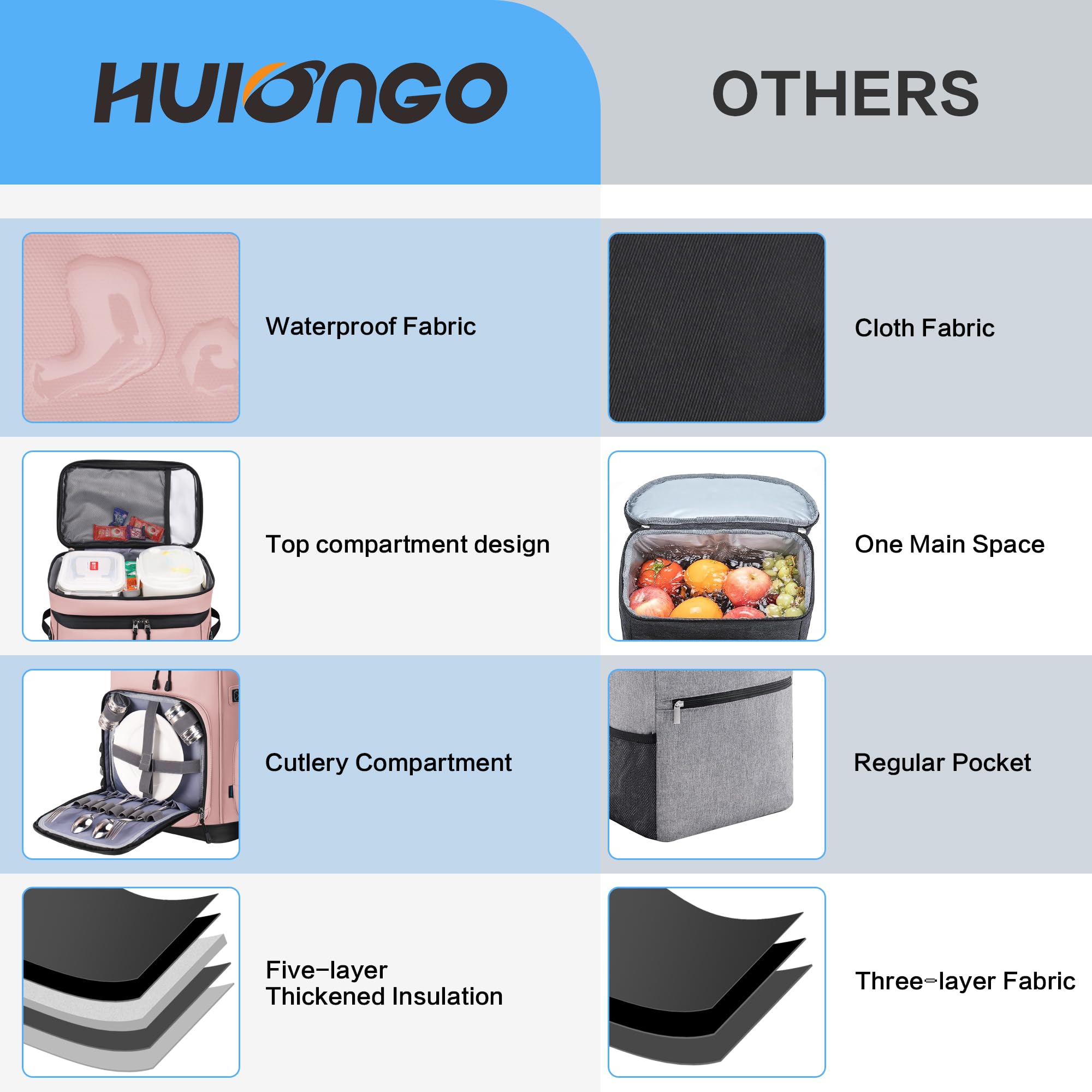 3.Organized Storage with Multiple Compartments: The Hulongo backpack offers two insulated compartments for beverages and food, along with a spacious front pocket and two side pockets for snacks and accessories. This thoughtful design keeps your items organized and accessible, with the added convenience of a built-in bottle opener.