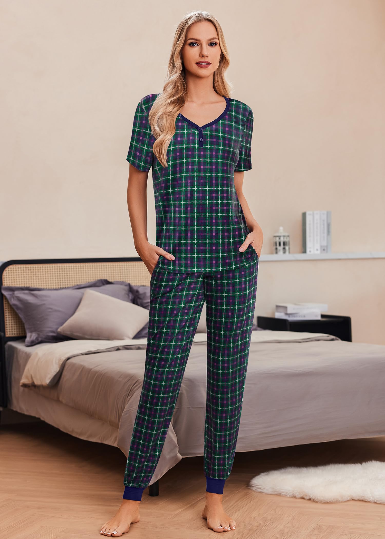 Short Sleeve Tops: The sleepwear pj features with v-neck and button tops. Simple pullover styling for easy fit. Stylish and elegant ladies sleepwear night set