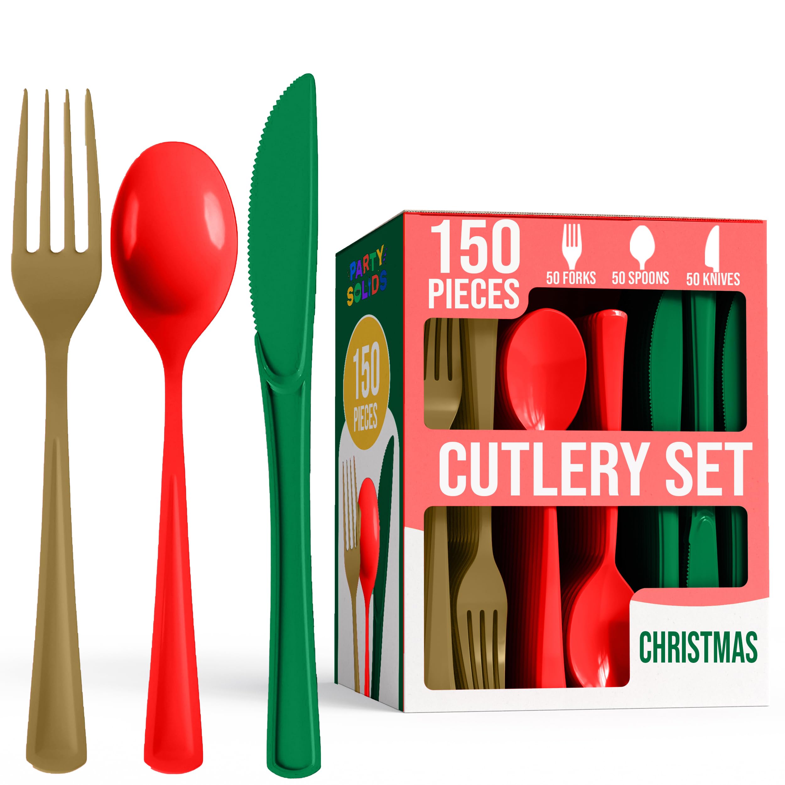 Includes: Each plastic silverware set contains 50 green knives, 50 gold forks & 50 red spoons each measuring 7.5 inches, making it the ideal purchase for your upcoming party needs. A super convenient plastic cutlery set with all your plastic silverware in it. Offering multiple different color options, they are sure to match your decor.