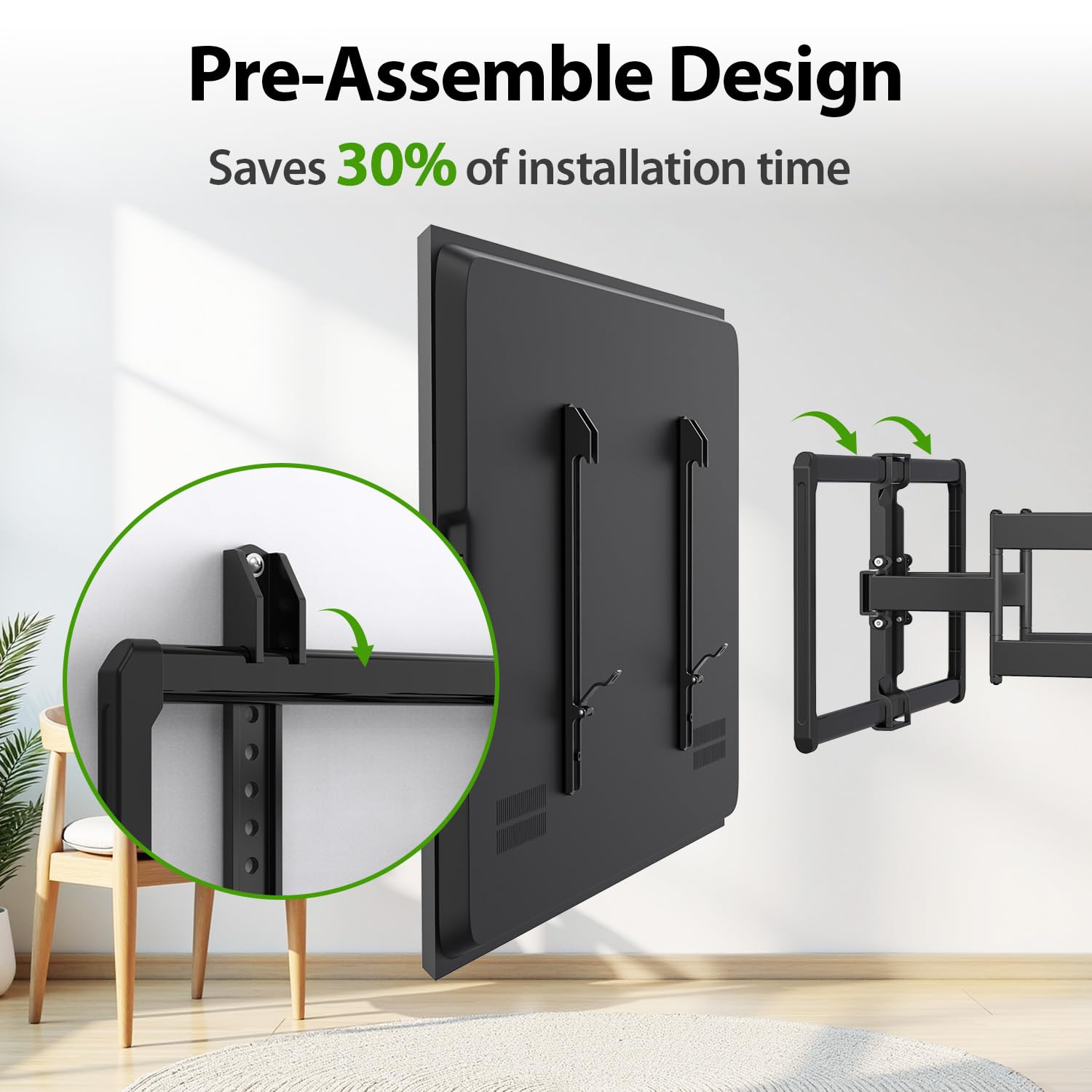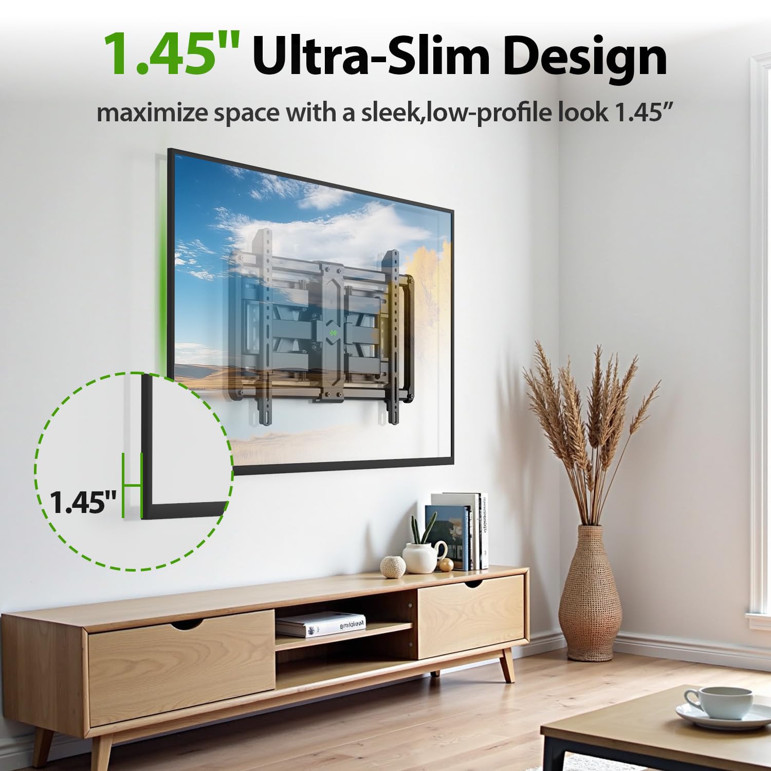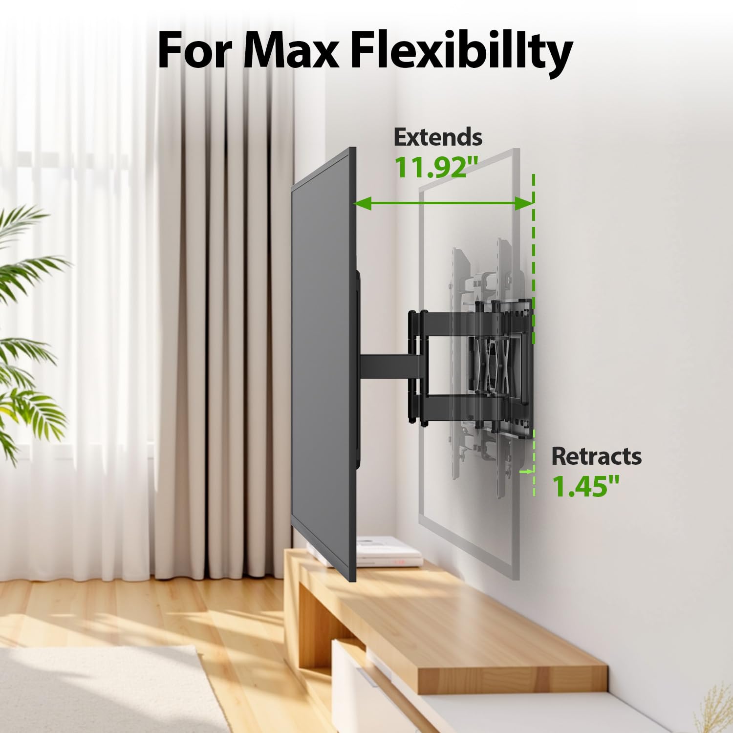 Space Saving: Super Slim Television Mount 65inch places TV just 1.45'' from the wall when fully retracted, which narrows the gap between TV and the wall and greatly saves space. In addition, Articulating Mount can extend up to 11.92'' for easy cable access and closer viewing angle
