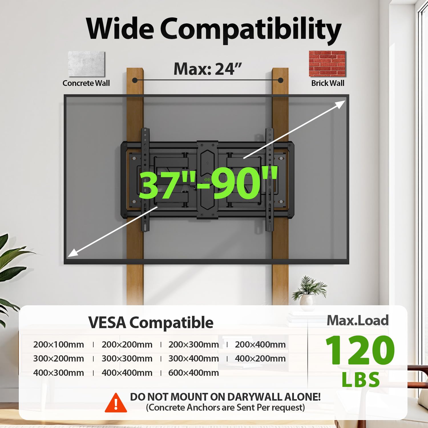 Wide Compatibility: Ultra Slim TV Wall Mount 85inch is suitable for most 37" - 90" flat or curved TVs with VESA patterns ranging from 200 x 100mm to 600 x 400mm. Our Low Profile 86inch Wall Bracket is compatible with concrete and brick walls, wood studs up to 24 inches. Please check the VESA, TV weight, wood studs spacing before purchase