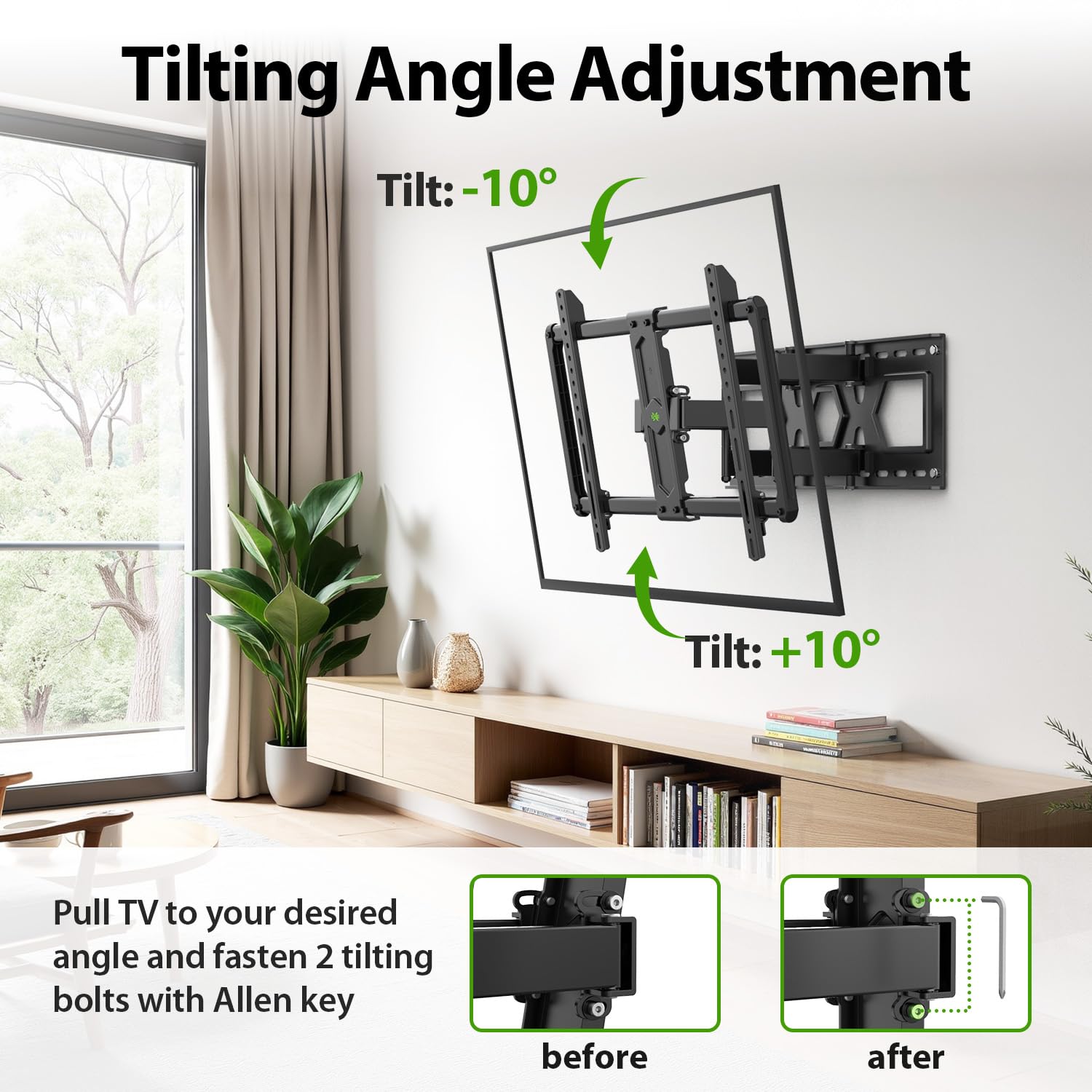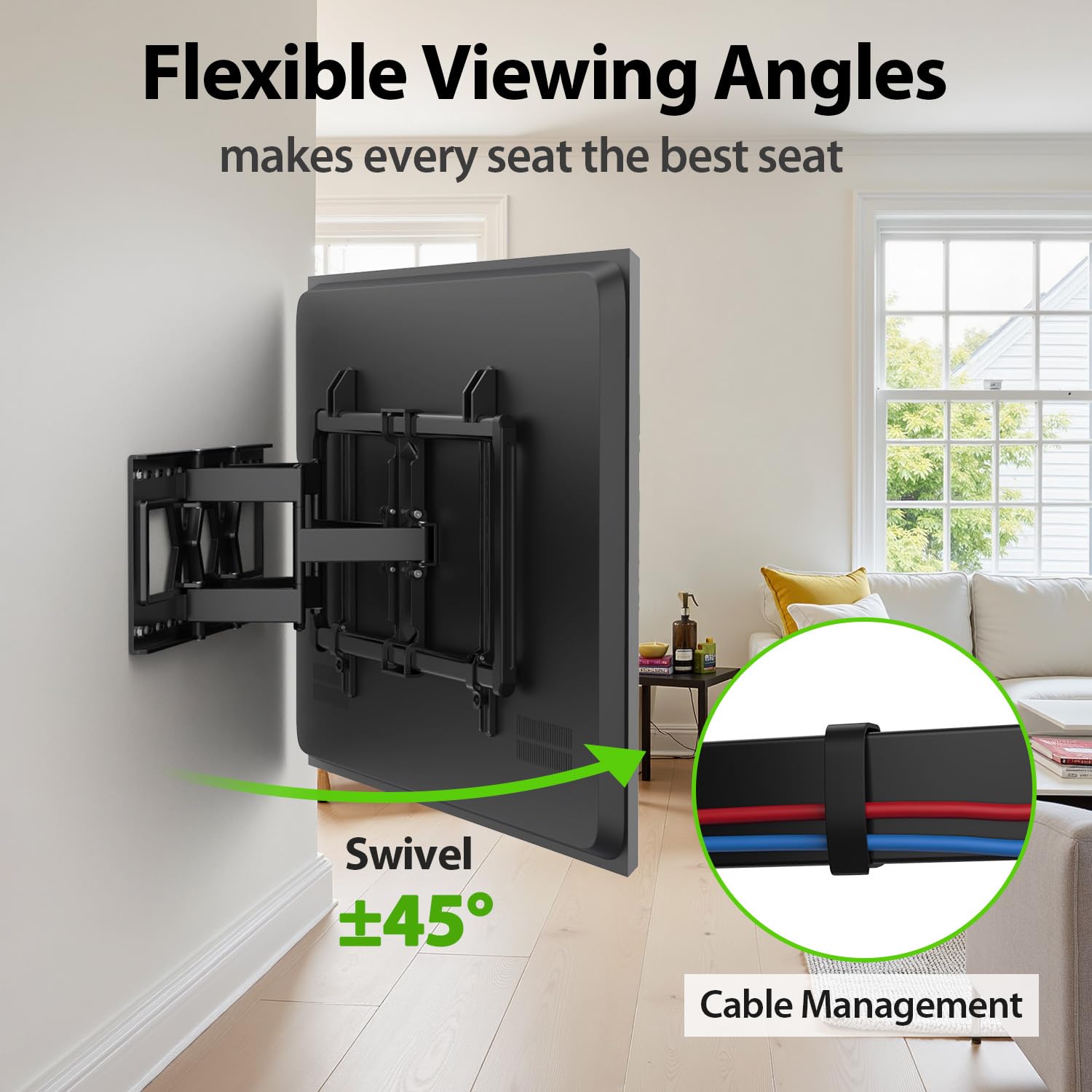 Upgrade Viewing Experience: This full motion Slim TV Mount 75inch with double articulating arms includes +10°/-10° tilt, ±45° swivel (maximum swivel angle depends on your TV), multi functional adjustment allows the TV to move flexibly, reduce reflections, and upgrade your viewing experience