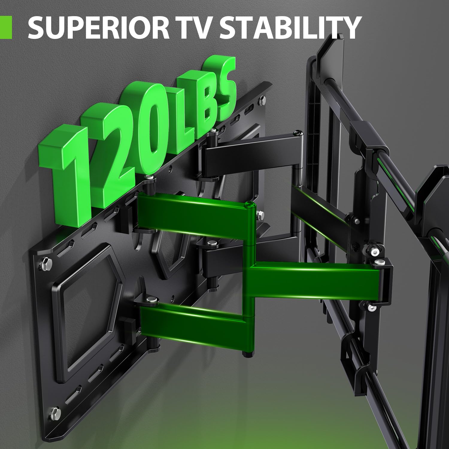 Secure TV MOUNT: Our TV Wall Mount ensures reliable stability with its 6 articulating arms for smooth tilt and swivel adjustment. Built from heavy-duty steel to support up to 120lbs, it features a durable faceplate and secure locking screws. Rigorously tested at 4x its maximum load, this low-profile mount combines robust construction with flexible movement for unparalleled safety.