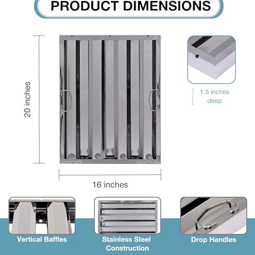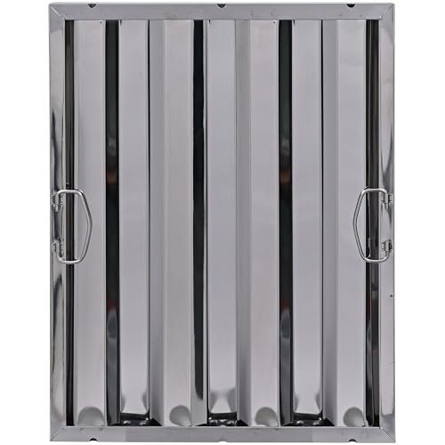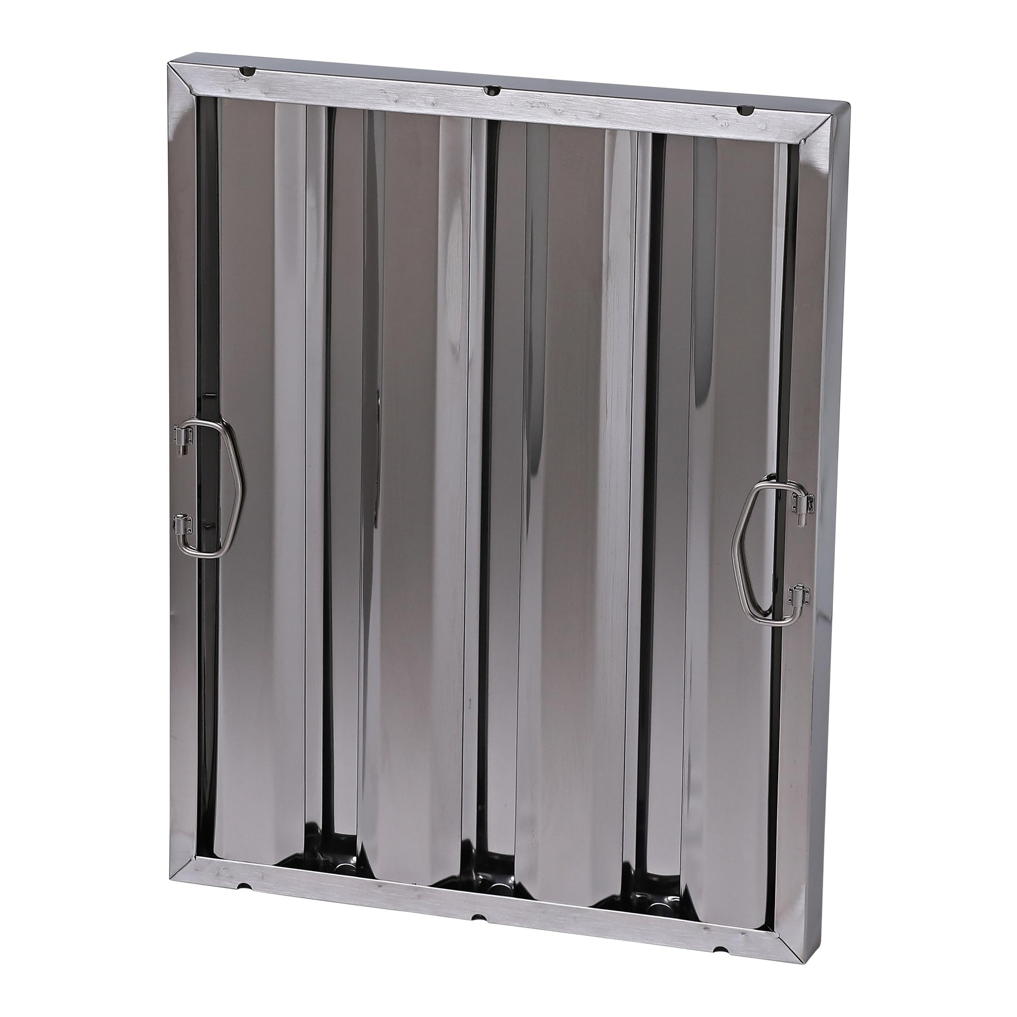 The 16" x 20" Stainless Steel Hood Filter (1.5" thick) is designed to provide superior grease filtration and fire prevention in commercial kitchens. Made from durable type 430 stainless steel, this filter resists rust and corrosion, ensuring it stands up to the rigors of a busy kitchen. Its smooth baffle design efficiently captures grease, directing it into a drainage system to prevent buildup and reduce fire risks. This filter is dishwasher safe and can also be pressure washed, making it easy to remove even the toughest grease residue. The sturdy drop handles allow for quick installation and removal, ensuring seamless maintenance in high-traffic kitchens. Perfect for restaurants, cafés, and other foodservice operations, this hood filter helps keep your ventilation system clean, efficient, and safe.