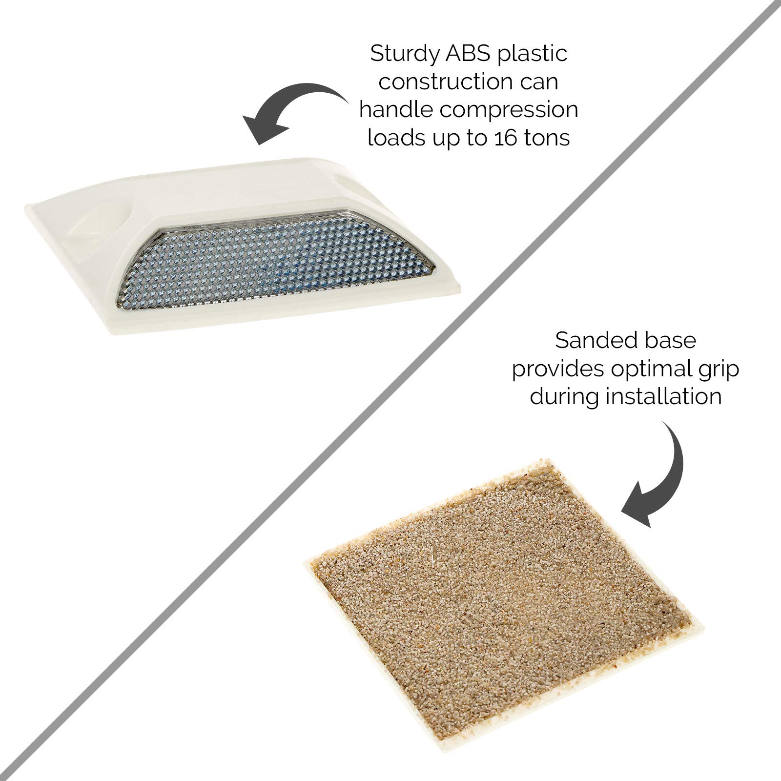 This multi of Commercial Reflective Road Markers by Reusable Revolution is your go to solution for improperly marked roads or driveways. When you're travelling at night on a dark road the pavement seems to get lost. Placing these road studs on the edges and center of the pavement can clearly mark where lanes begin and end. A sanded wide base provides a large surface area to apply adhesive to during installation and prevents sinking during the summer. Its Durable ABS plastic construction can handle loads up to 16 tons with ease making them ideal for busy highways. Quickly mark your road, parking lot, or driveway with this value pack of 10 roadside markers. Each stud measures 4" x 4" x 0.75".