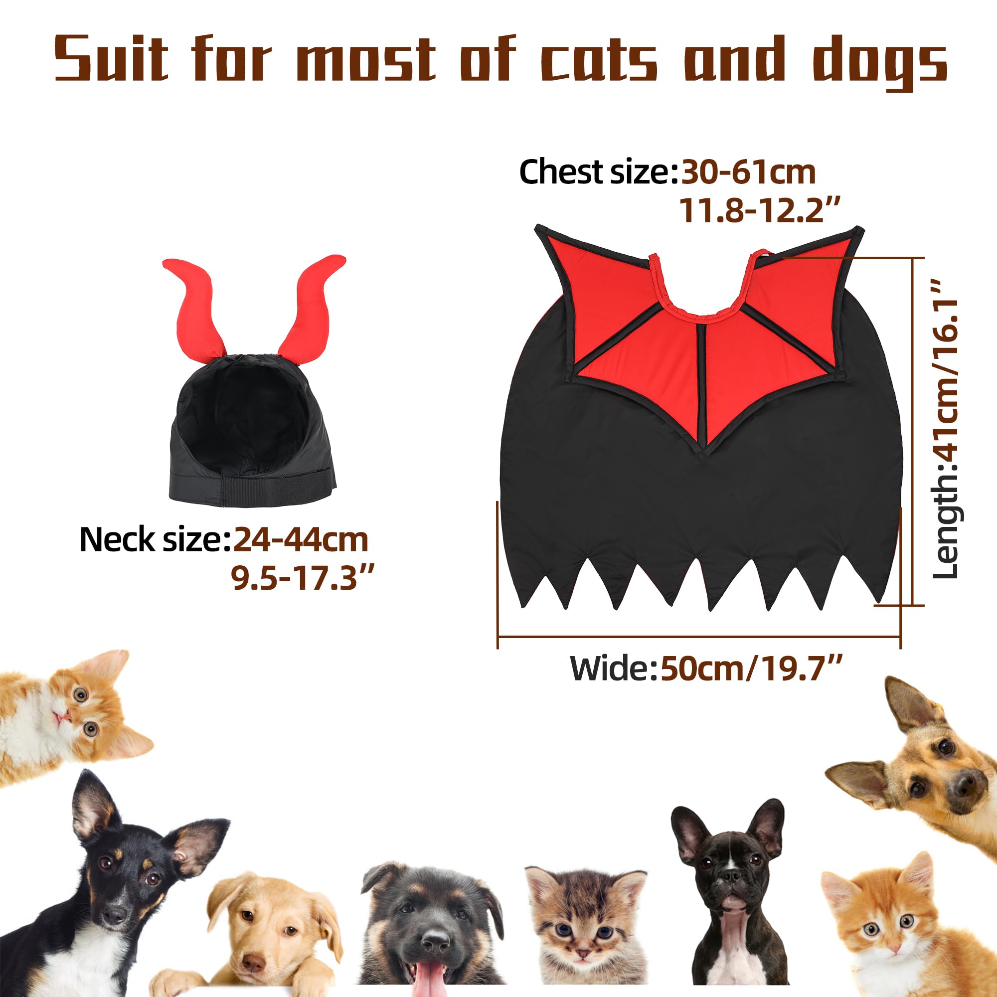 【 Adjustable Size 】This dog costumes for medium dogs has a maximum back length of 16.1 inches and uses adjustable webbing, suitable for small and medium dogs. The neck circumference of devil horses is 9.5-17.3 inches, which is very suitable for greyhounds and cat halloween costumes.