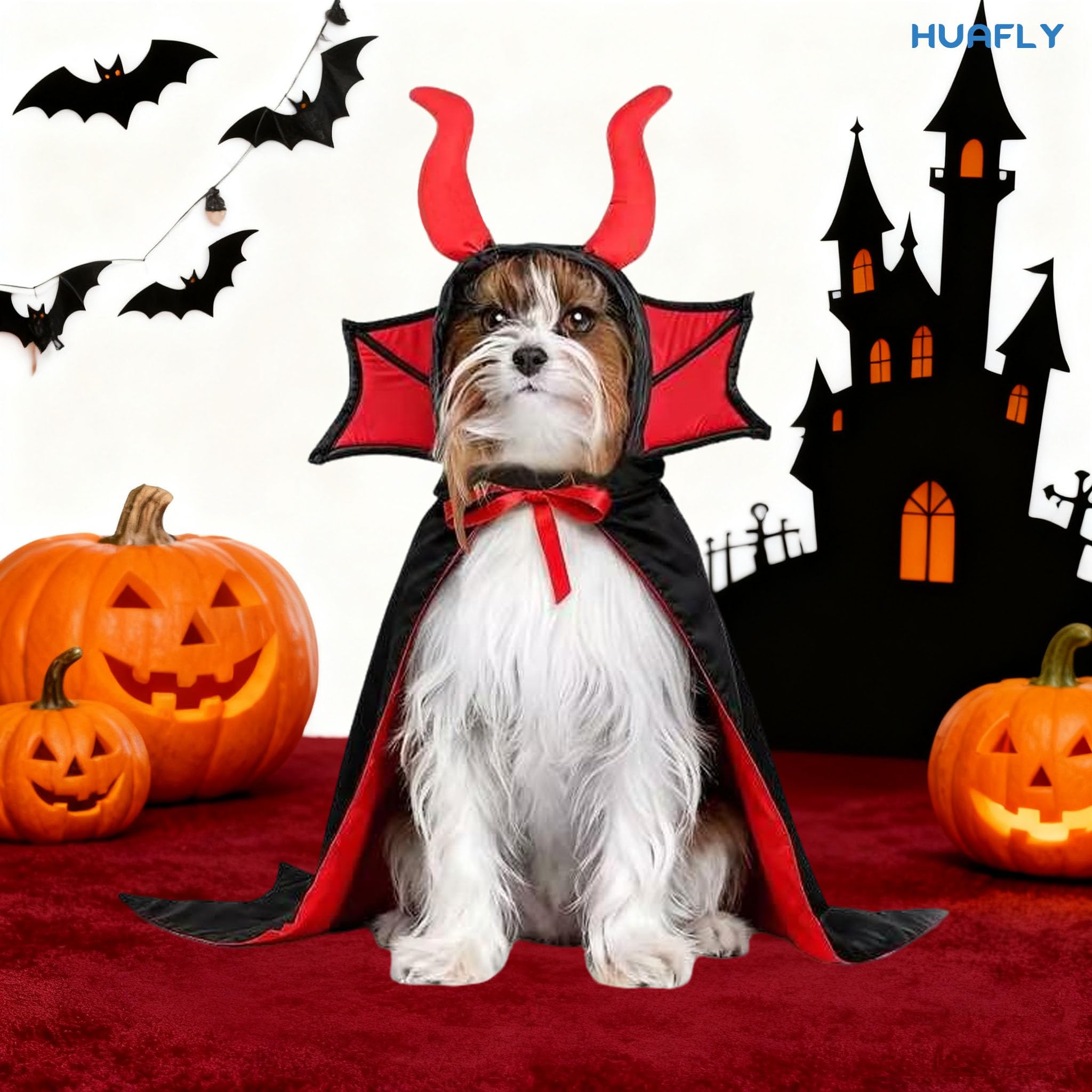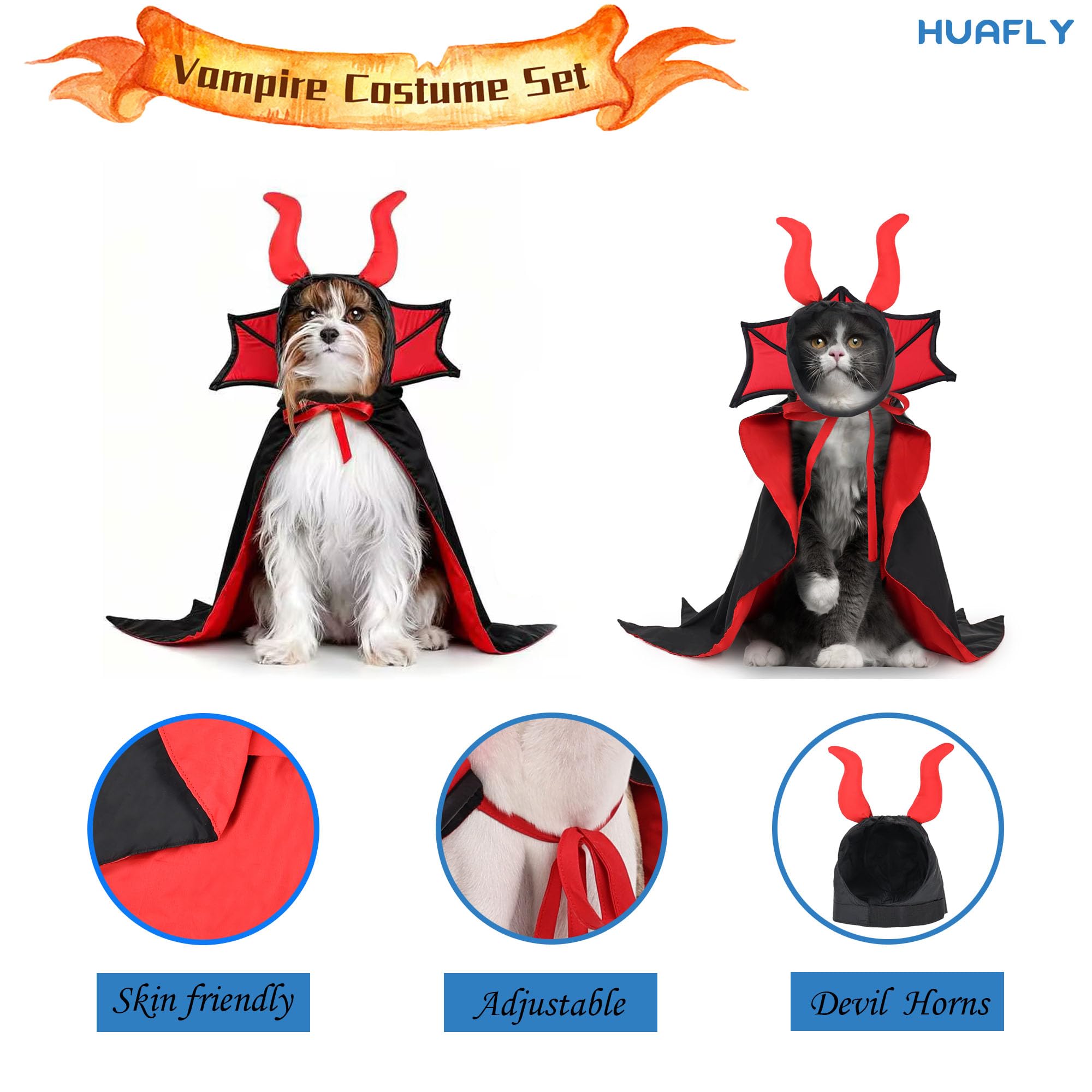 【Easy to Wear】Simply fasten the strap and you can easily put vampire costume on.The dog cape is designed with high elasticity cloak fixing straps on both sides, which can firmly fix the cloak on the dog's body.With the excessively long part can be cut off with scissors.