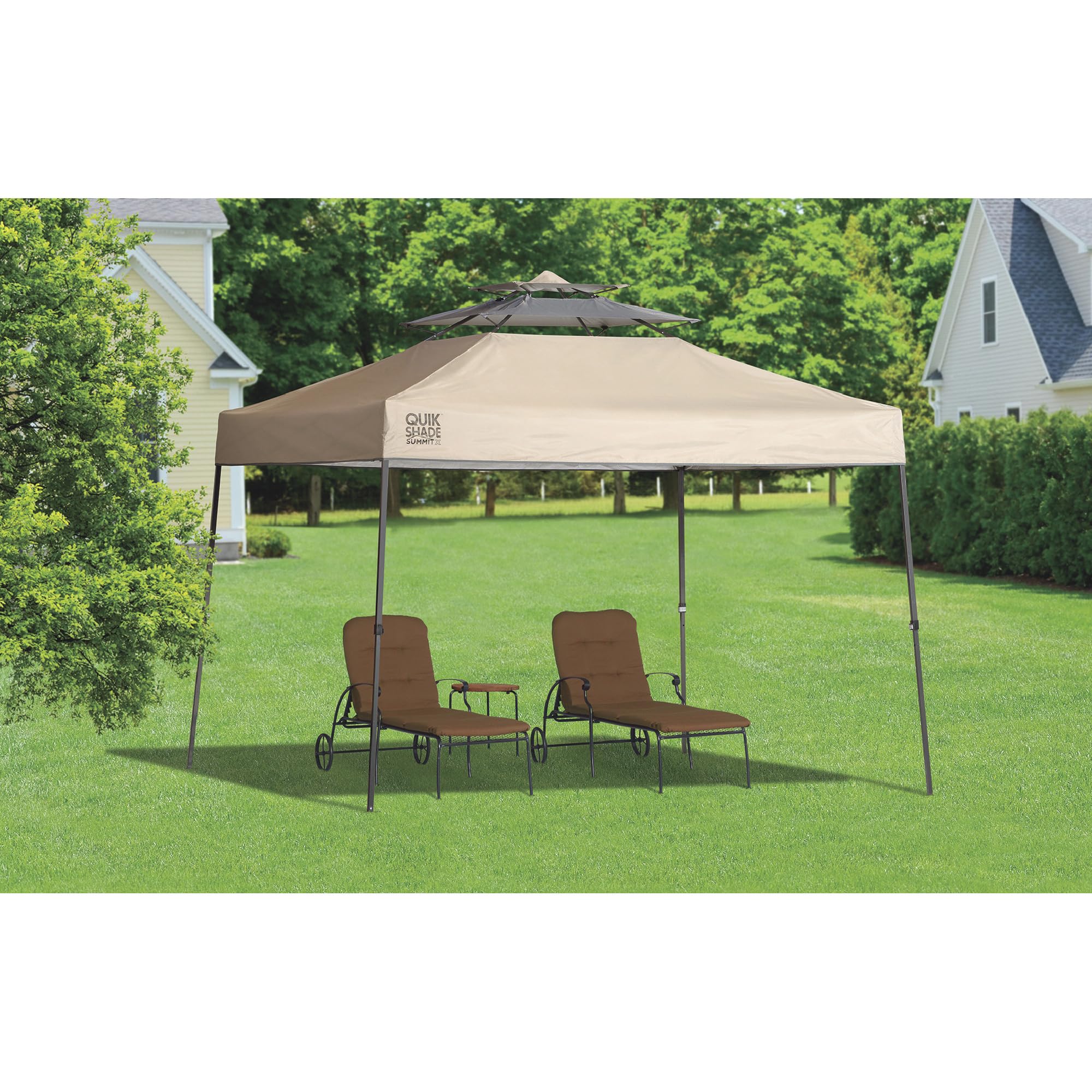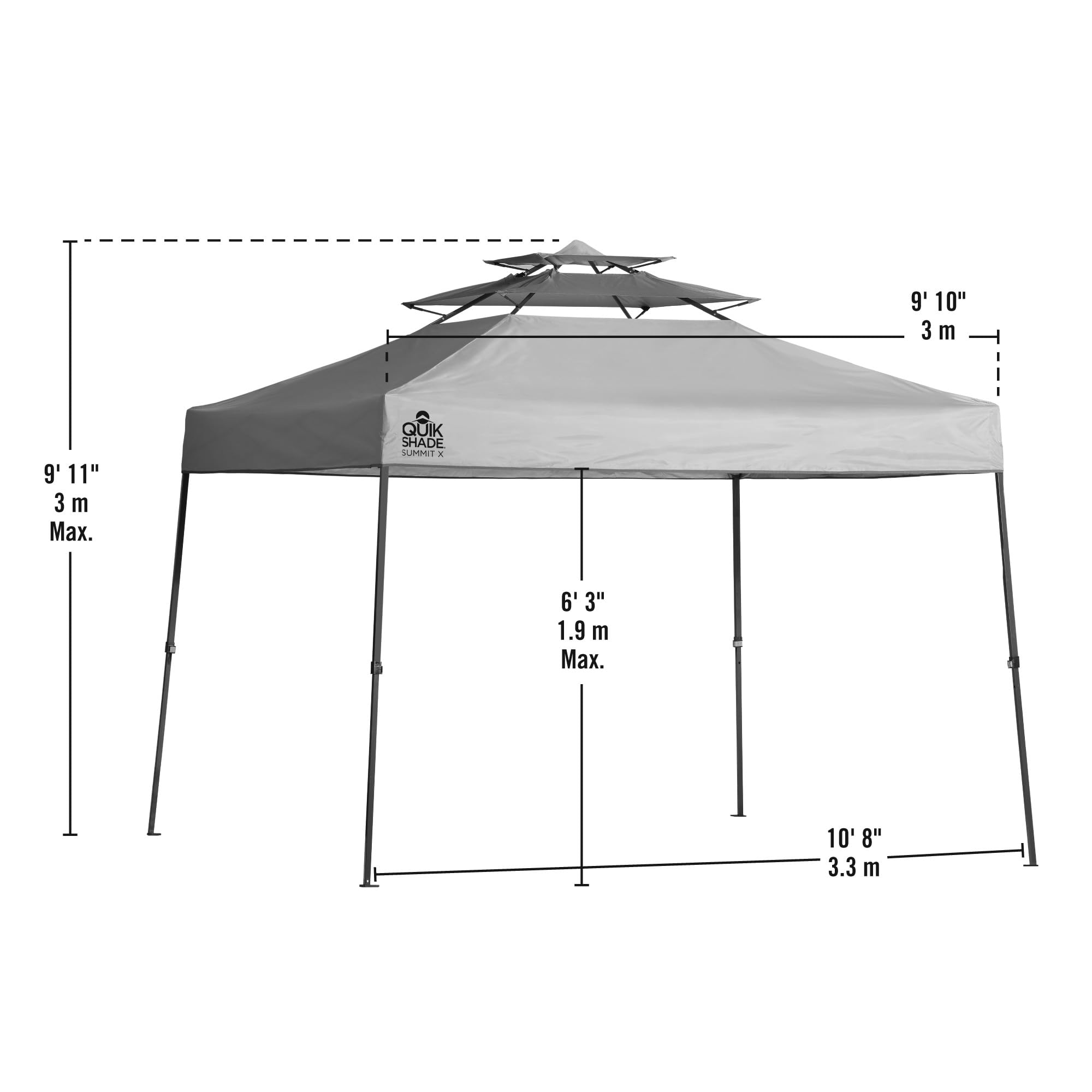 Get out of the sun without missing the fun! The Quik Shade Summit SX100 10-Foot x 10-Foot Instant Canopy is a lightweight recreational shelter that assembles in less than a minute. The UV-resistant top is Aluminex-backed, providing 99% UV protection from the sun's harmful rays. It's the highest outdoor fabric UV protection available! The straight leg design provides additional stability, with patented Quik Latch push/pull sliders and pushpin leg extenders designed for ease of use. The 10-foot x 10-foot canopy top provides a total of 100 square feet of shade for 8-12 people - enough for the whole family to comfortably take shelter! This canopy has an open cathedral ceiling for more headroom, as well as 2 Super Vents at the top for superior air flow, with a peak height of 10 feet and an eave clearance of 6 feet 5 inches. Take it anywhere in the durable, polyester roller bag to all of your outdoor activities - farmers markets, sporting events, backyard parties, the beach, and much more! Includes canopy frame, canopy top, roller bag, and 4 steel stabilizing ground stakes; 1-year limited warranty.