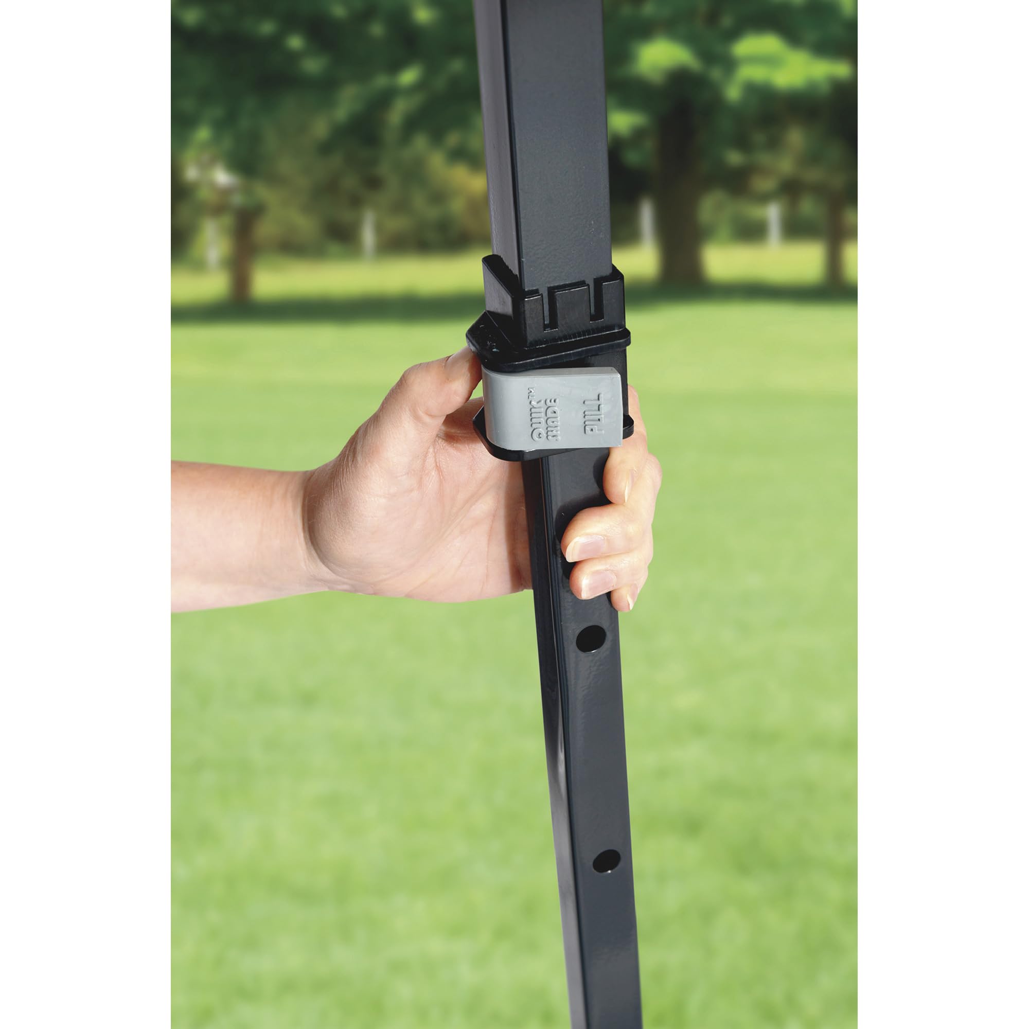 Convenient 600D polyester roller bag lets you store and transport anywhere; includes canopy frame, canopy top, and 4 steel stabilizing ground stakes