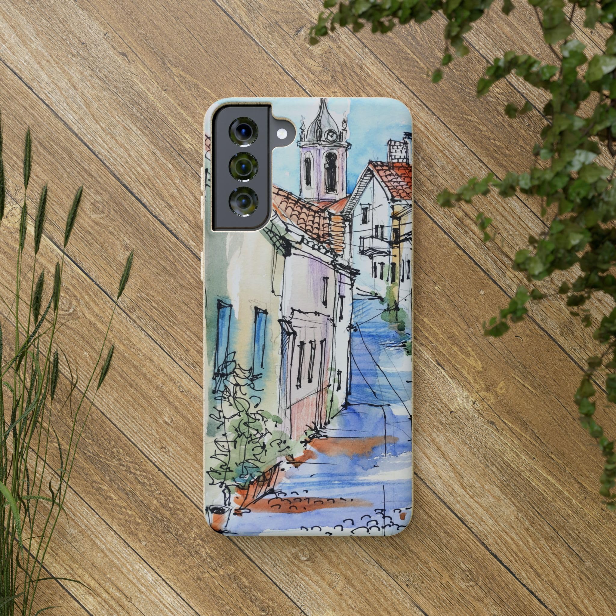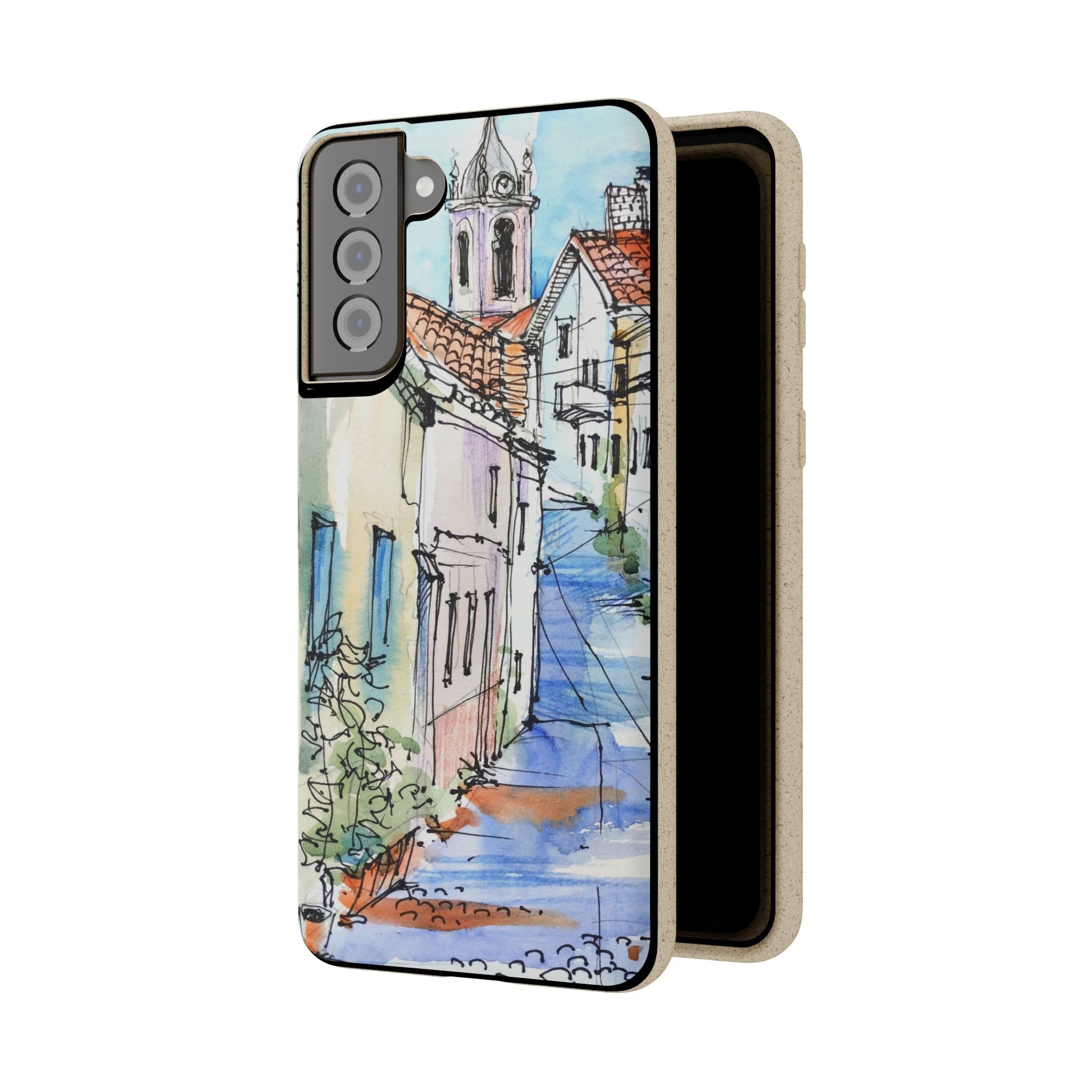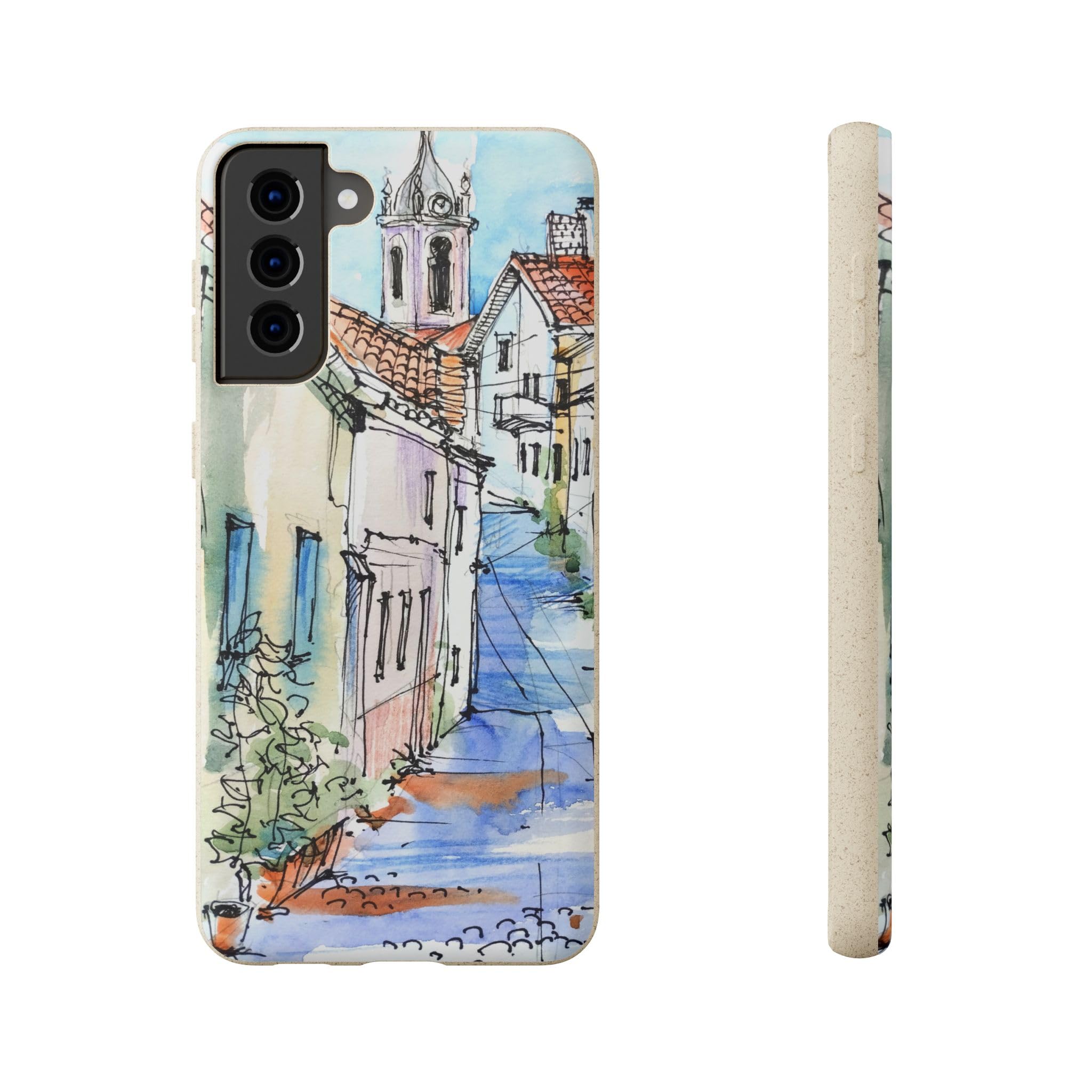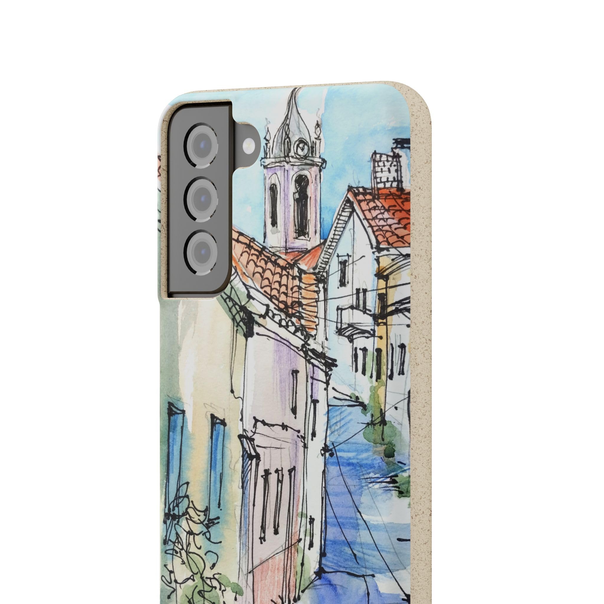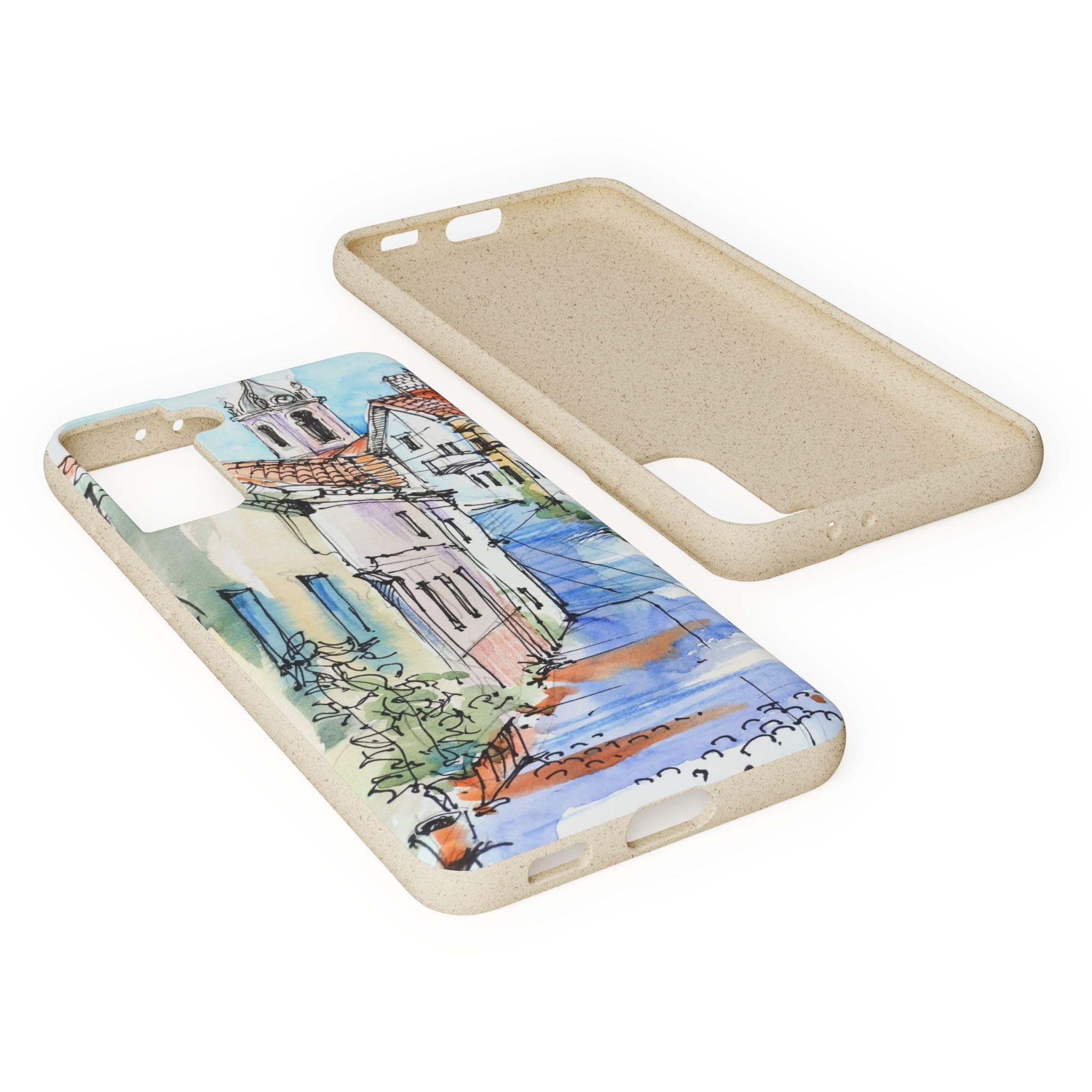 Protect your phone in style while protecting the planet! Embrace nature with our European Town Art Biodegradable Phone Case, featuring a charming illustration of a colorful European street scene. The design showcases quaint cobblestone roads, vibrant historic homes, and a picturesque chapel, all beautifully rendered in watercolor and fine pen detail. Perfect for lovers of travel-inspired art, European architecture, and the warm, nostalgic feel of hand-painted urban landscapes. Crafted from eco-friendly, compostable materials, this sustainable phone case not only protects your device but also supports a greener planet — naturally biodegrading within 160 days of disposal. It’s lightweight, durable, and fully supports wireless charging for effortless everyday use. Available for multiple phone models. Order yours today and carry the beauty of nature wherever you go! Details: .: Materials: PLA and PBAT polymers, bamboo fibre .: Matte finish .: Wireless charging compatible .: Precise cut outs for connectivity .: Might have a natural scent