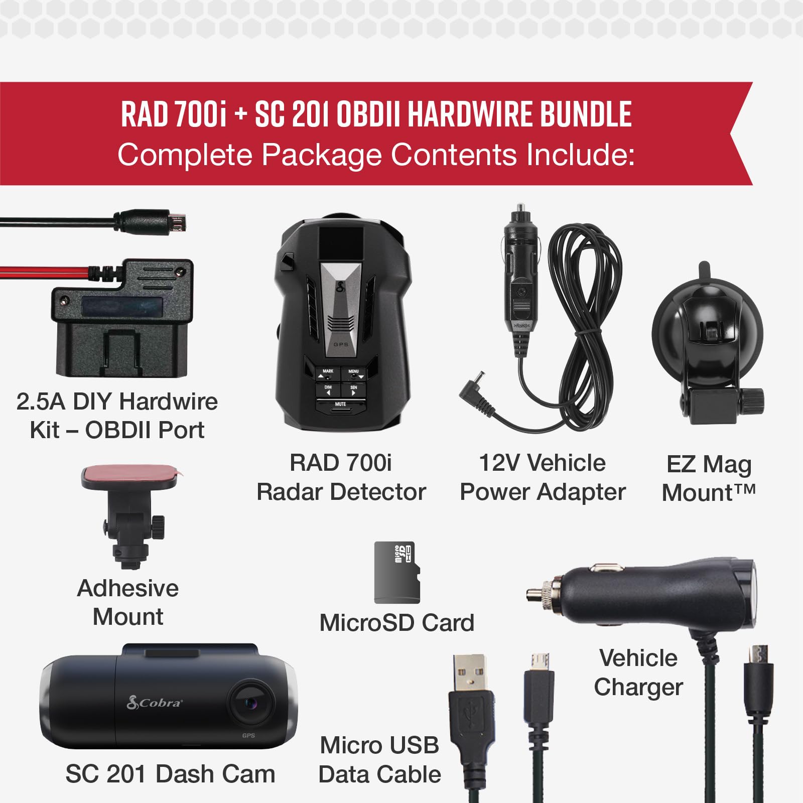 Included Components – RAD 700i Radar Detector (12V power cord, suction cup car windshield mount, and a hook and loop fastener for dash mounting), SC201 Dash Cam (16GB MicroSD Card, quick release magnetic mount, and a vehicle power adapter), and a 15ft. OBD II cable for the hardwire kit.