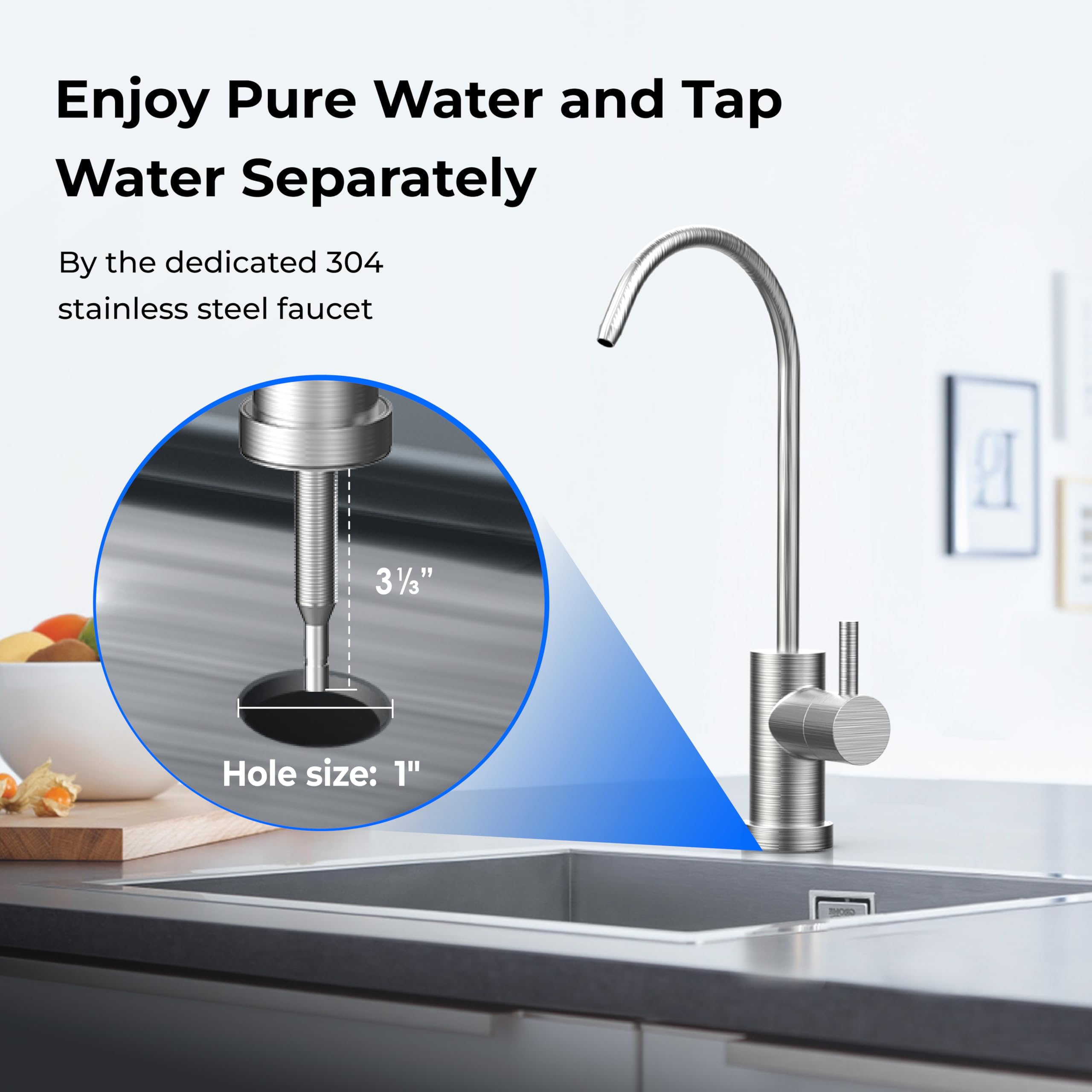 【PREMIUM DEDICATED FAUCET】: The under sink water filtration system comes with a lead-free brushed stainless steel faucet. You can use separate taps for different purposes. For example, you can wash fruits and vegetables with the original tap, while the purified water tap is for drinking. This undersink water filter system satisfies your dual needs for purified and tap water.