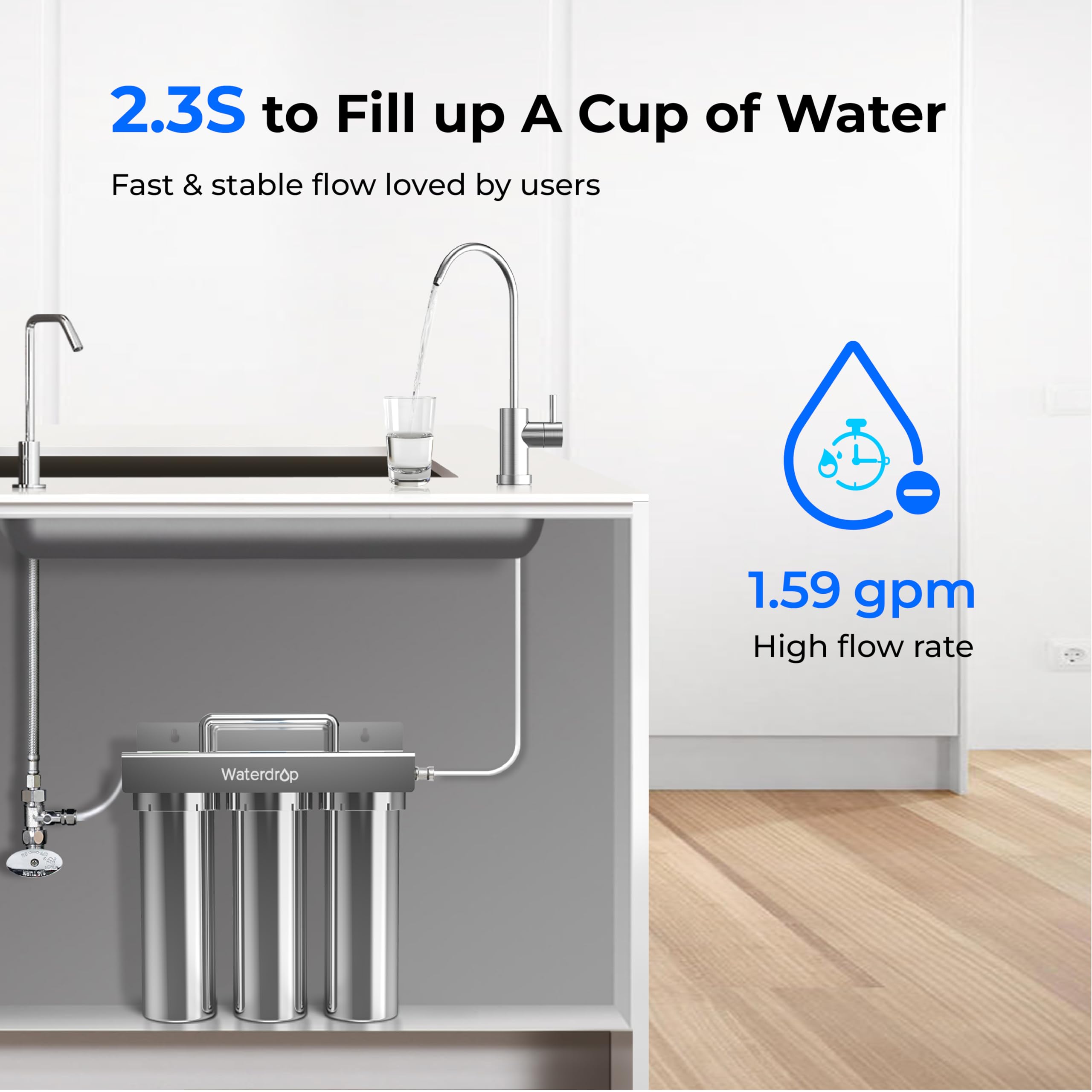 【FAST AND STABLE WATER FLOW】: Ain't nobody got time to wait around for water. With a flow rate of up to 1.59GPM, this under sink water filtration system fills up an 8-ounce cup in just 2.3 seconds. It's lightning-fast and stays steady, so you can whip up meals or mix baby formula in record time.