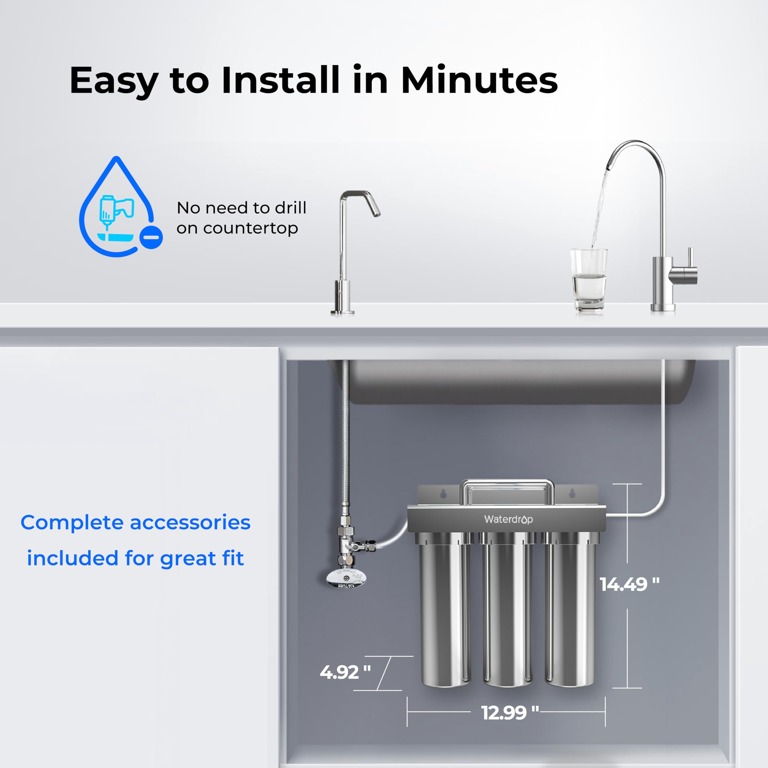 【MULTIPLE PLACEMENT OPTIONS】: Stick it on the floor or hang it on the wall—this under sink water filter's as versatile as they come. And if you're short on space, slap it right onto your faucet without any extra drilling.