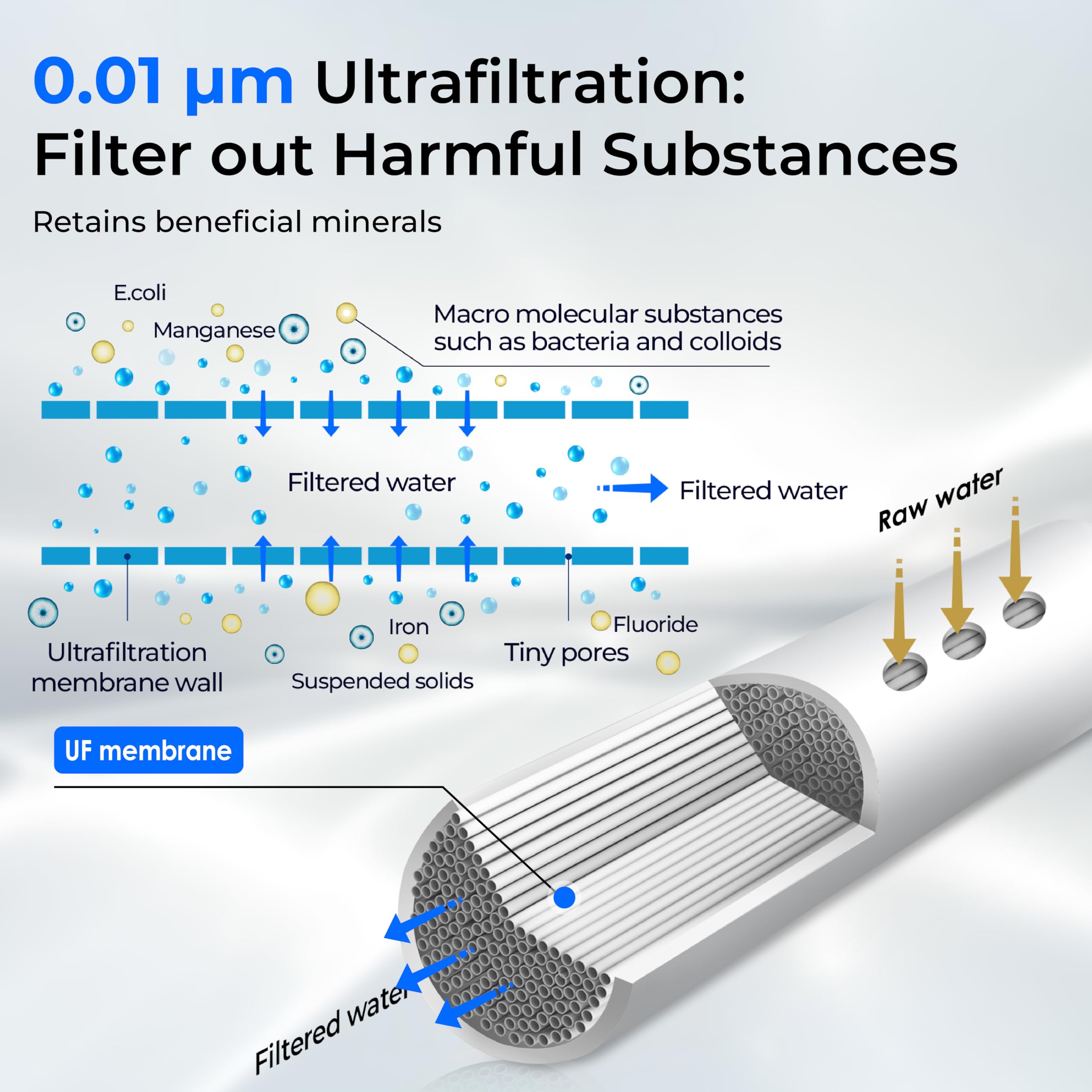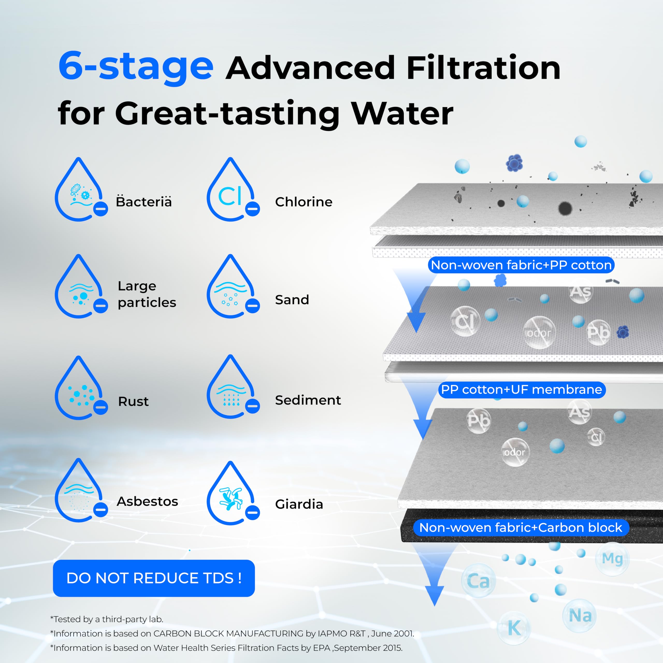 【FILTERS LARGE VOLUME OF SUBSTANCES】: This under sink water filtration system has 6 layers of top-notch filter materials, including a precision ultrafiltration membrane that can reduce impurities larger than 0.01 microns. Say goodbye to chlorine, heavy metals, funky odors, and more.