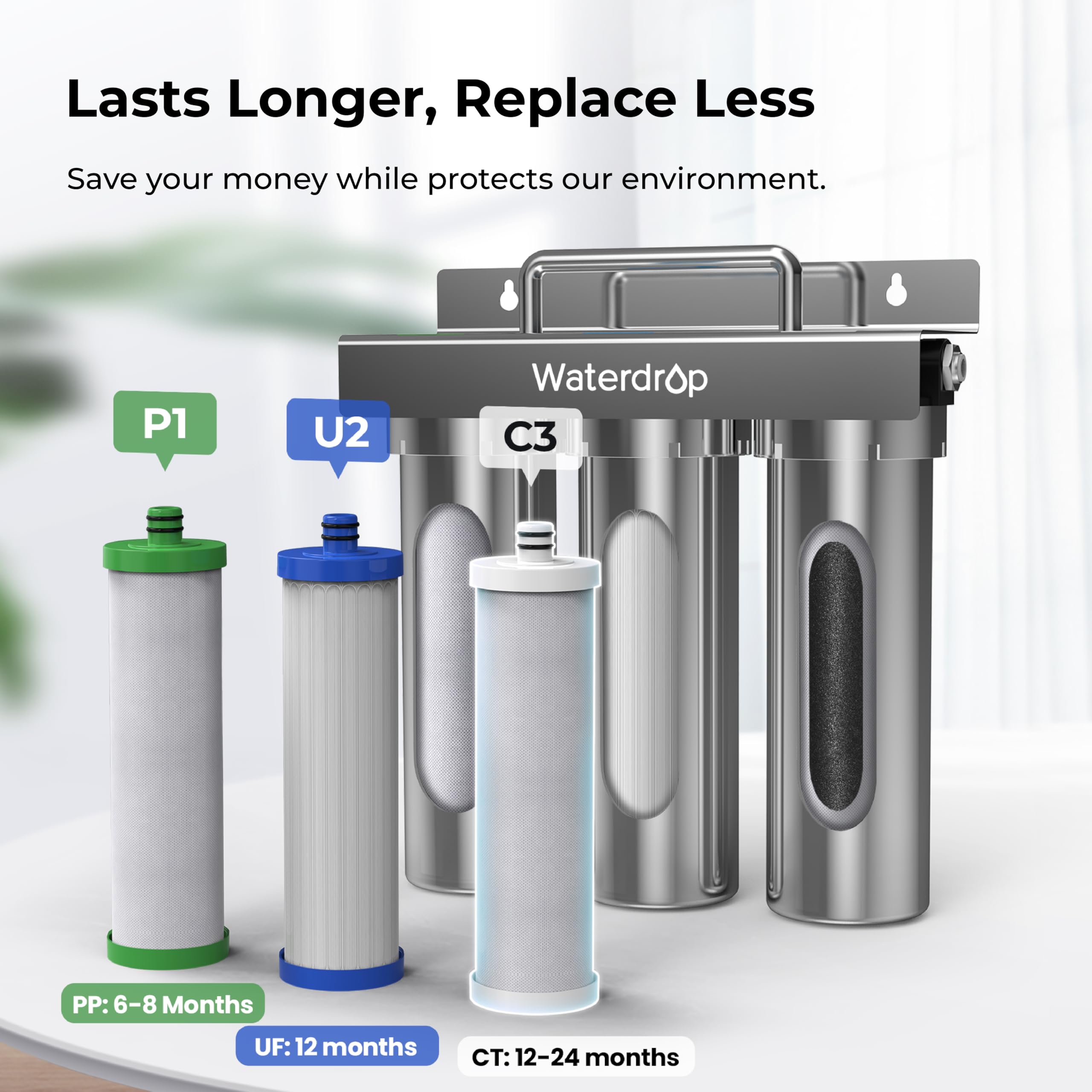 【LONG FILTER LIFE AND MORE GOOD FOR THE ENVIRONMENT】:These filters are built to last. The PP filter goes strong for 6-8 months, the UF filter for a year, and the CT filter for 12-24 months. Plus, by cutting down on plastic casing changes, we're saving Mother Earth from 500,000 pounds of waste each year—that's enough space to plant 20,000 trees!