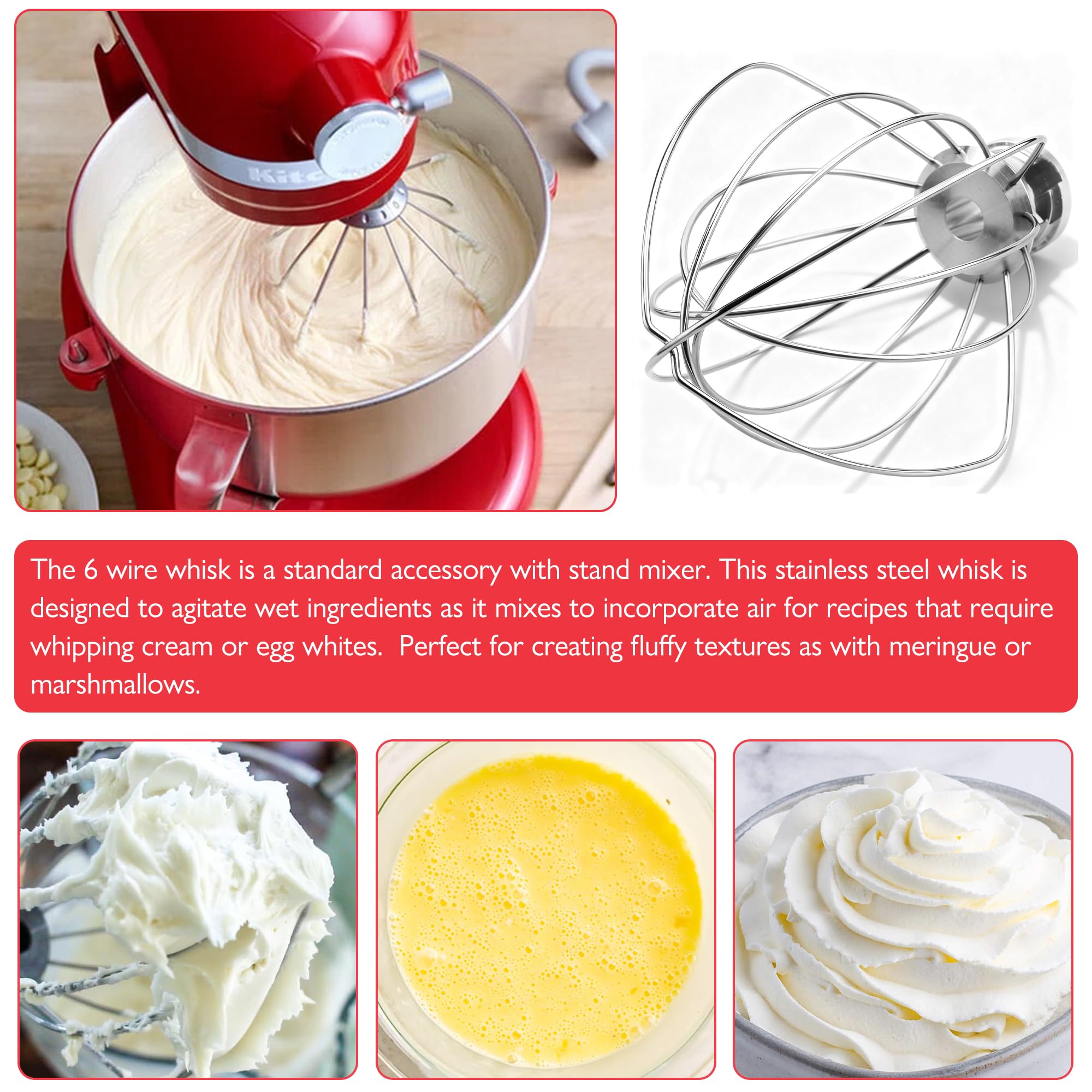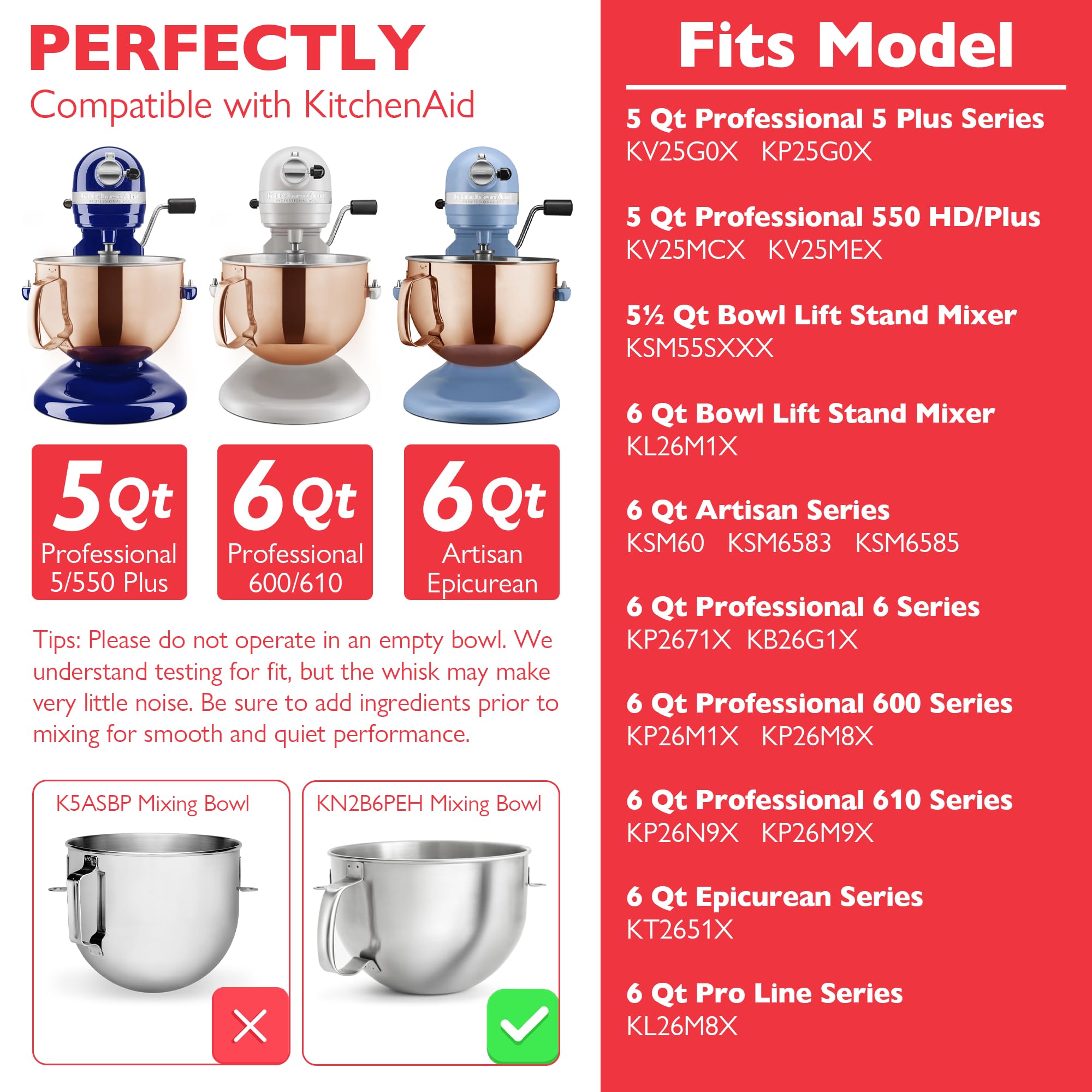🌟【Design for KitchenAid】This whisk compatible with Kitchen Aid 6 Quart bowl lift stand mixer. Include model: KV25 KSM55 KSM60 KL26 KT26 KP26 KSM6521 KSM6583. NOTE: Professional 6000 HD(with a tulip mixing bowl), K5SS, KG25 and KSM5 please select the K5A whisk.