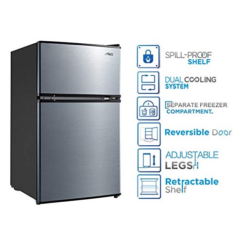 Capacity: 3.2 cu ft Energy Star Certified Reversible door hinge for right or left opening Vegetable and fruit crisper 2L bottle storage rack and can dispenser Glass shelves 2 Adjustable Front Legs for Leveling Interior light Adjustable thermostat Dimensions: L 18.5 x W 19.4 x H 33.0 The Arctic King 3.2 cu ft Two-Door Compact Refrigerator is an excellent way to keep your food and drinks cold in any sized room. The separate freezer compartment gives you plenty of space to store your frozen dinners, ice cream and more. The can dispenser and two-liter bottle rack free up shelf space and make your favorite drinks easily accessible. The stylish stainless steel look will suit all styles of decor and the interior light makes it easy to find your favorite treats. Use the mini fridge in your den, garage, office or dorm room, and it can easily fit in a tight corner or other out-of-the way place. Arctic King 3.2 cu ft 2-Door Compact Refrigerator not only keeps your favorite food perfectly fresh for longer, but its manual defrost setting allows you to clean whenever you want for optimal cooling and food preservation. Easily set the internal temperature according to your needs, and simply adjust the leg height as this compact cooler fits perfectly in any kitchen.
