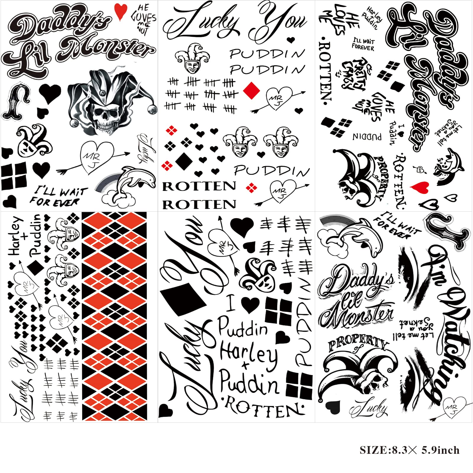 ❥【MORE QUANTITY】 - 22 sheets Halloween face temporary tattoos. Size: 6 sheets large HQ Joker tattoos size 8.3x5.9 inch, and 16 sheets small size 4.1x2.4 inch. Much quantity Halloween tattoos for accessoriesare enough for you share it with your family and friends.