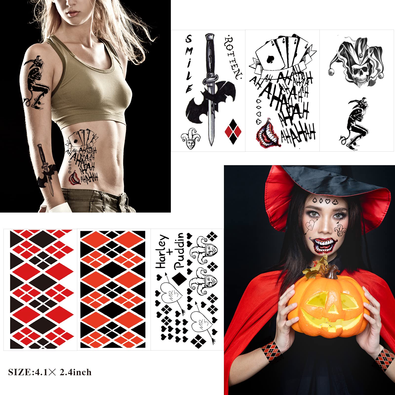 About Product: Package Include: 16 sheets Halloween temporary tattoos Size: 6 sheets HQ Joker tattoos 8.3'' * 5.9'', 16 sheets 4.1'' * 2.4''. High Quality: Our Joker temporary tattoos can last 5-7 days according to the position you stick it Easy to Remove: 10-20 seconds with just water and easily removed by rubbing alcohol, body oil, olive oil. How To Use: 1. Cut out tattoo of choice and remove the transparent film. 2. Place tattoo face down on skin. 3. Wet the tattoo thoroughly with a sponge or towel. 4. After 20-30 seconds, gently remove the back paper. 5. Allow tattoo to dry. Note: Not intended for children under 3 years. Discontinue use if irritation occurs. Do not put directly on eye. Do not apply to sensitive skin, near eyes, of if allergic to adhesive. Due to the difference between different monitors, the picture may not reflect the actual color of the item.
