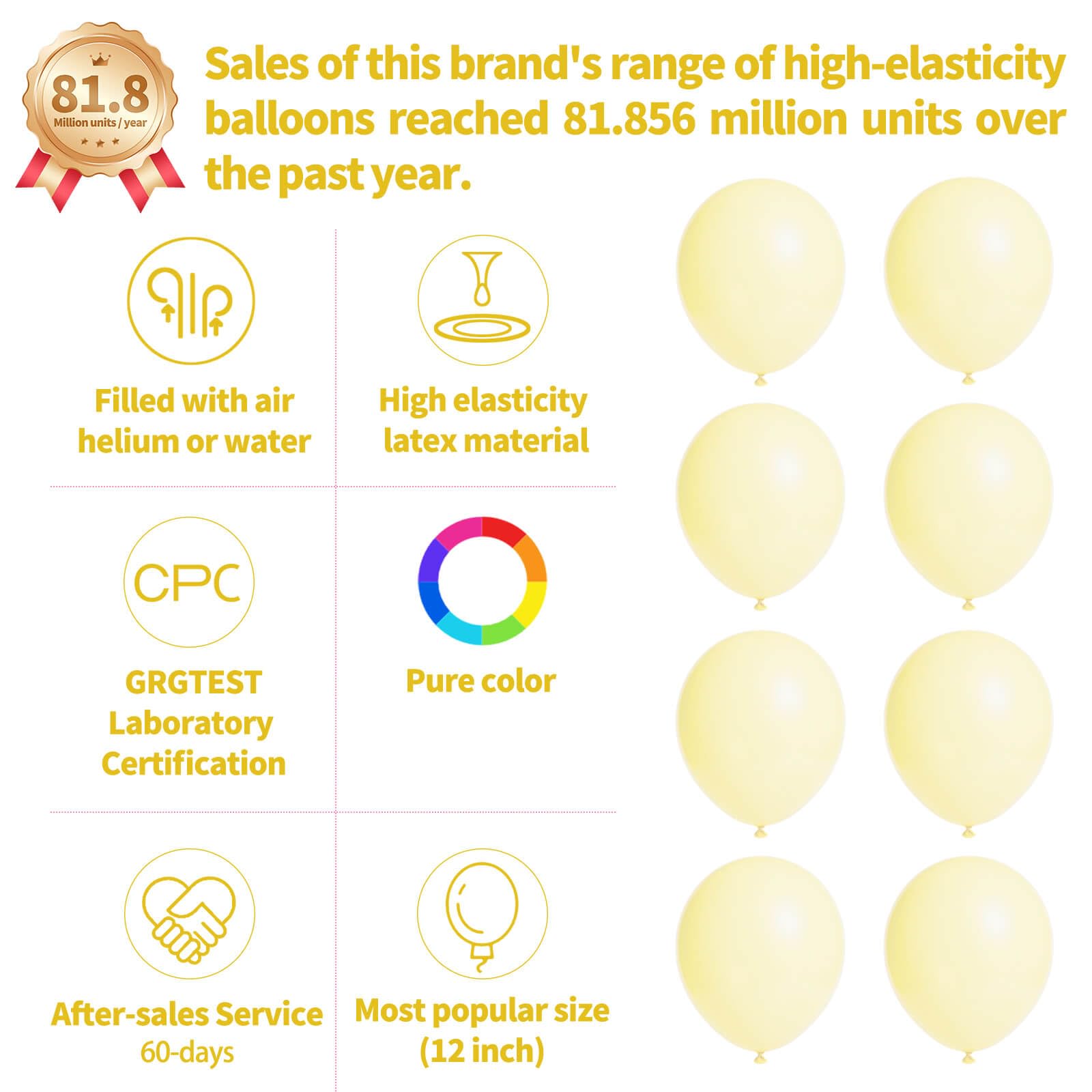 Our pastel yellow latex balloons 12 inch are made of thickened latex, the color is bright yellow, these pastel yellow balloons can be used as balloons decorations for birthday party, and play around children.
