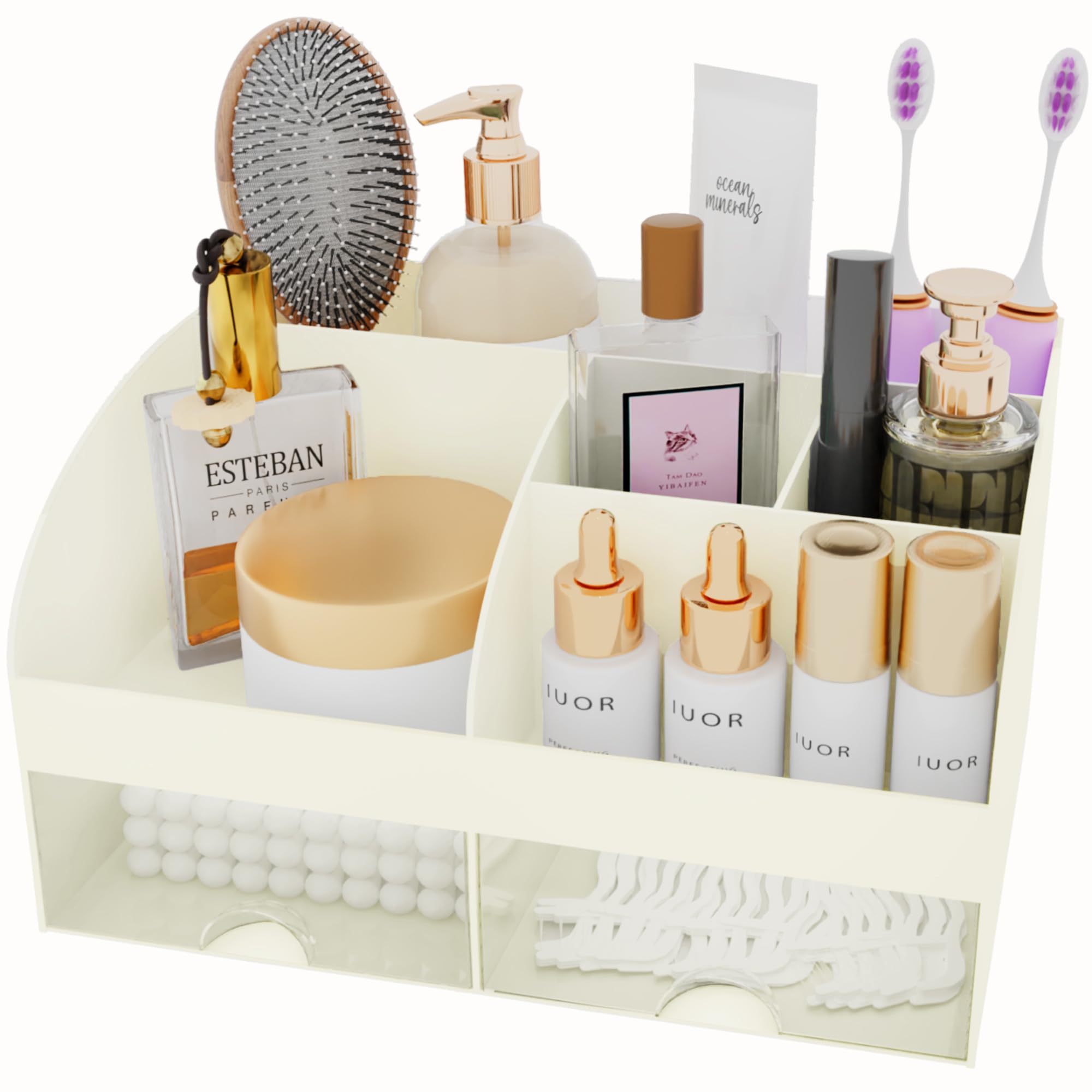 Multiple Storage Spaces: Small body with large capacity, great cosmetic storage countertop assistant contains 6 Sections and 2 drawers, different compartments allow you to place items according to your needs, transparent drawers allow you to quickly find what you need, easy to place and take, the perfect match can let you all the makeup accessories are neatly stored