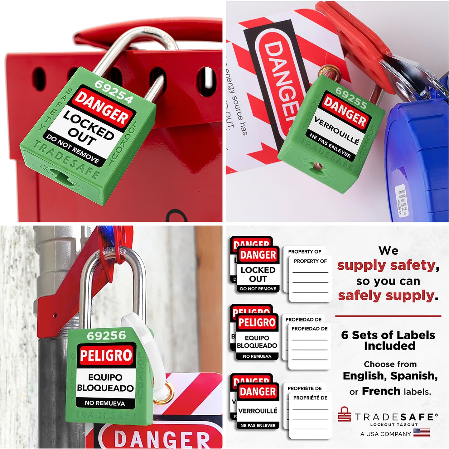 Multilingual Labels - Each lockout tagout lock set comes with 2 sets of labels in English, Spanish, and French; “Danger Locked Out Do Not Remove” warning label for the front side and a spacious writable label for the back side