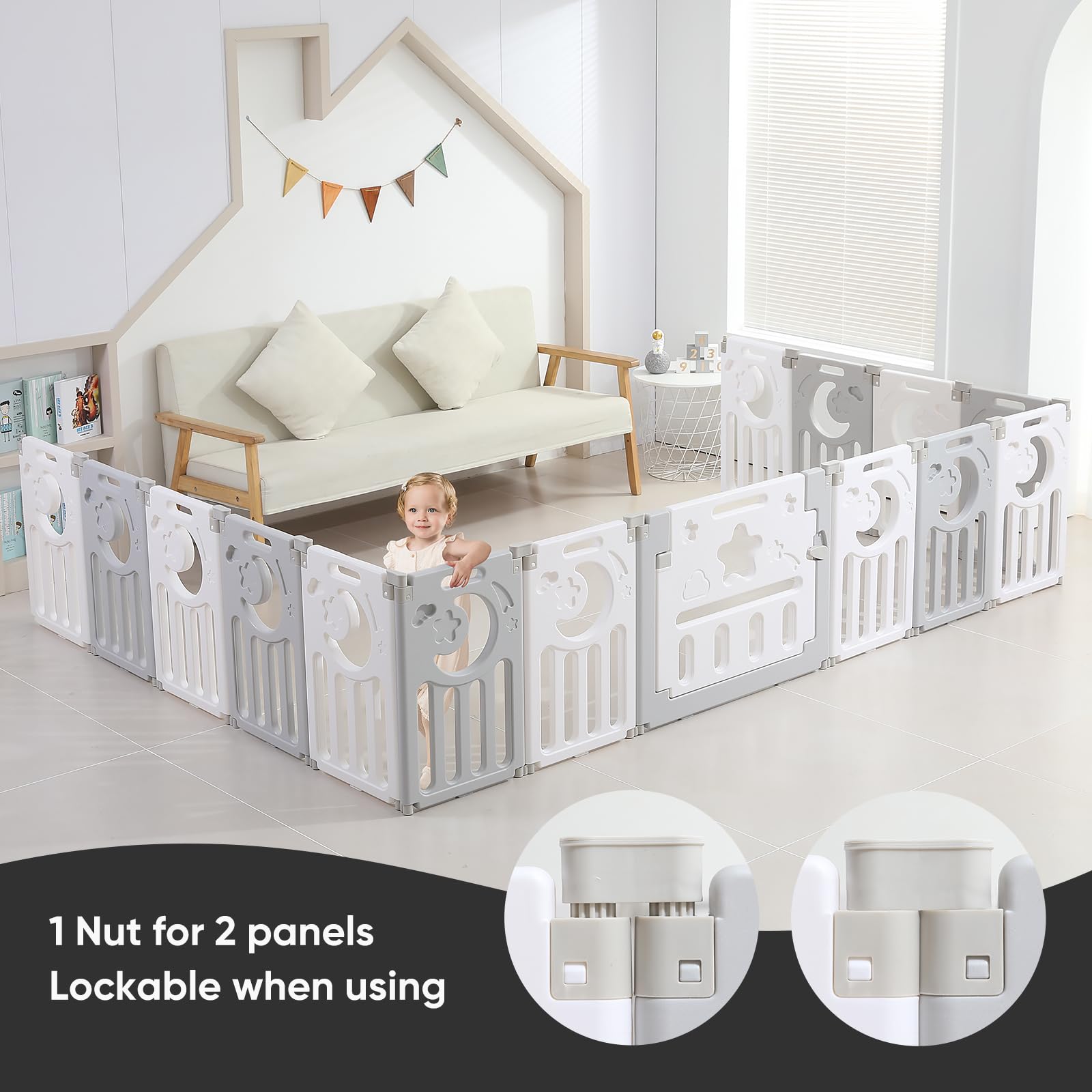 【ADJUSTABLE SHAPE & SIZE】This 18-Panel Foldable Playpen unfolds to 74x74x24 inches (39 square feet) and offers flexible shapes like round, or square. You can also customize the size by adding/removing panels for a Space-Saving Design that fits any home corner