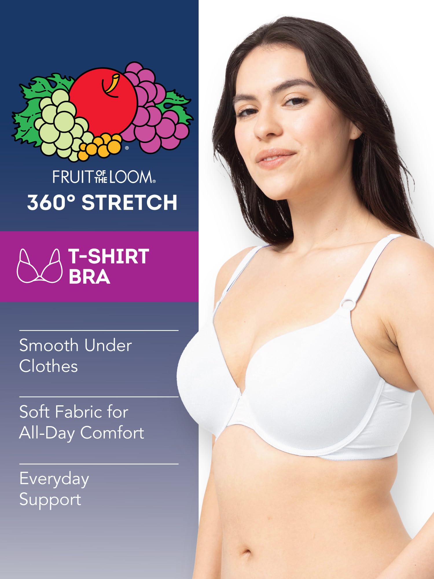 Description The Fruit of the Loom women's 3-pack T-shirt bra is your new favorite no show bra. The smooth, lightly lined cups are invisible under shirts, but one thing you won't be able to hide is your confidence. This full coverage bra is designed with thick adjustable straps and underwire for all-day comfort and support. Fruit of the Loom has been one of America's most trusted brands for over 160 years. We promise to deliver quality undergarments at an affordable price, always. Start everyday happy with Fruit of the Loom.
