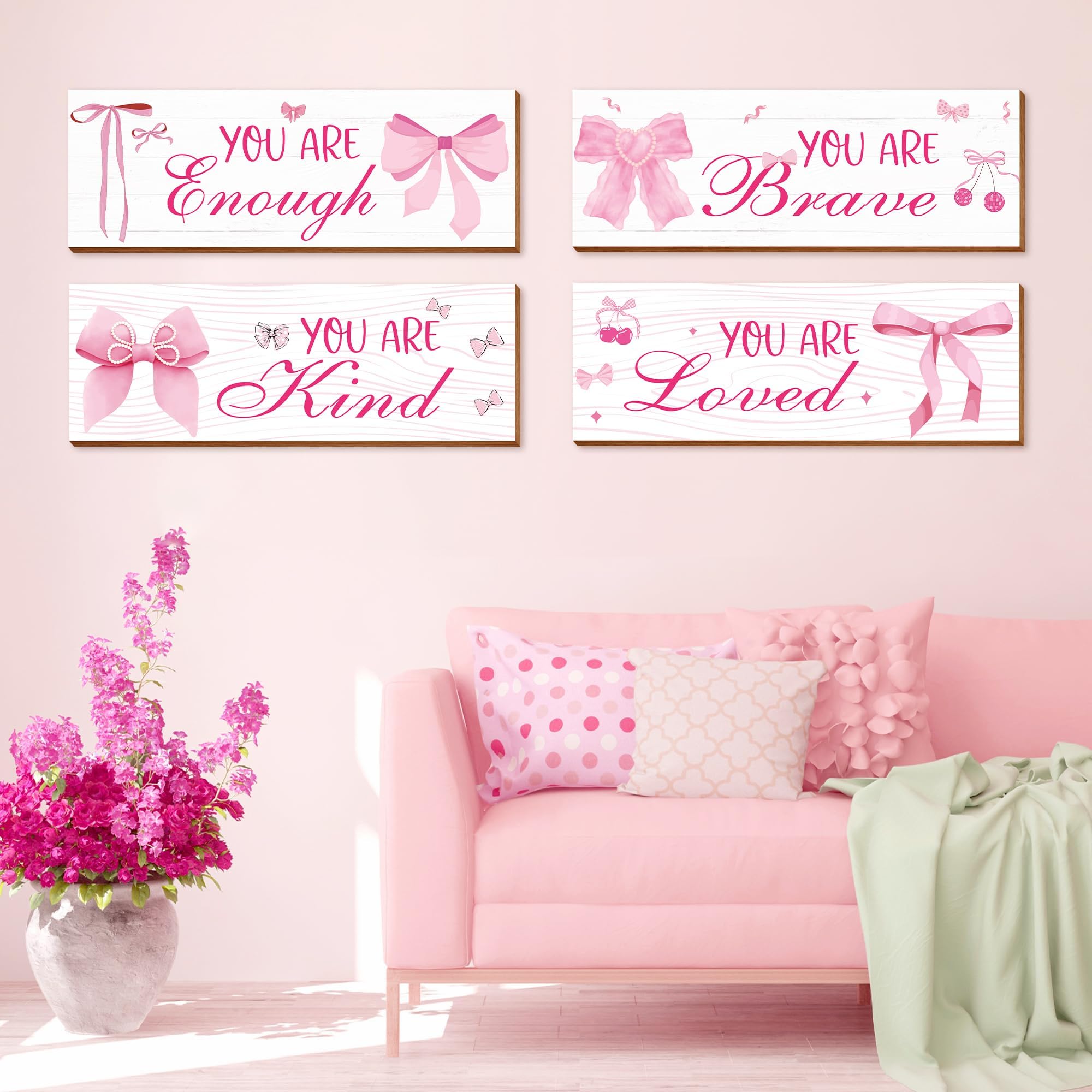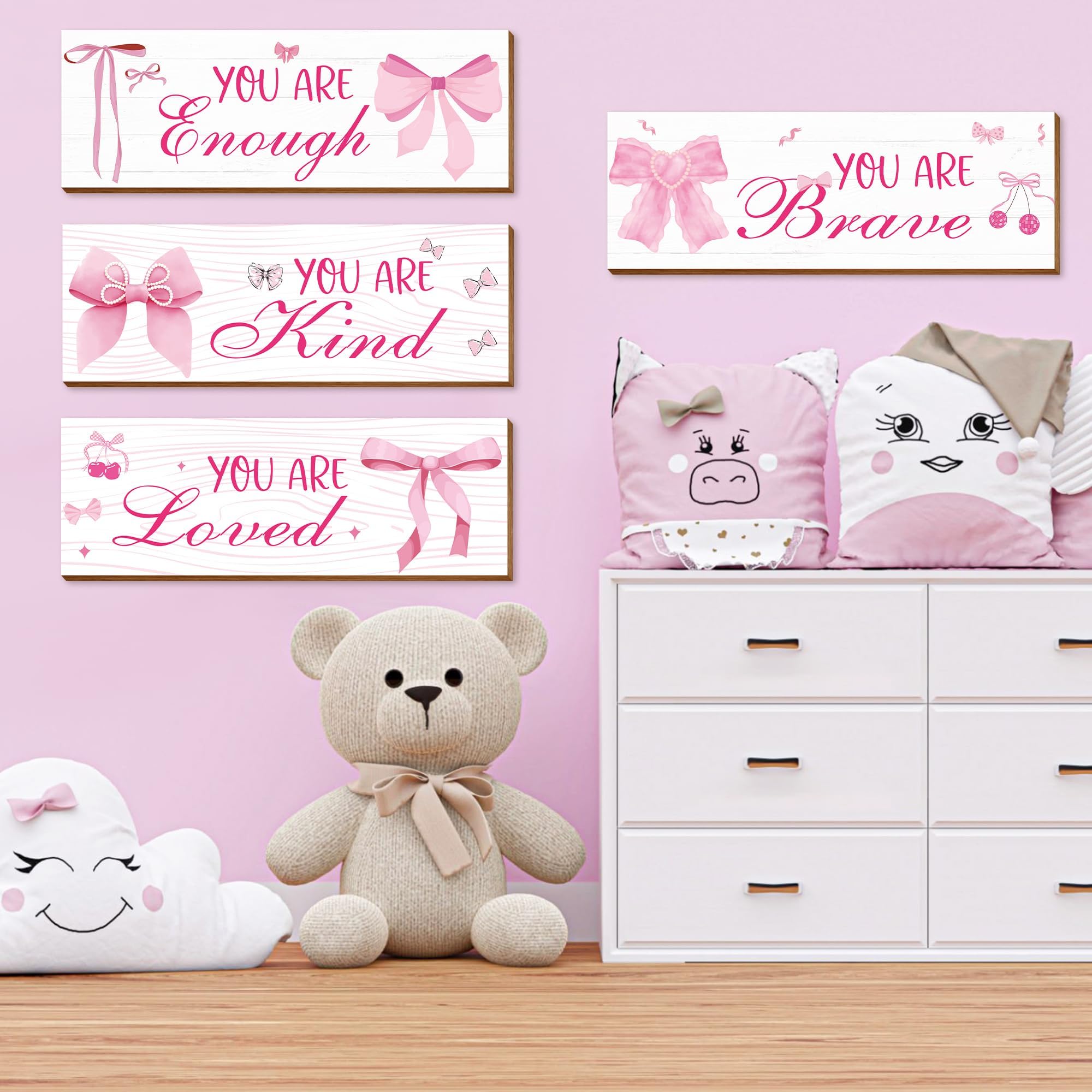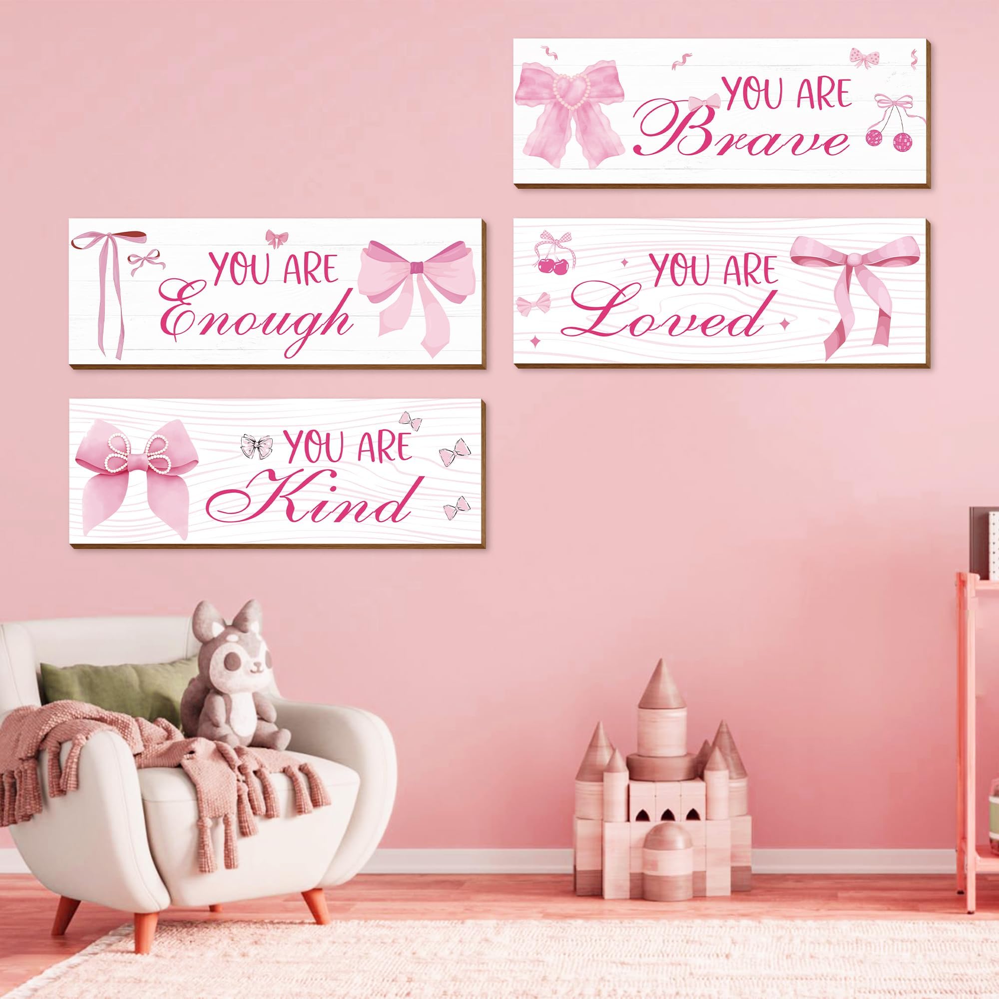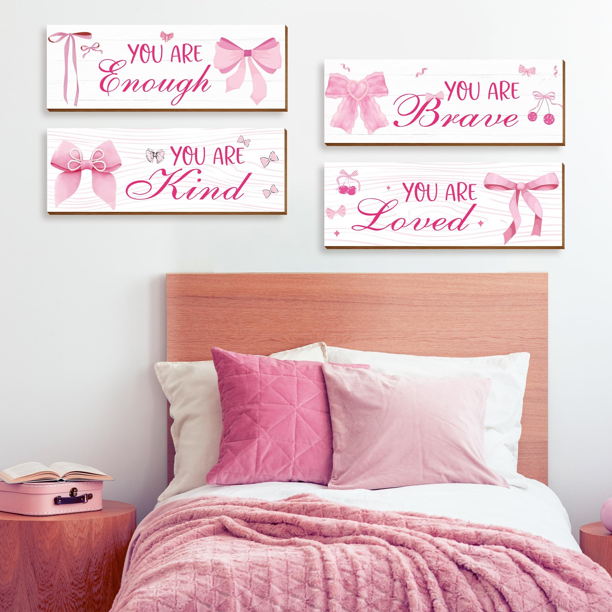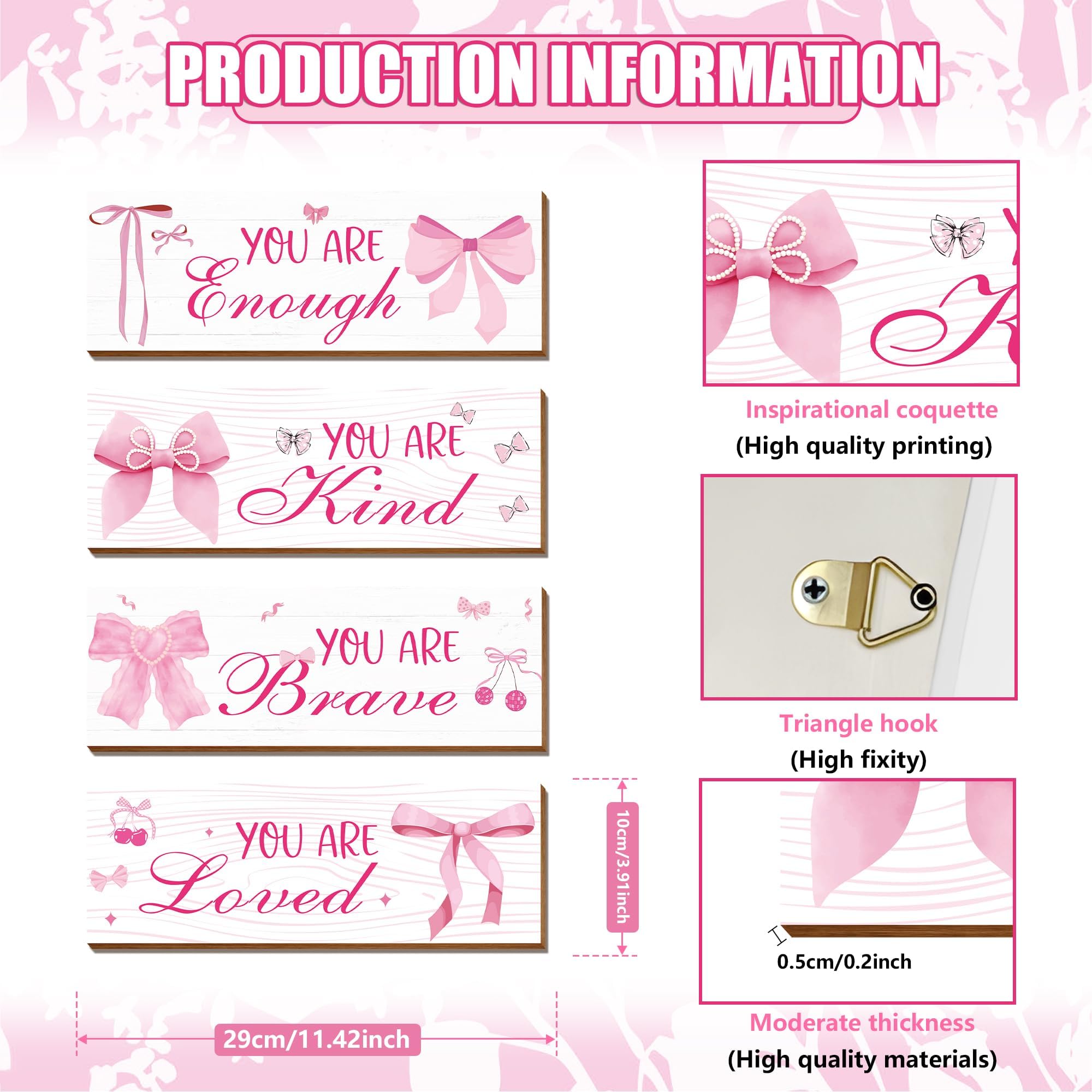 Charming Design for Girls: This set features four adorable pink bow-themed wooden signs, perfectly designed to elevate the aesthetic of any girl's room,Each wall hanging decor sign measures about 29*10*0.5CM(11.42*3.9*0.2 inch)