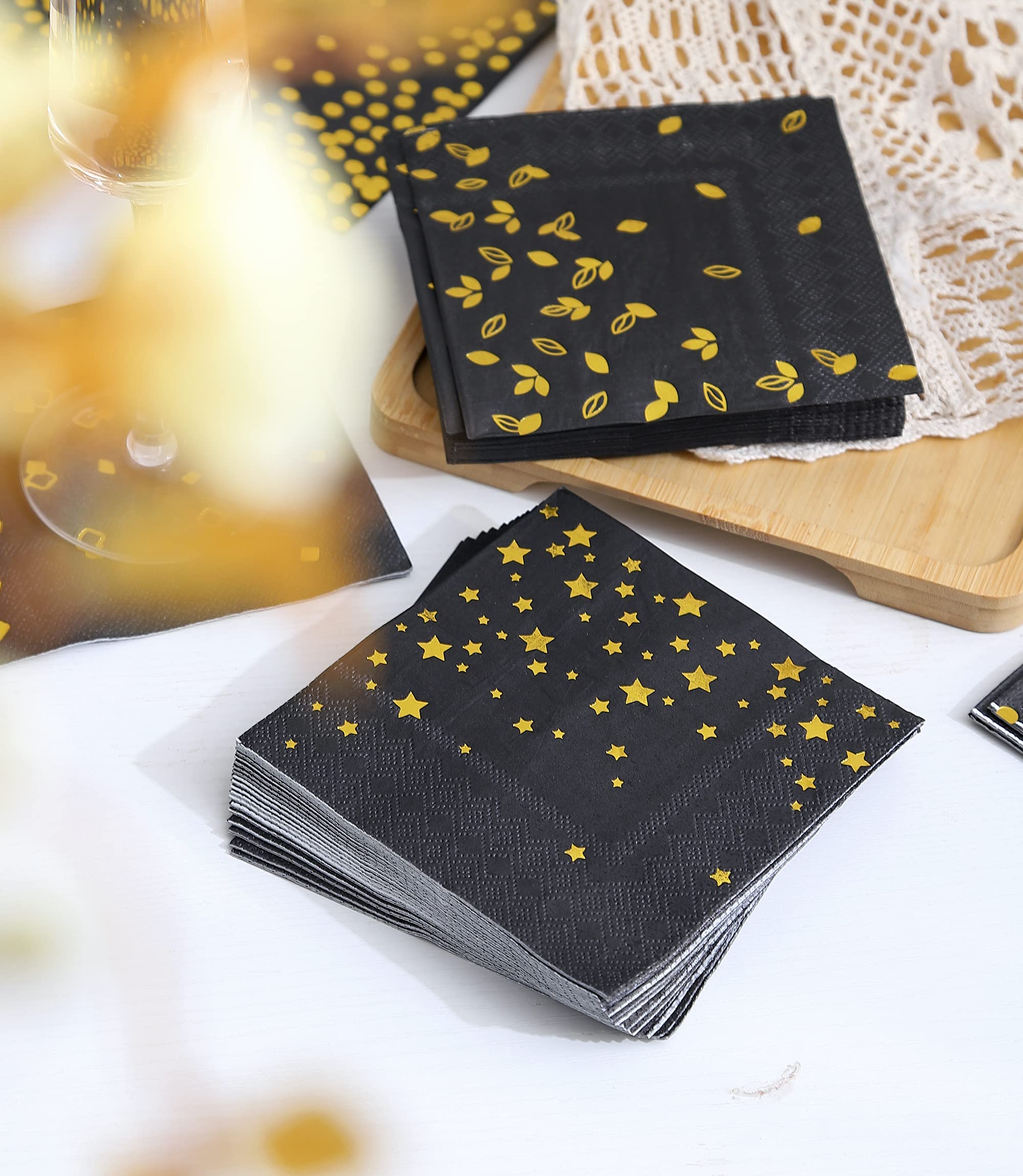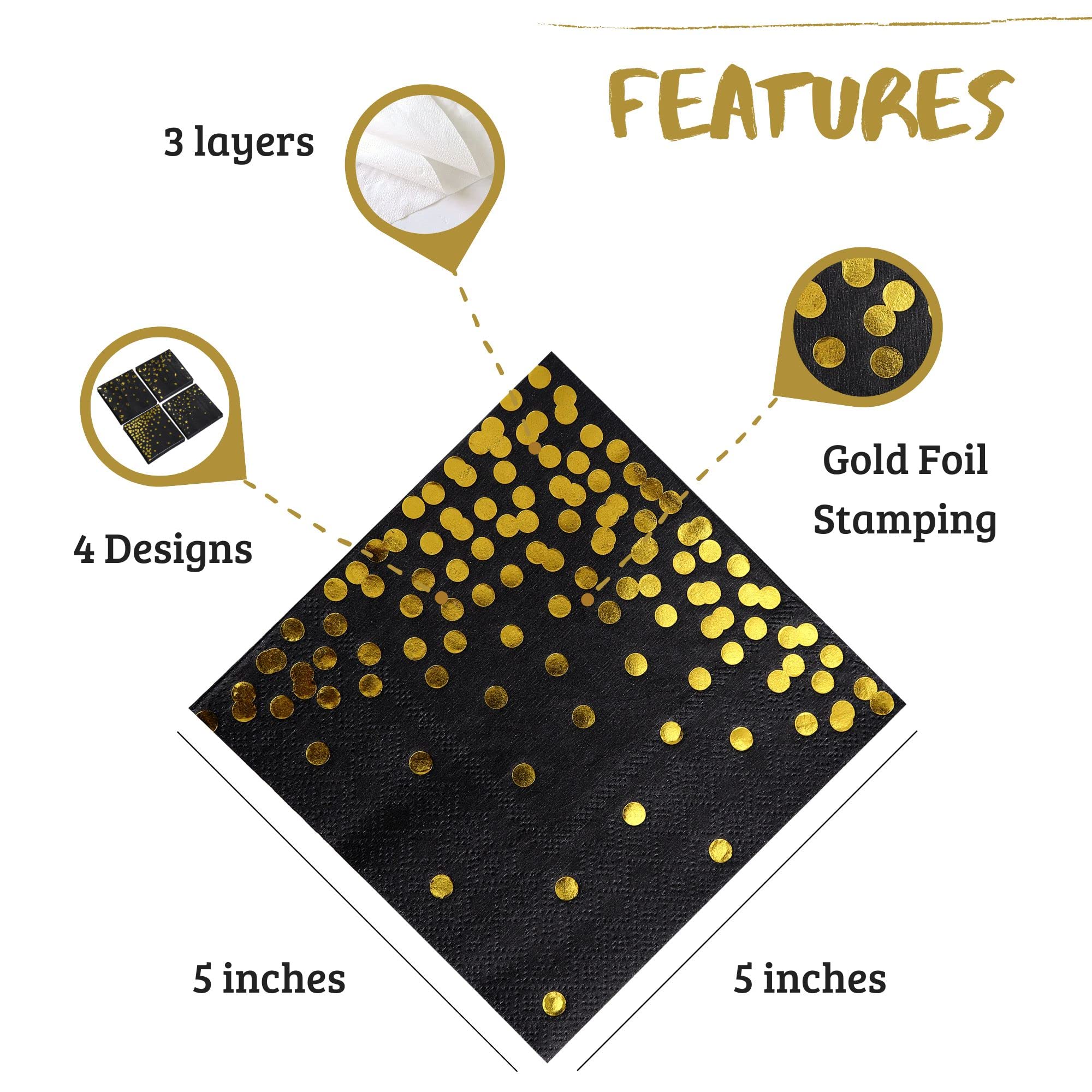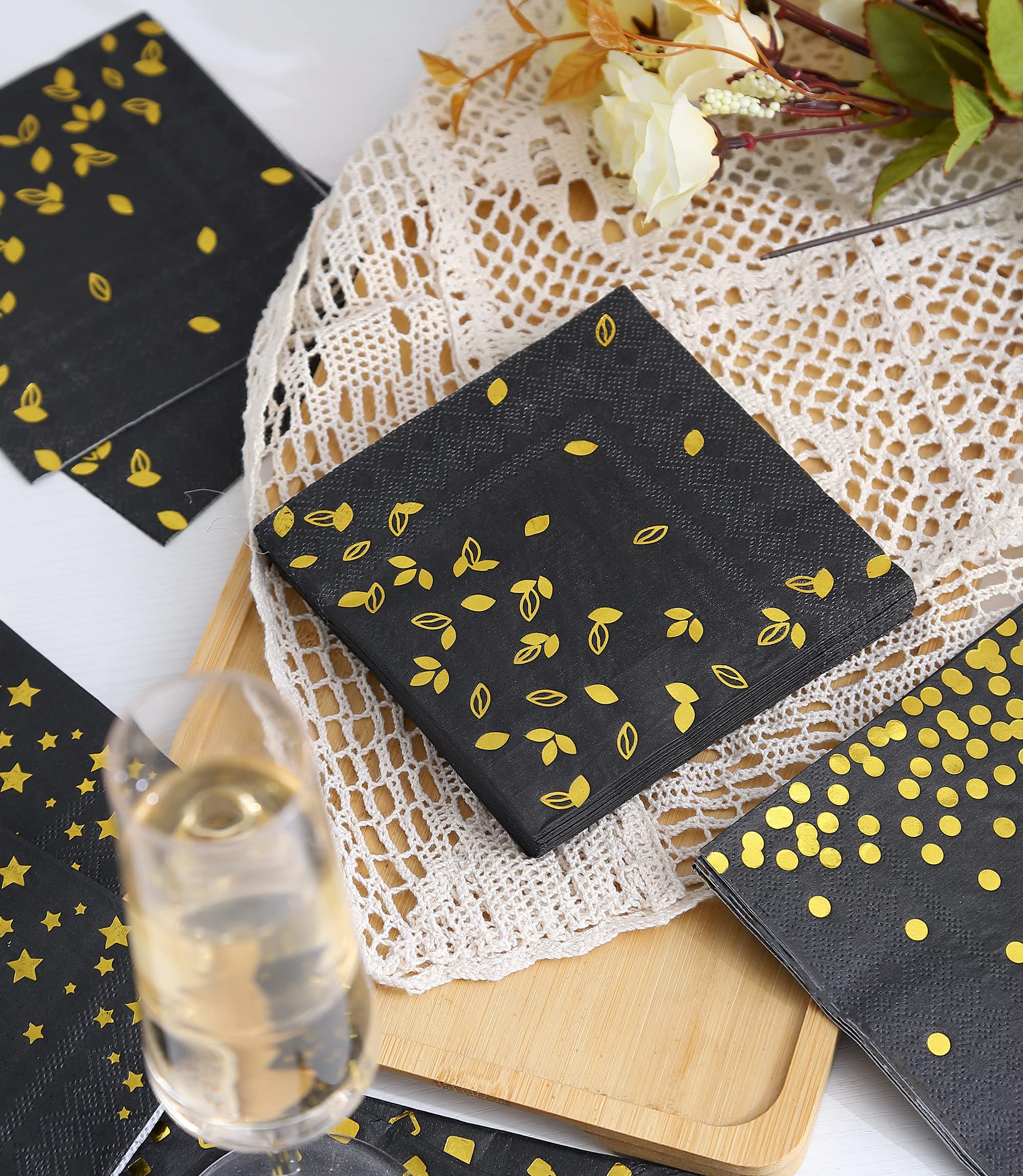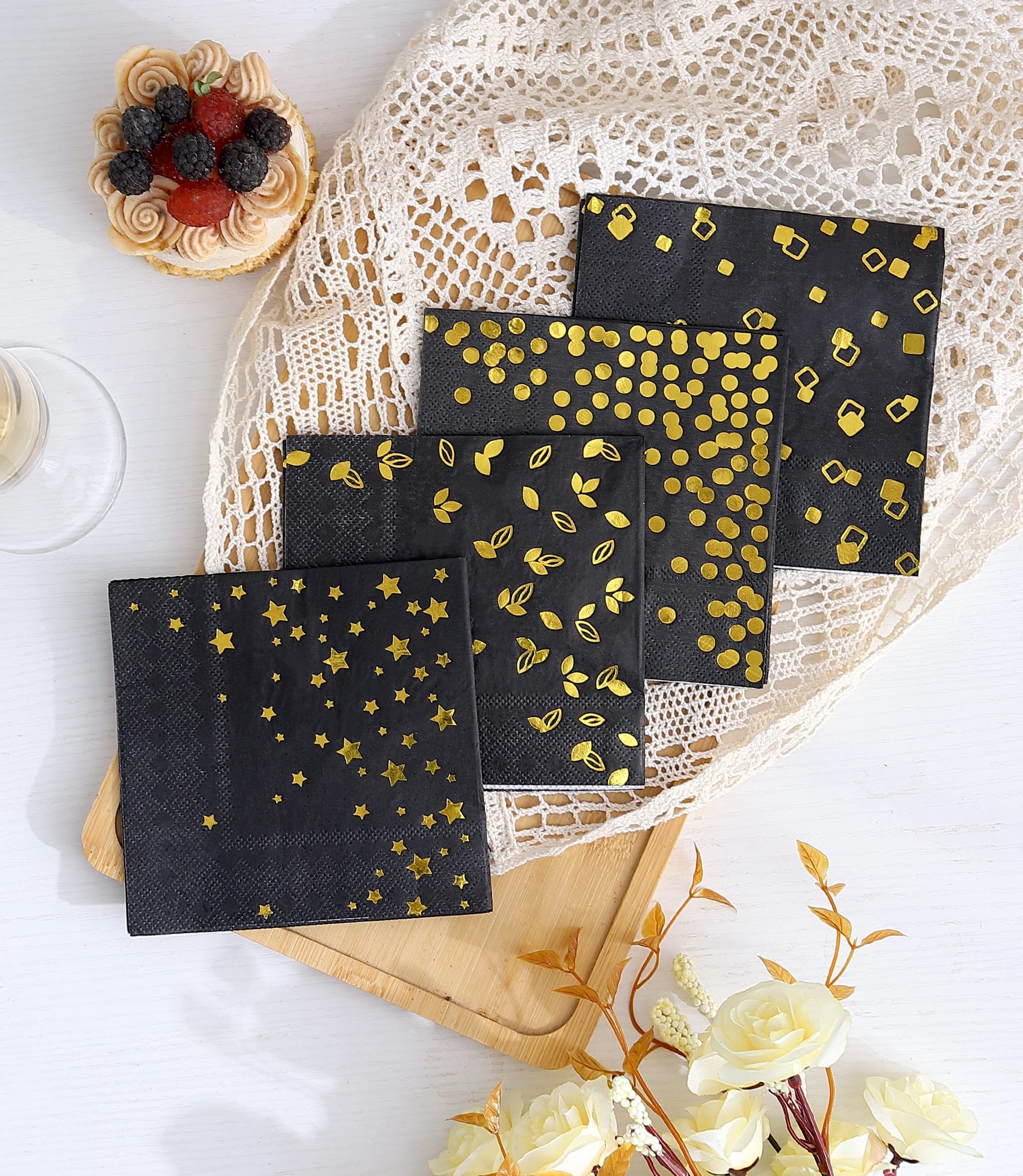 πΆ ππ‘πππ¨πππ¦: 100 pack assorted cocktail napkins with 4 different gold foil designs (25 sheets for each style and packed individually). Measures approximately 10 x 10 inches unfolded; 5 x 5 inches folded.