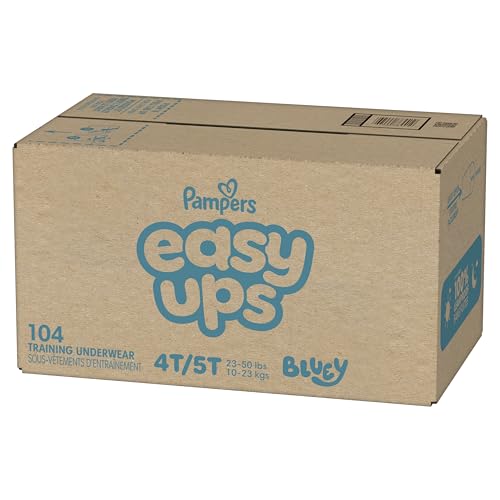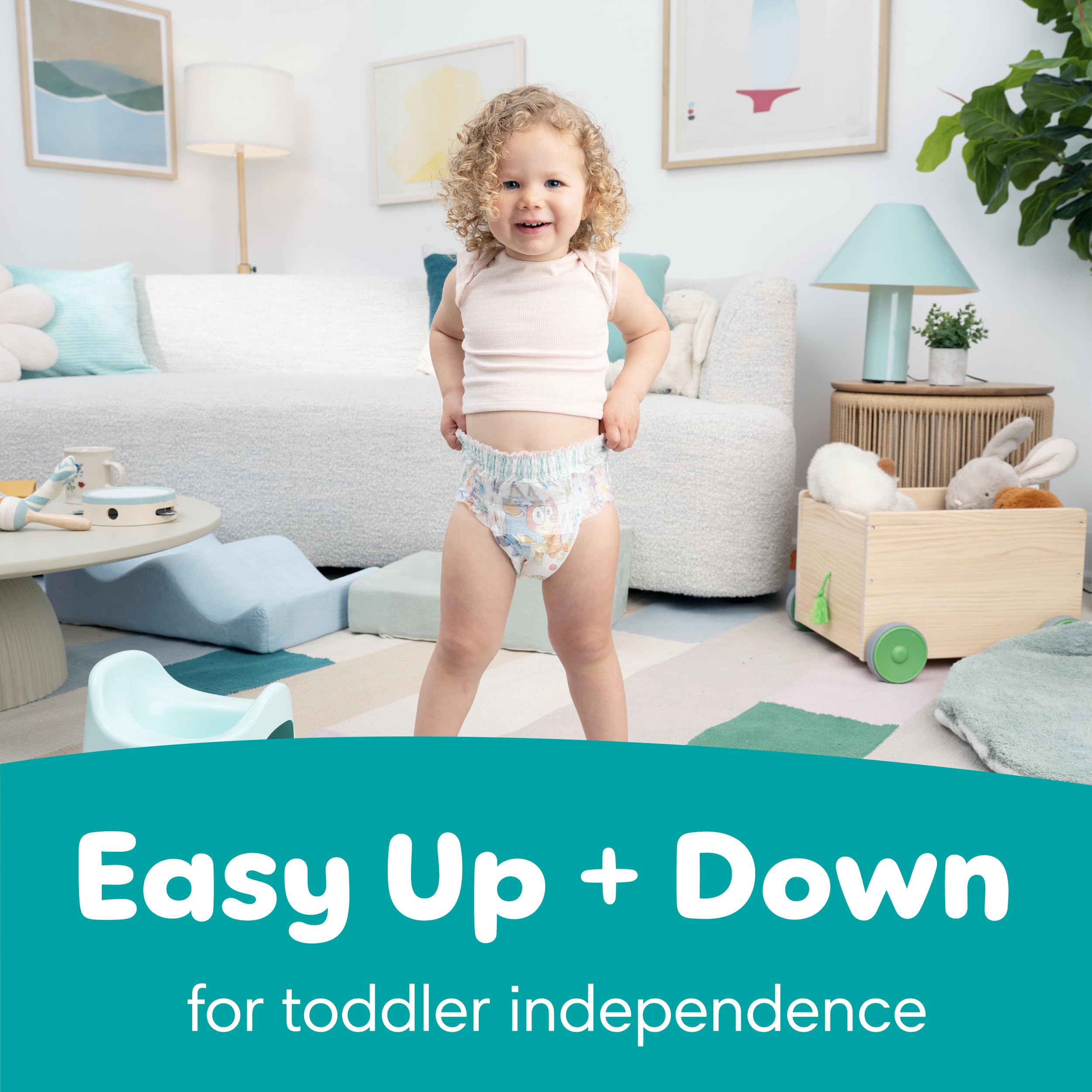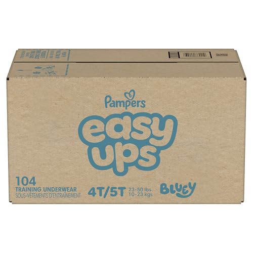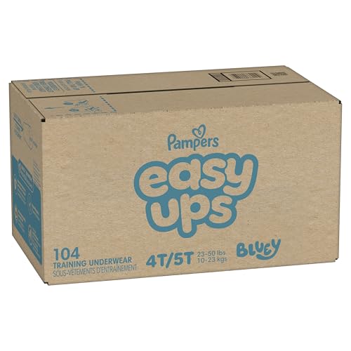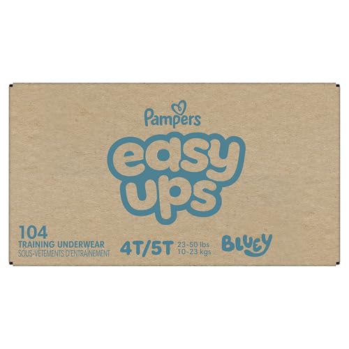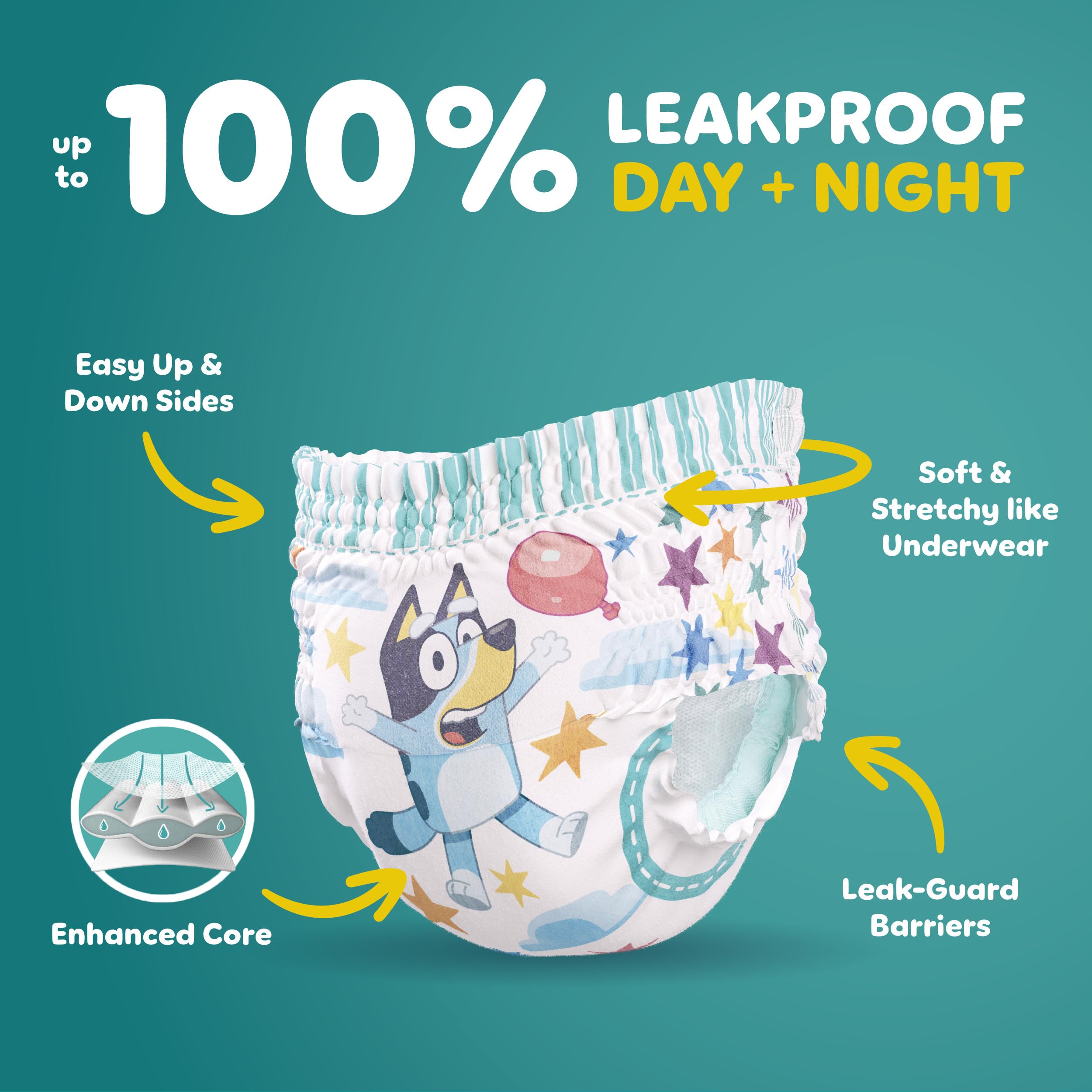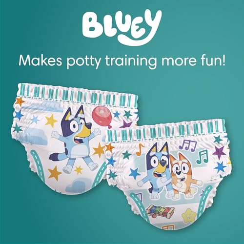 Ready to potty train with bluey? Pampers Easy Ups Training Pants featuring bluey makes it easy. They pair the feeling of real under wear with the protection of Pampers to make potty training easier for everyone. Give your child the confidence to take on potty training with a little more independence and a lot more fun. Easy Ups Training Pants feature stretchy sides and an underwear-like waistband for easy pull up and down, plus an ultra-absorbent core with LockAway Channel to help keep them dry day and night. With up to 2X better protection day and night*, Easy Ups training pants deliver up to 100% leakproof protection. These hypoallergenic, dermatologist-approved pull ups are made with 0% elemental chlorine, parabens, or latex** and backed by the Pampers Safety Promise. Fun Bluey designs motivate your toddler to potty train. Pampers Easy Ups training pants are also available with Peppa Pig! Pair with Pampers Sensitive Wipes to help keep your toddler's skin healthy. Find your toddler’s best fit in the following sizes: training pants 2T–3T (diaper size 4,15–34 lbs.), training pants 3T–4T (diaper size 5, 20–40 lbs.), training pants 4T–5T (diaper size 6, 23-50 lbs.), training pants 5T–6T (diaper size 7, 35–60 lbs.), training pants 6T–7T (diaper size 8, 46+ lbs.) *Urine leaks vs. leading competitor size 2T-3T ** No natural rubber †Pricing based on MSRP; excludes Easy Ups Jumbo. Pricing at the sole discretion of the retailer
