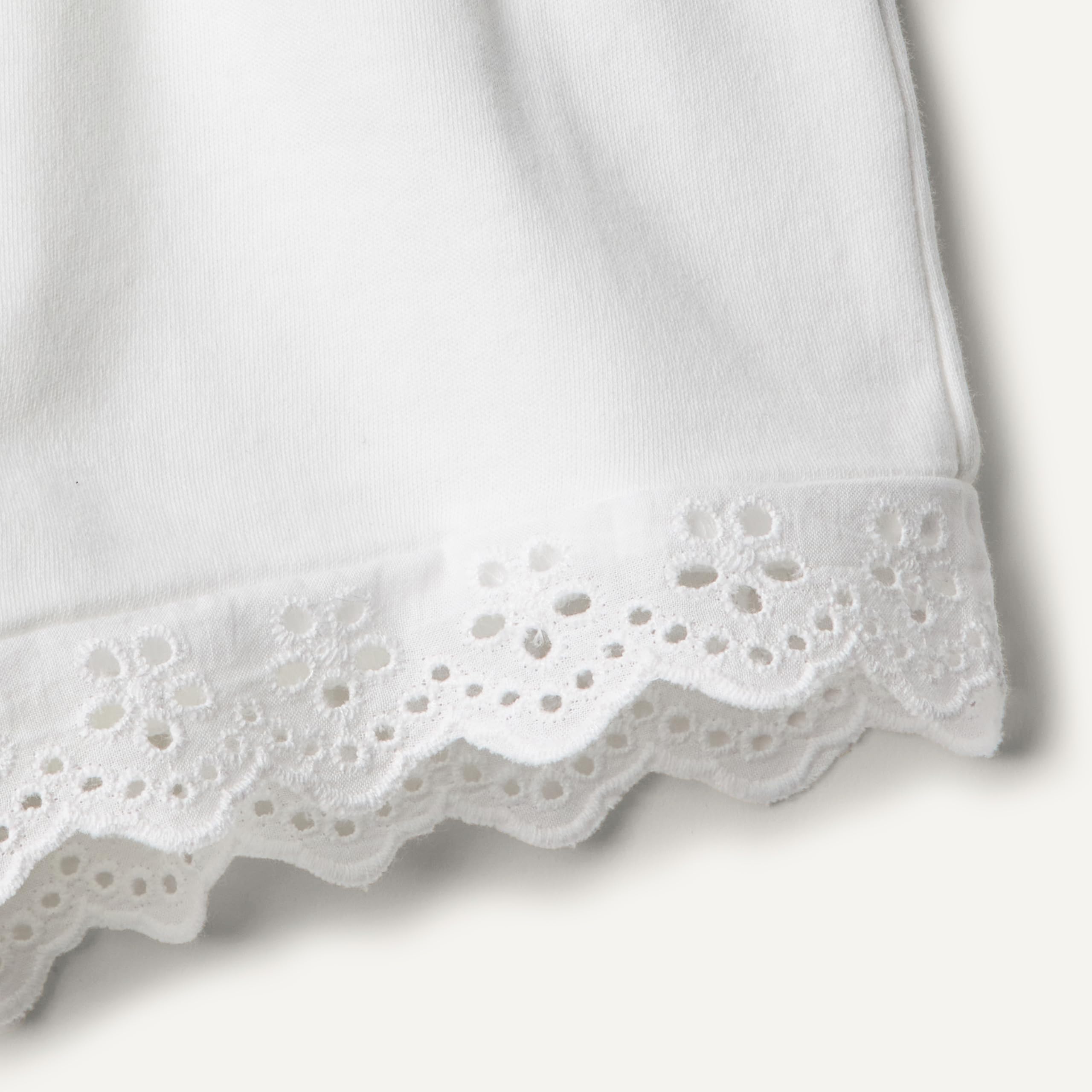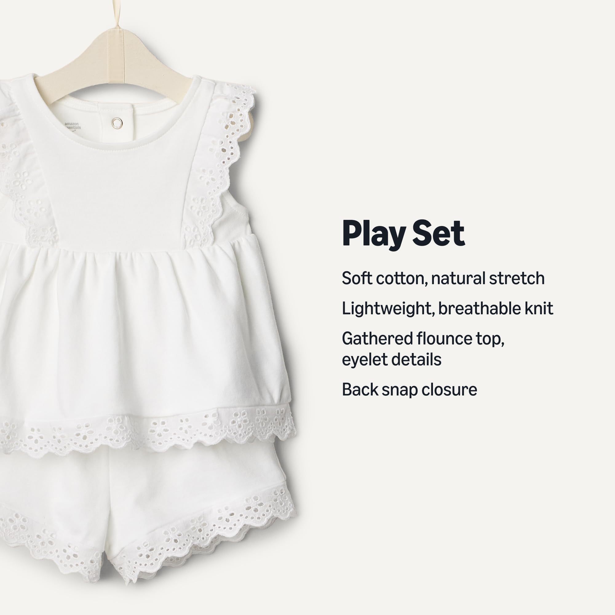 DETAILS: Gathered flounce top with elastic waist, back snap closure, and eyelet trim detail, shorts feature an elastic pull-on waistband and matching eyelet detail