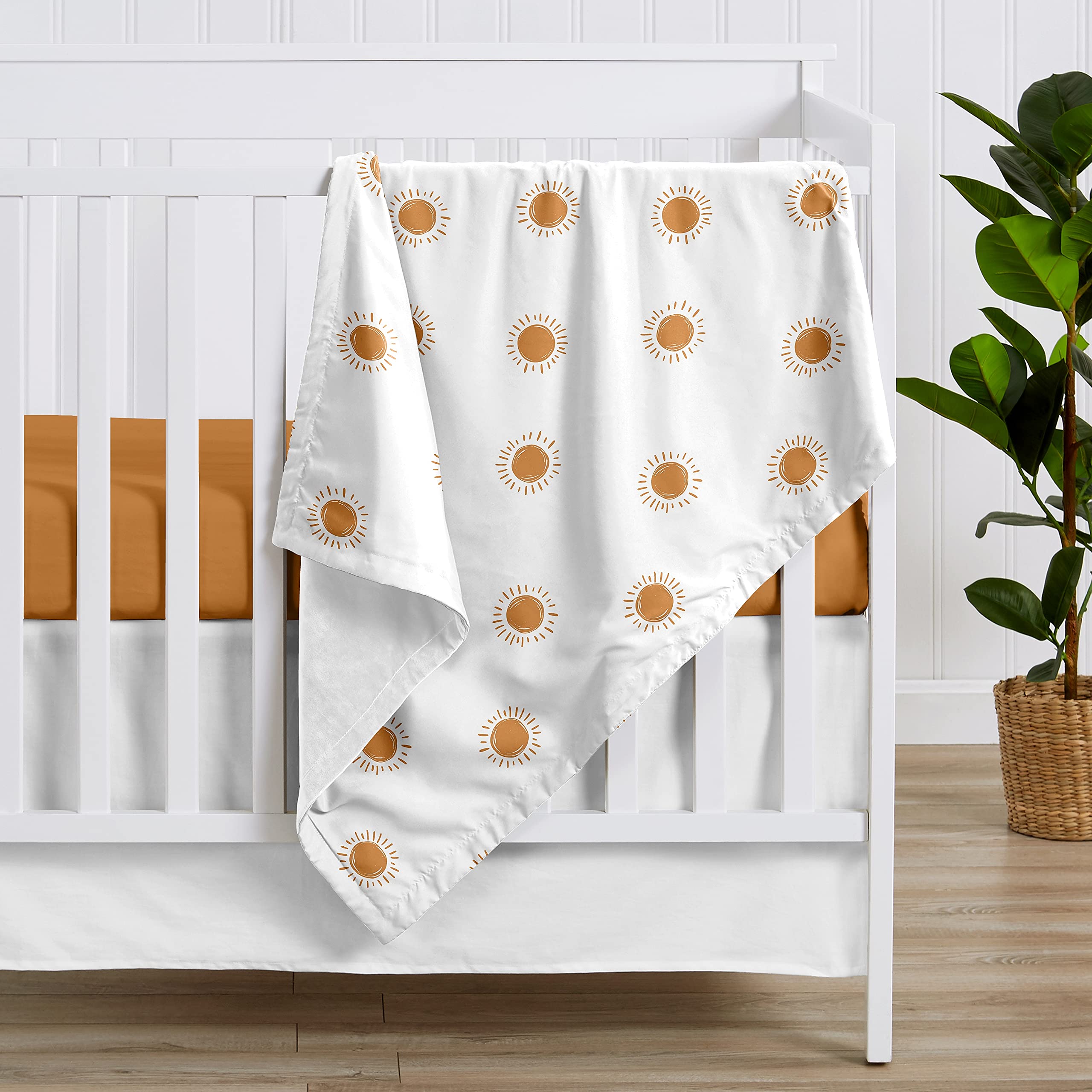 Blanket is designed using a pumpkin orange and white boho sun brushed microfiber print and reverses to soft white minky