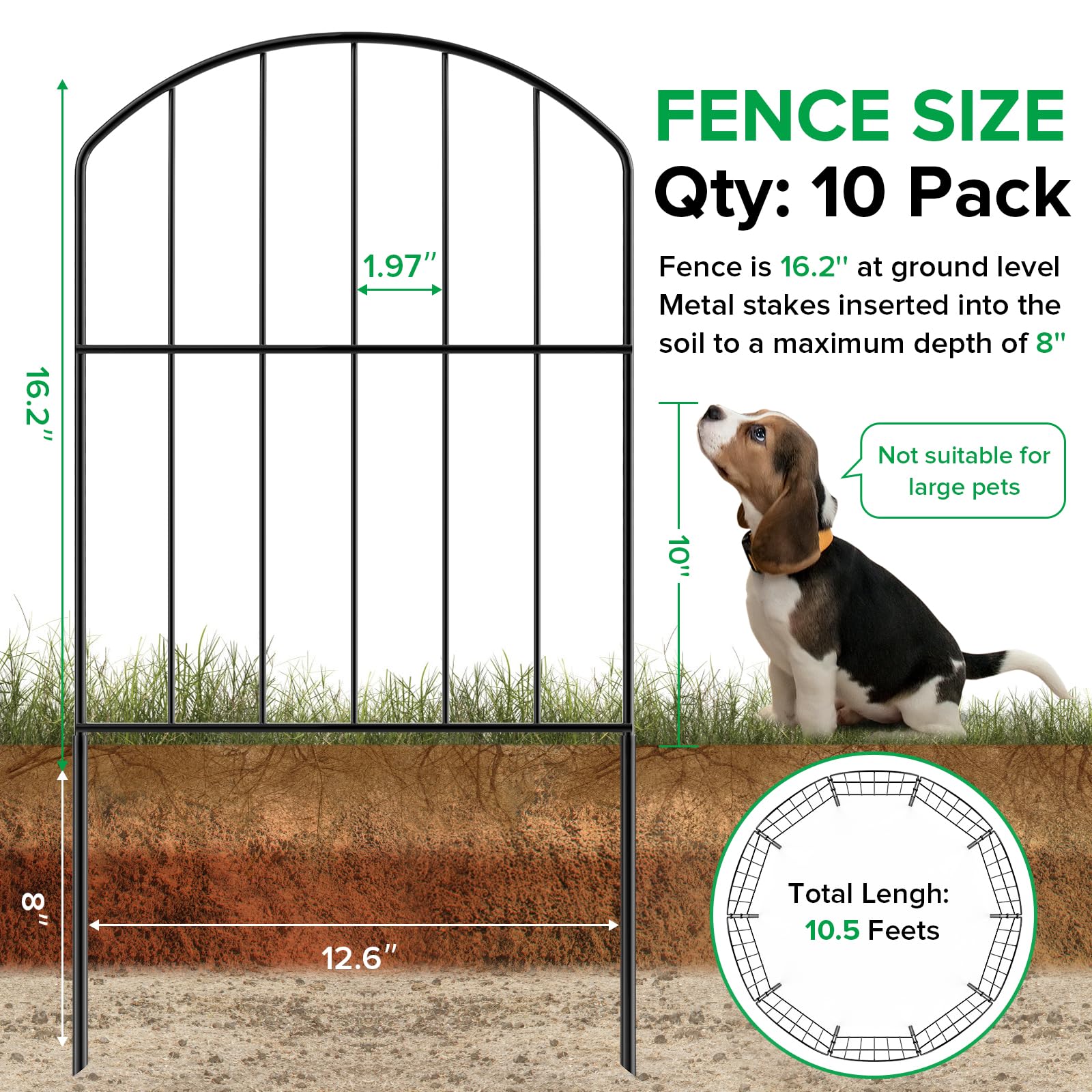 【Adjustable Size】Decorative Garden Fence's height is 24.2 inches (8 inches stakes in soil) , the width is 12.6 inches and the fence gap is 1.9 inches.