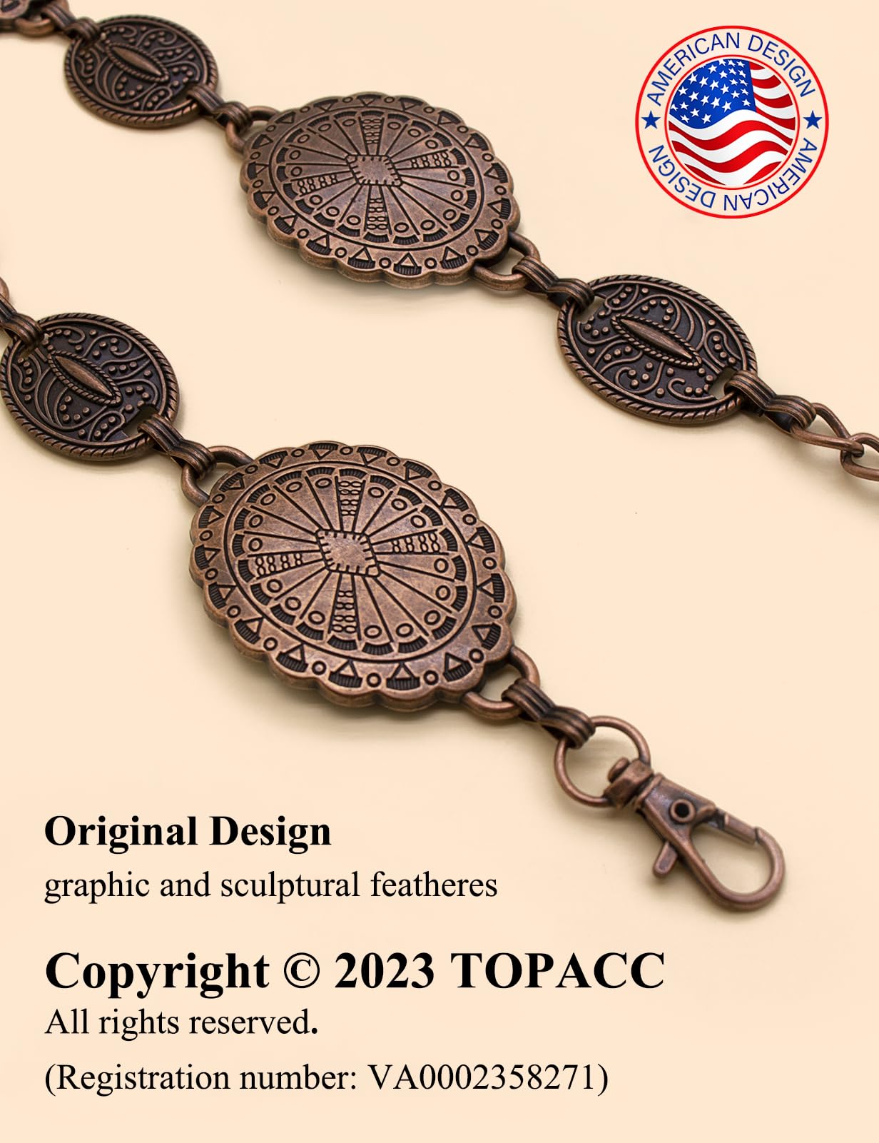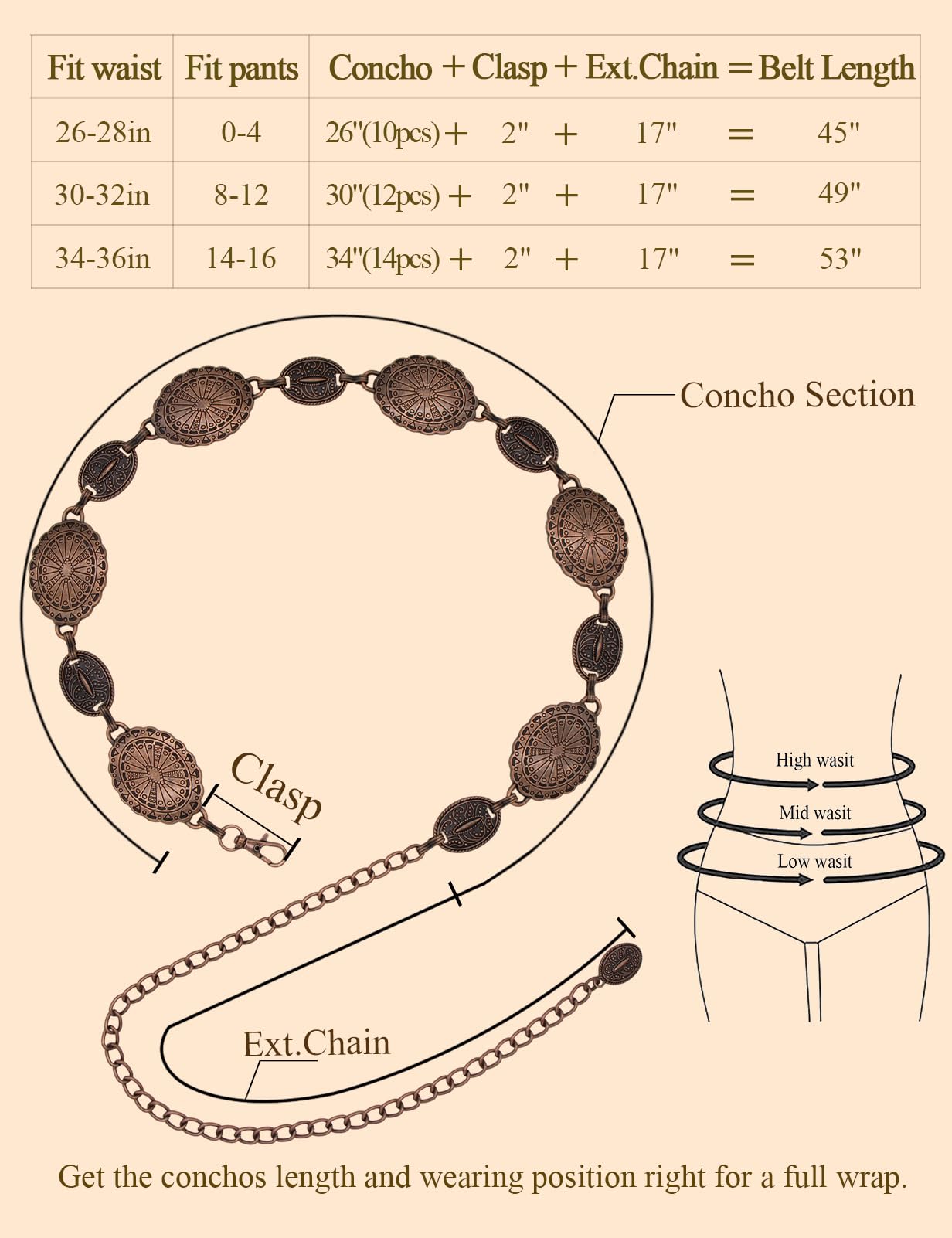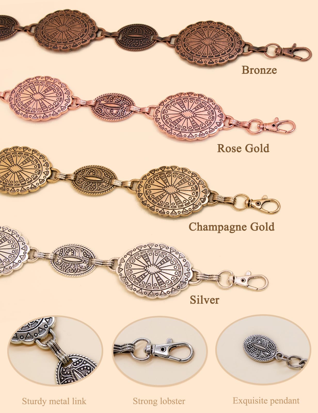 【STURDY AND DURABLE】 Western chain belts for women. This western belt is crafted from premium zinc alloy and finished with a 4-step electroplating process: copper plating → color plating → antiquing finish → oil sealing for color protection. Boasting far superior color retention compared to standard plating processes under normal use, it perfectly balances substantial metal weight with comfortable wear for a premium look and feel.