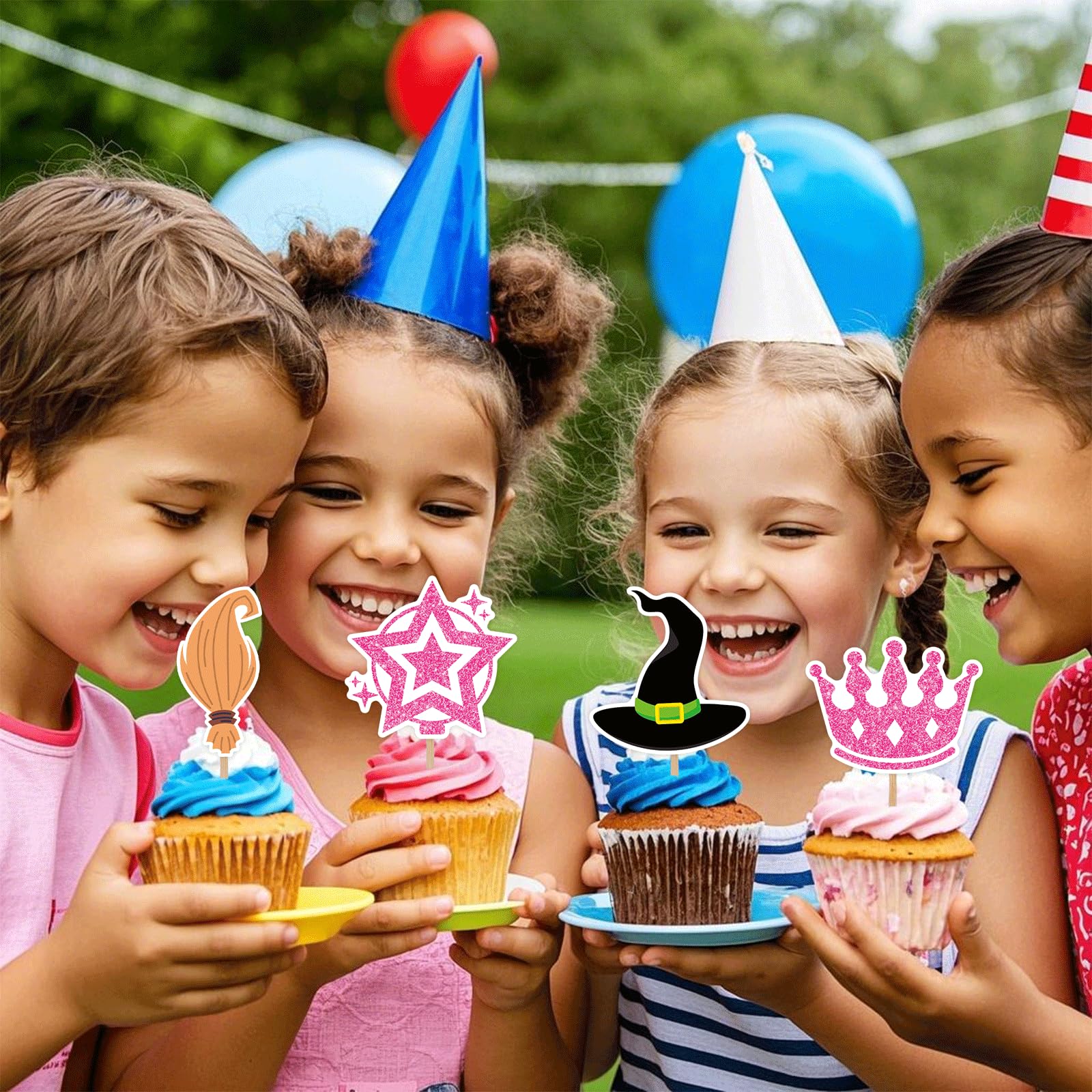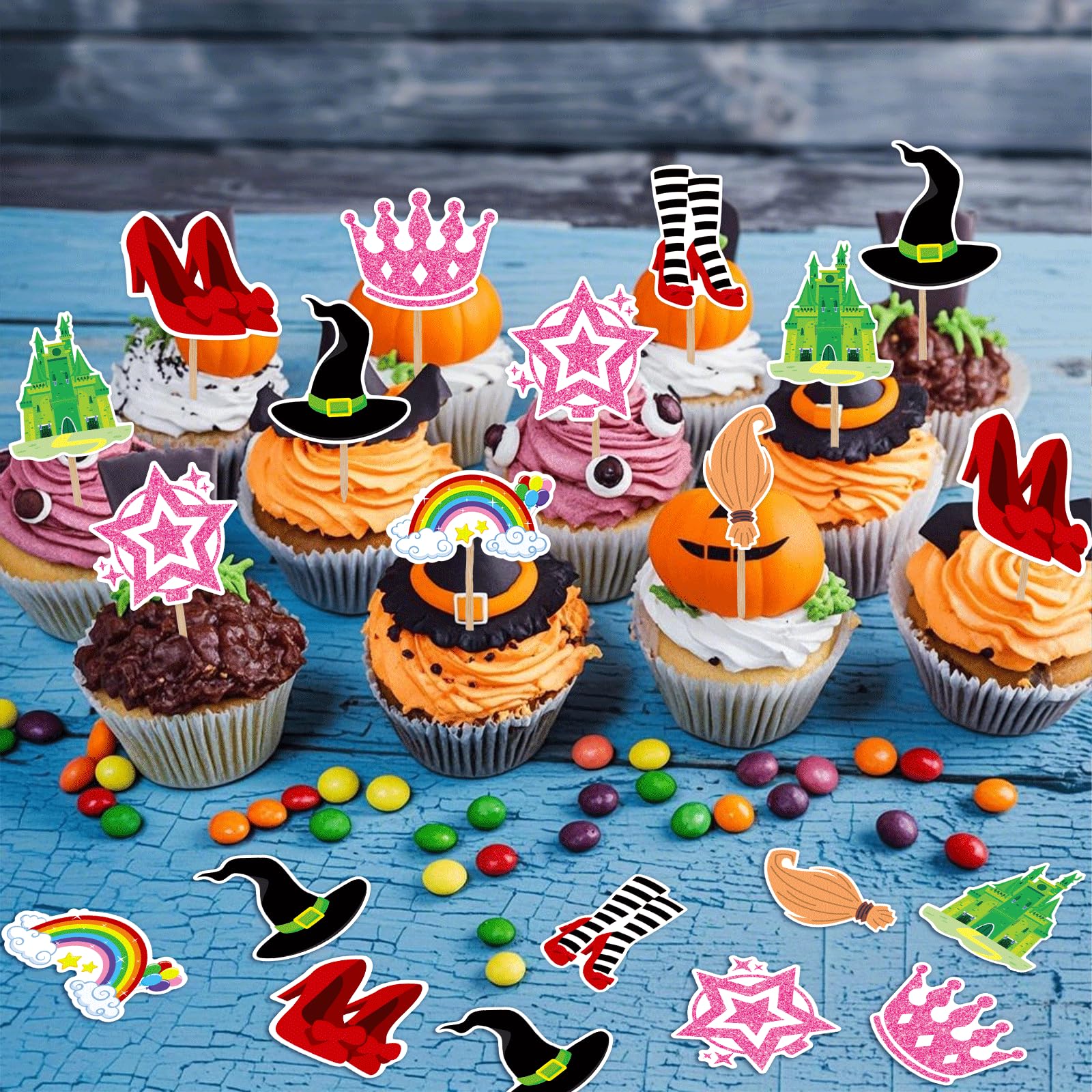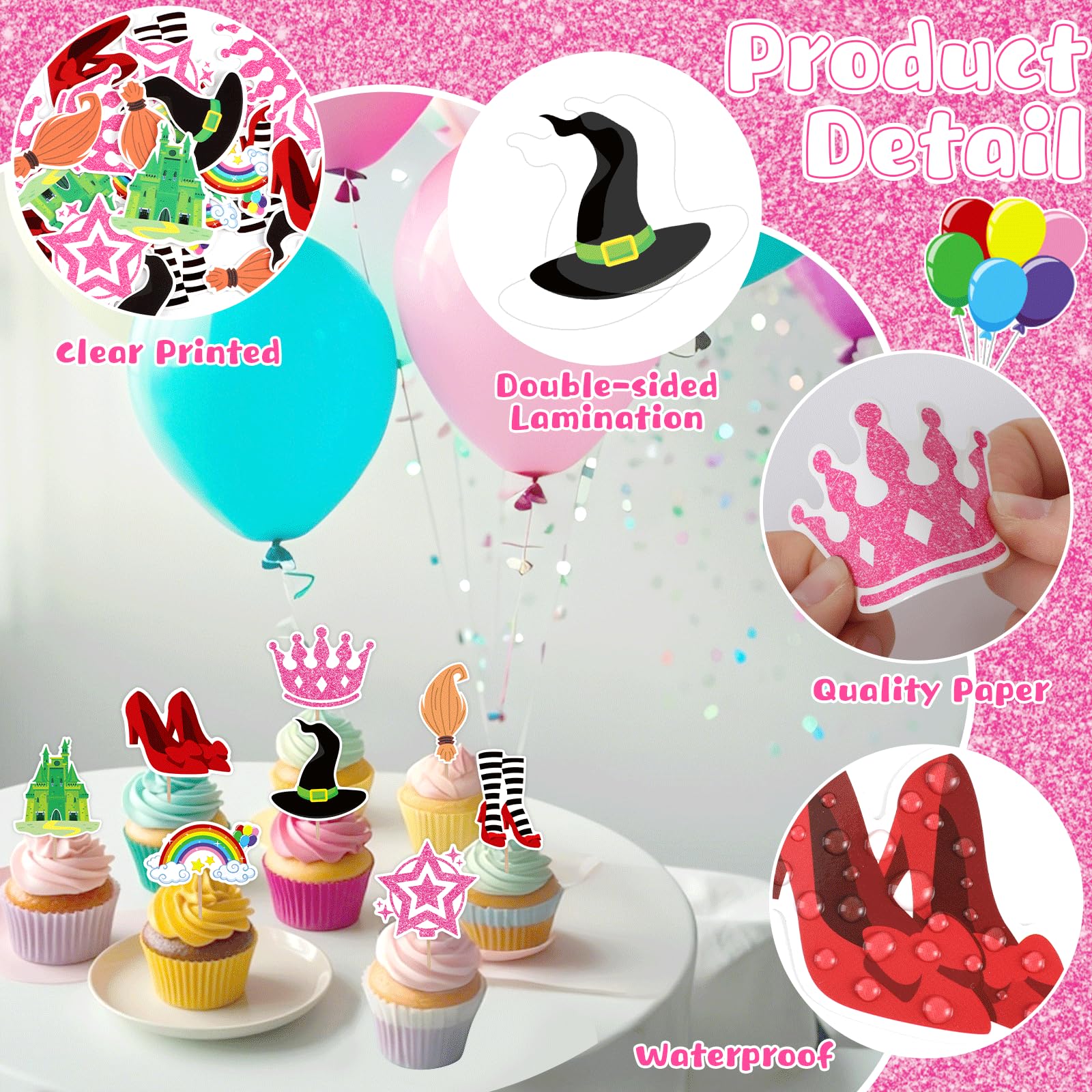 Attractive Design: The pink and green cupcake picks feature classic elements from the iconic witch movie, including a sparkly pink crown, black witch’s hat with a green band, rustic broomstick, and glittery pink starburst. These whimsical designs bring the beloved witch universe to life, making them a fun addition to your party.