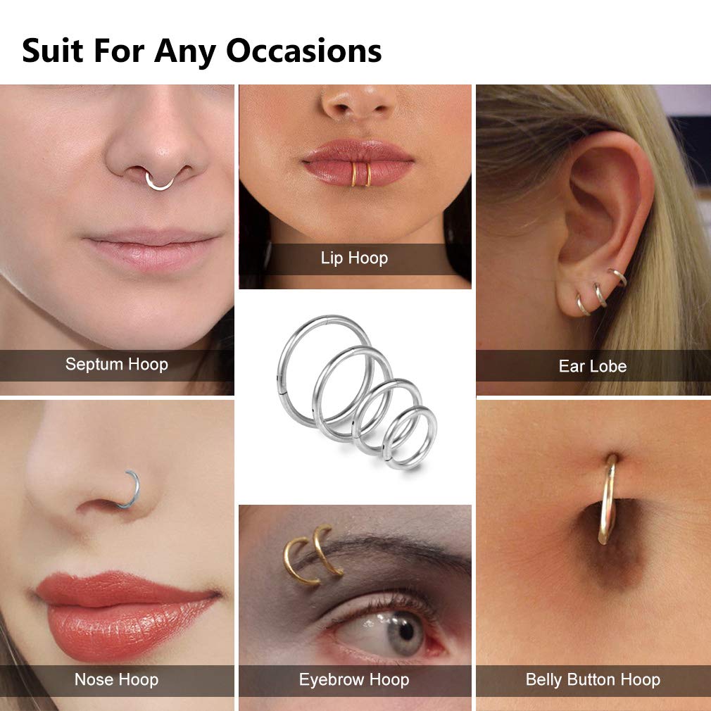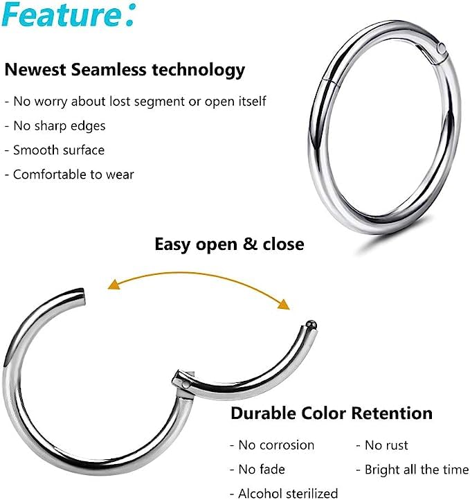 【Newest Seamless technology】The septum clicker made by the upgratest seamless technology,almost undetectable seam and perfect hinged clicker.Easy open,no sharp edges,comfortable to wear and no more worrying about sharp edges hurt your skin or open itself no reason.