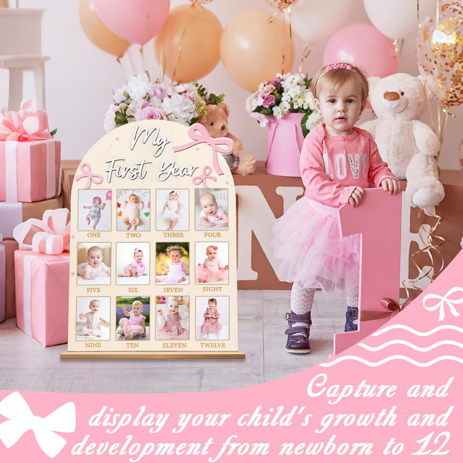 Memorable photo display: The pink bow first year photo board showcase the journey of your little one's first year in a visual timeline with these photo centerpieces, offering a nostalgic and heartwarming display that captures the growth and milestones of your child. Ideal for other pink bow-themed events, baby showers, baby shower gifts, children's first birthday gifts, expecting mother gifts, new parents gifts, Mother's Day gifts, or even as keepsakes.