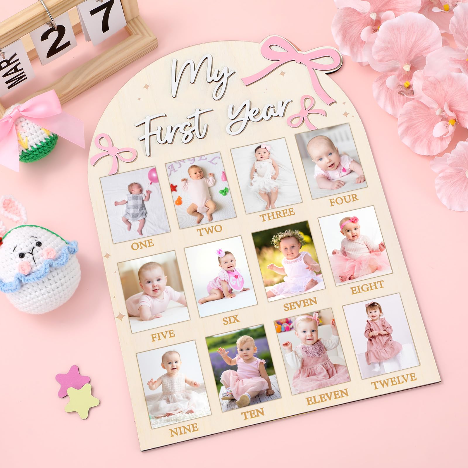 Package includes: You’ll get 1pc of pink bow first year photo board measuring 16.9 x 12 x 0.2inches, suitable for 2.4 x 3 inches photos. Our pink bow birthday wooden board is the ideal keepsake to capture your baby's first year. This 12 monthly milestone picture frame is ideal for displaying cherished photos from each month, creating a beautiful memory of your child's growth and milestones.