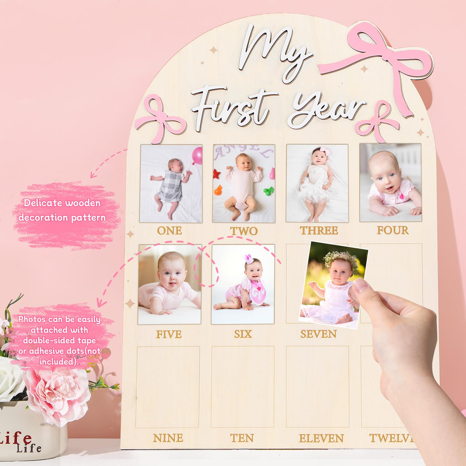 Delicate pink bow design: Our first-year photo board keepsake decorations feature a warm and meaningful design to capture your baby's precious moments. The board has a soft arch shape, adorned with a pink bow and "My First Year" in elegant lettering, adding sweetness and charm. It includes twelve labeled sections from "ONE" to "TWELVE" for each month. Both a practical record and a decorative keepsake, it’s great for displaying at home to cherish your baby's growth journey.